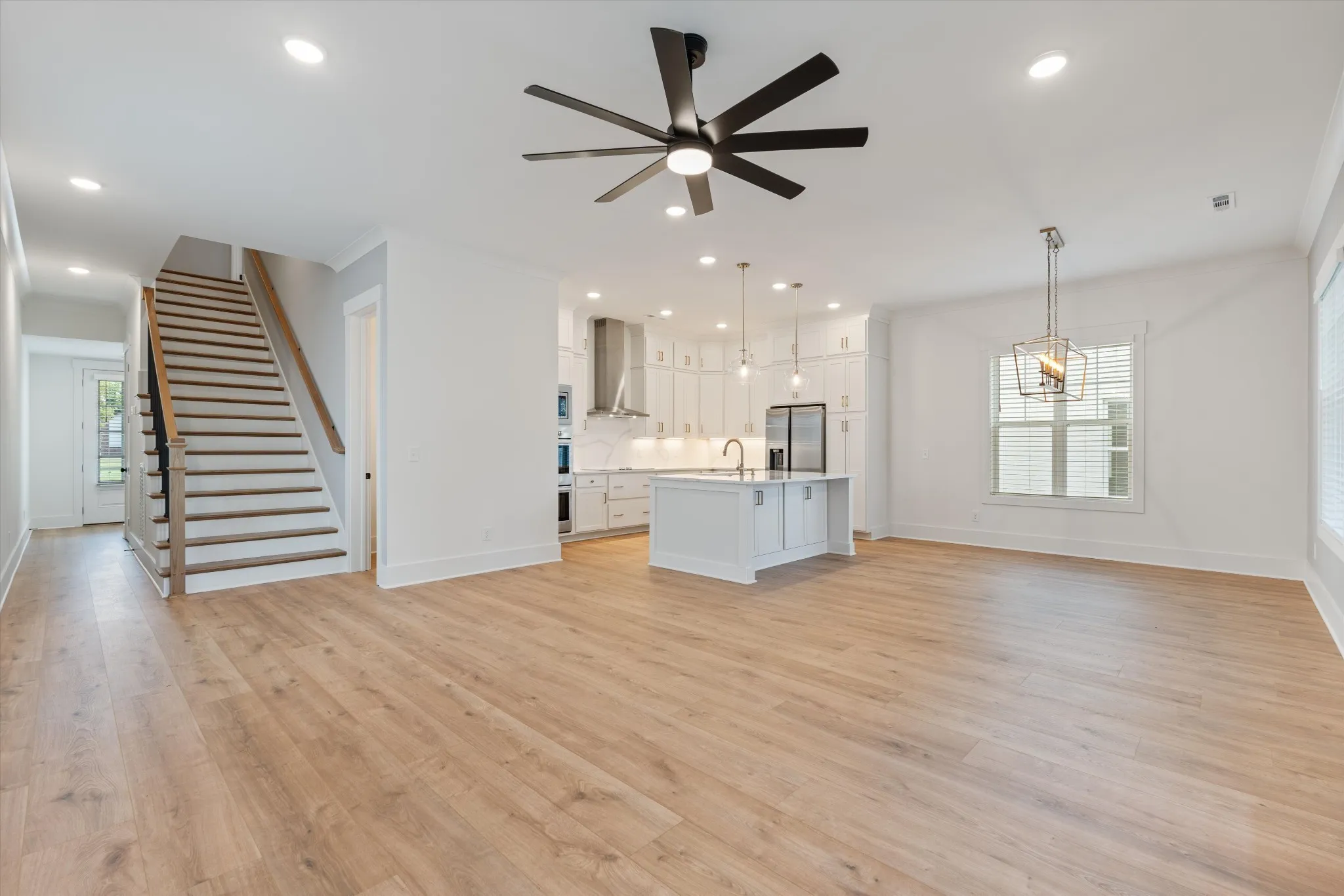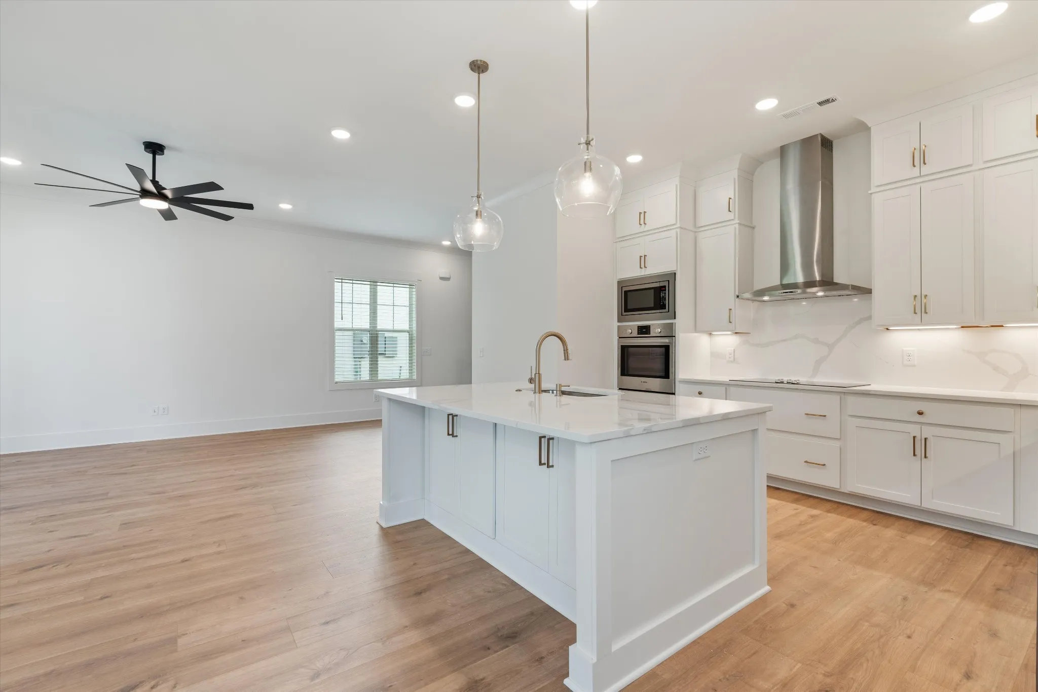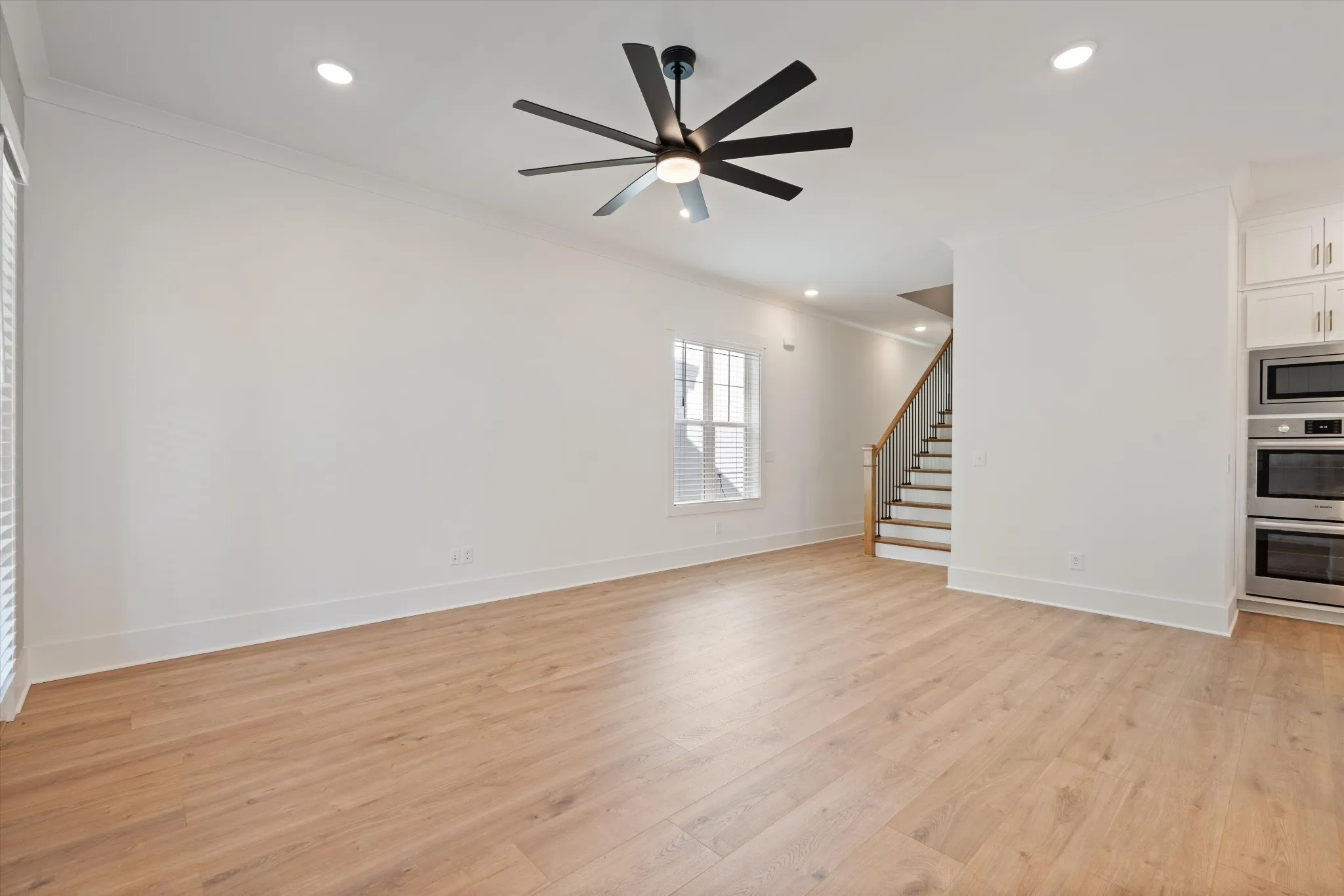 The kitchen is designed for entertaining, with cabinetry extending to the ceiling and a luxury Bosch appliance package, including a double oven. A counter-depth refrigerator, washer and dryer, and window blinds are all included.