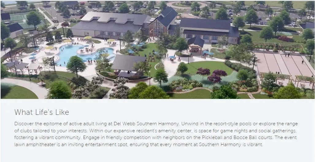 "LongDescription" => "Artist's rendering of upcoming Amenity Center: Indoor Pool, Hot Tub, Fitness Center, Catering Kitchen, Pickleball, Bocce Ball, Pond, Arboretum, Amphitheater, Veteran's Memorial Park, Outdoor Dining Pavillion, Firepit, Walking Paths, and more!"