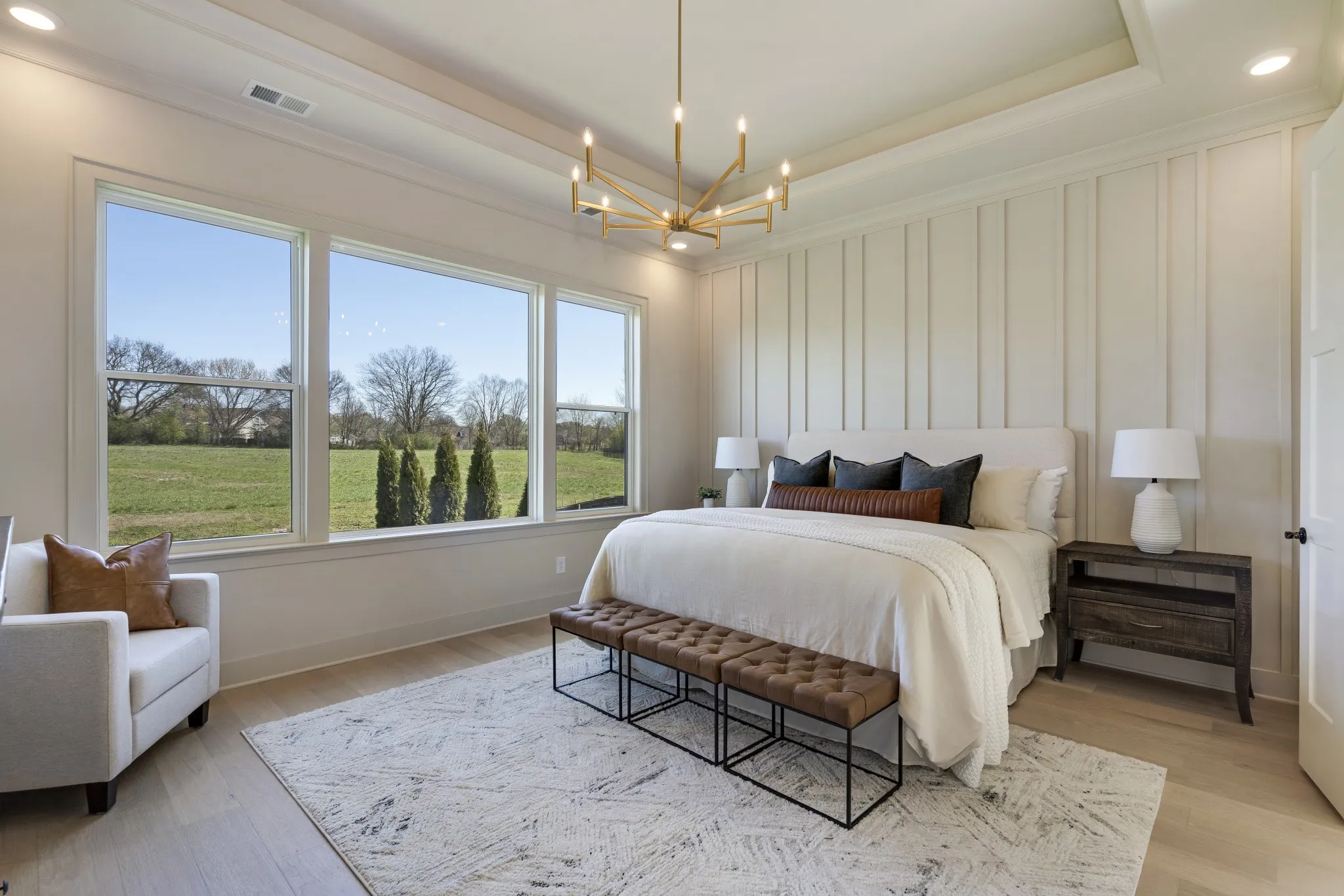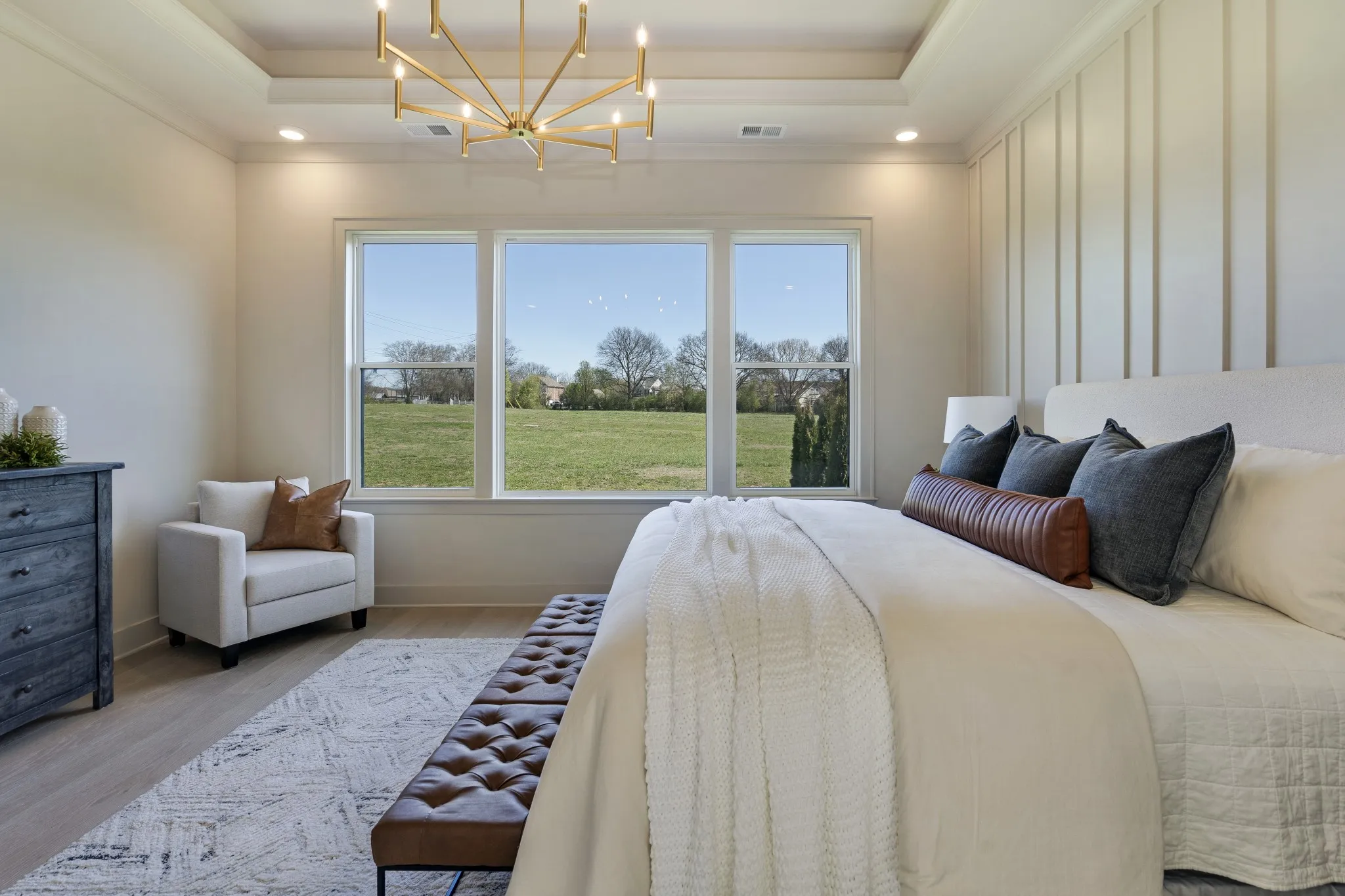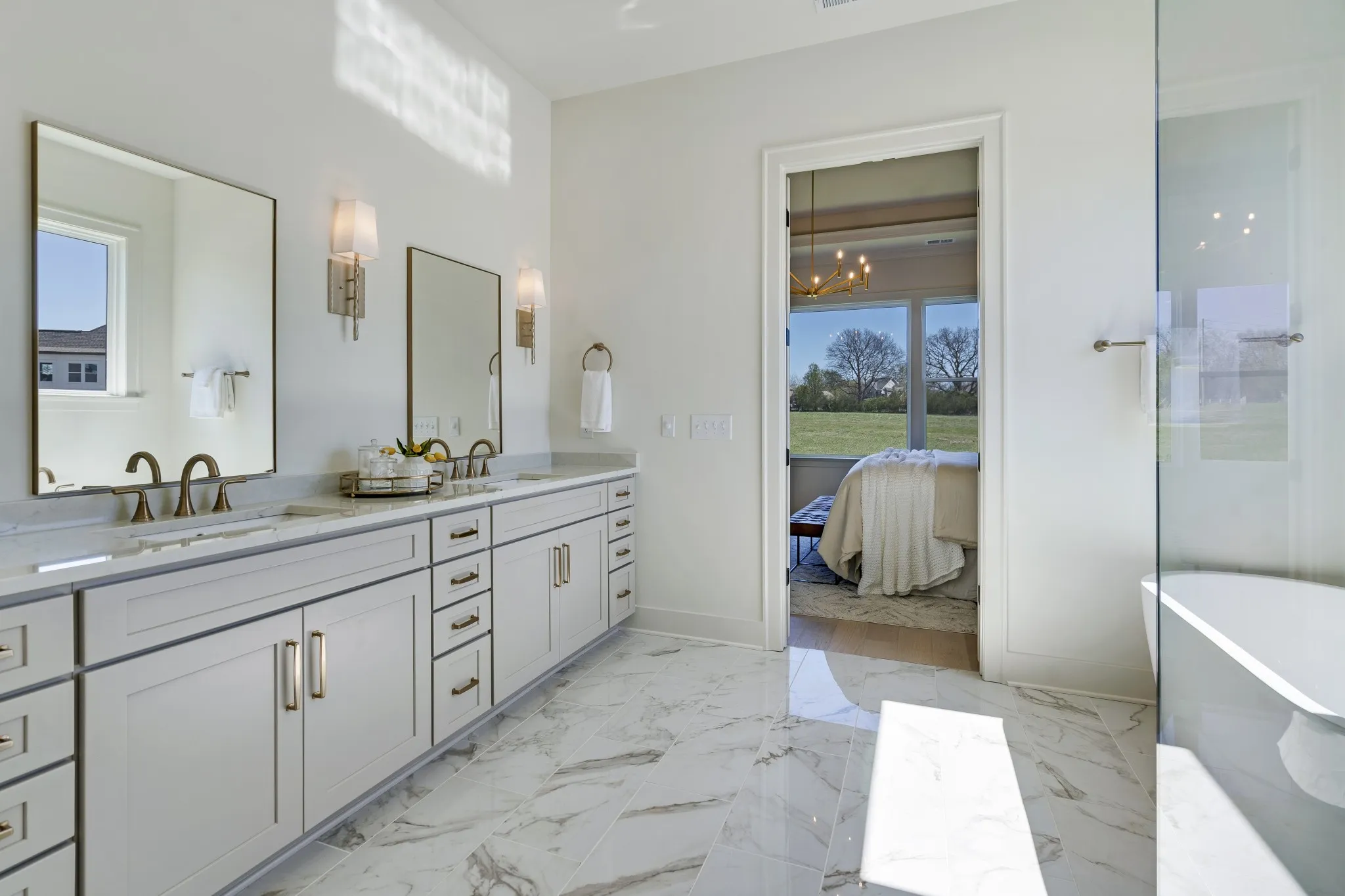 The main-level primary suite offers a serene retreat with tray ceiling and designer accent wall, complemented by a spa-inspired bath with dual vanities, freestanding soaking tub, expansive walk-in shower, and custom closet with separated hanging areas.