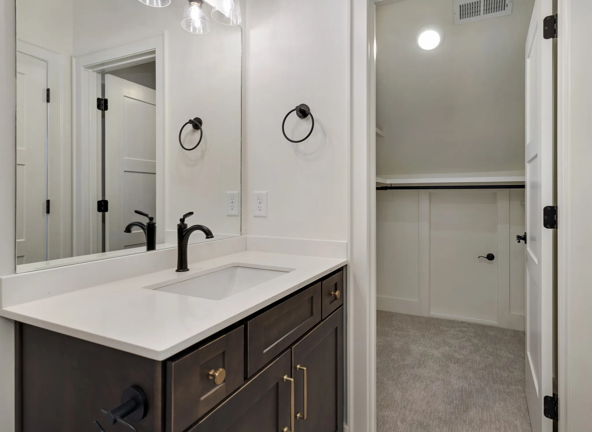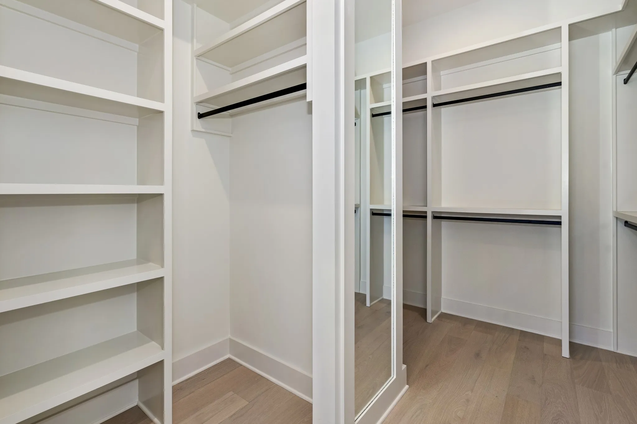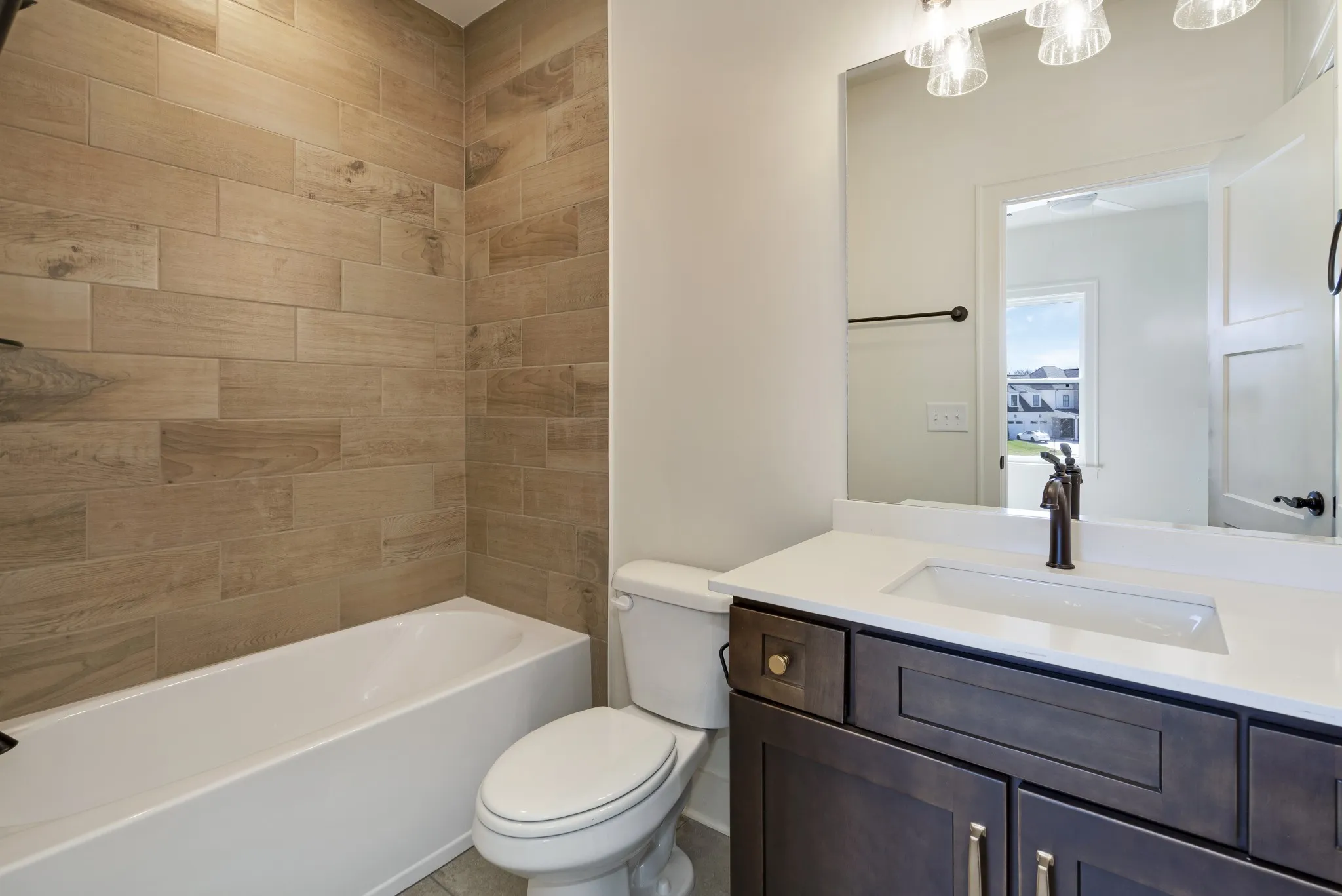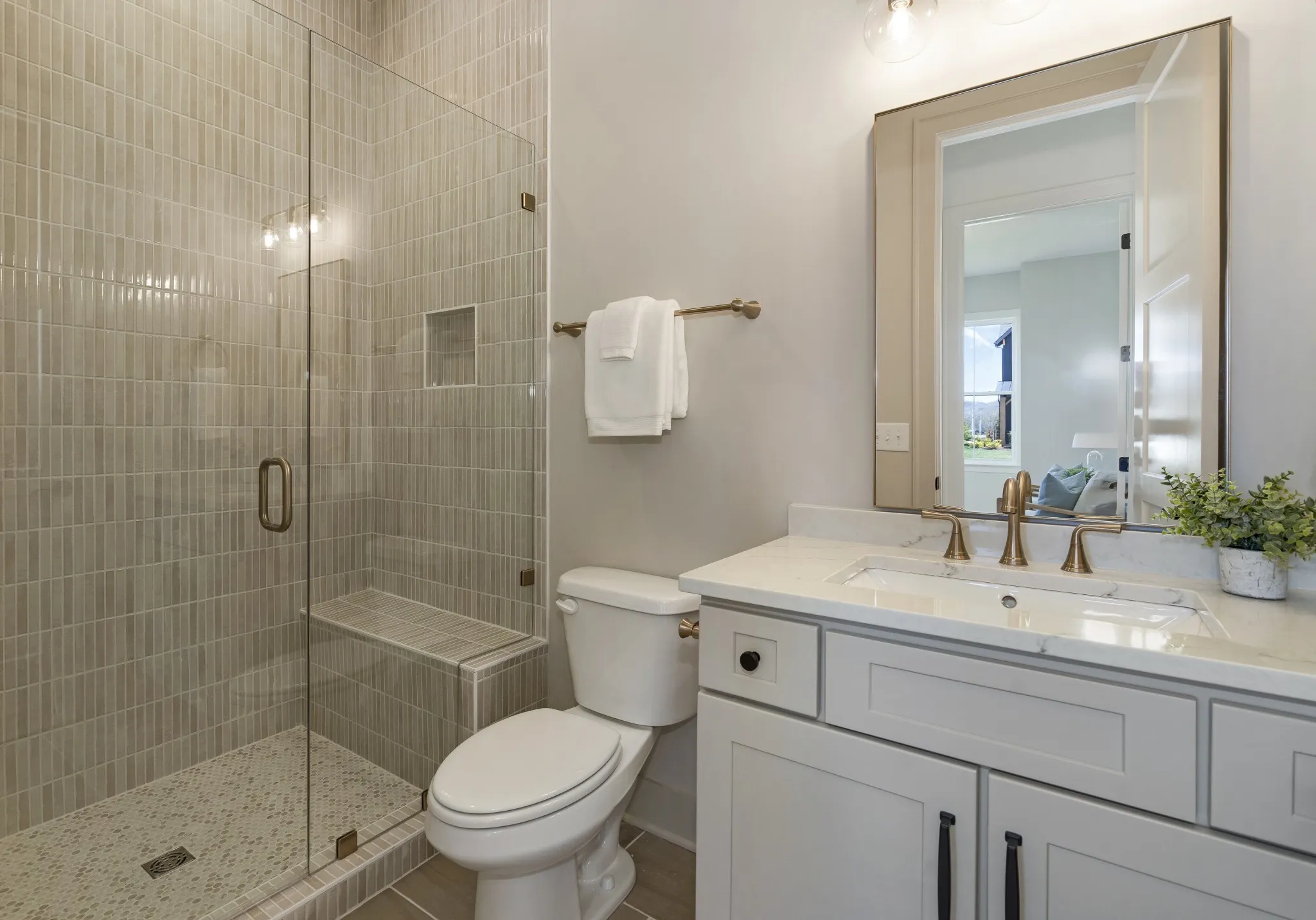 The main-level primary suite offers a serene retreat with tray ceiling and designer accent wall, complemented by a spa-inspired bath with dual vanities, freestanding soaking tub, expansive walk-in shower, and custom closet with separated hanging areas.