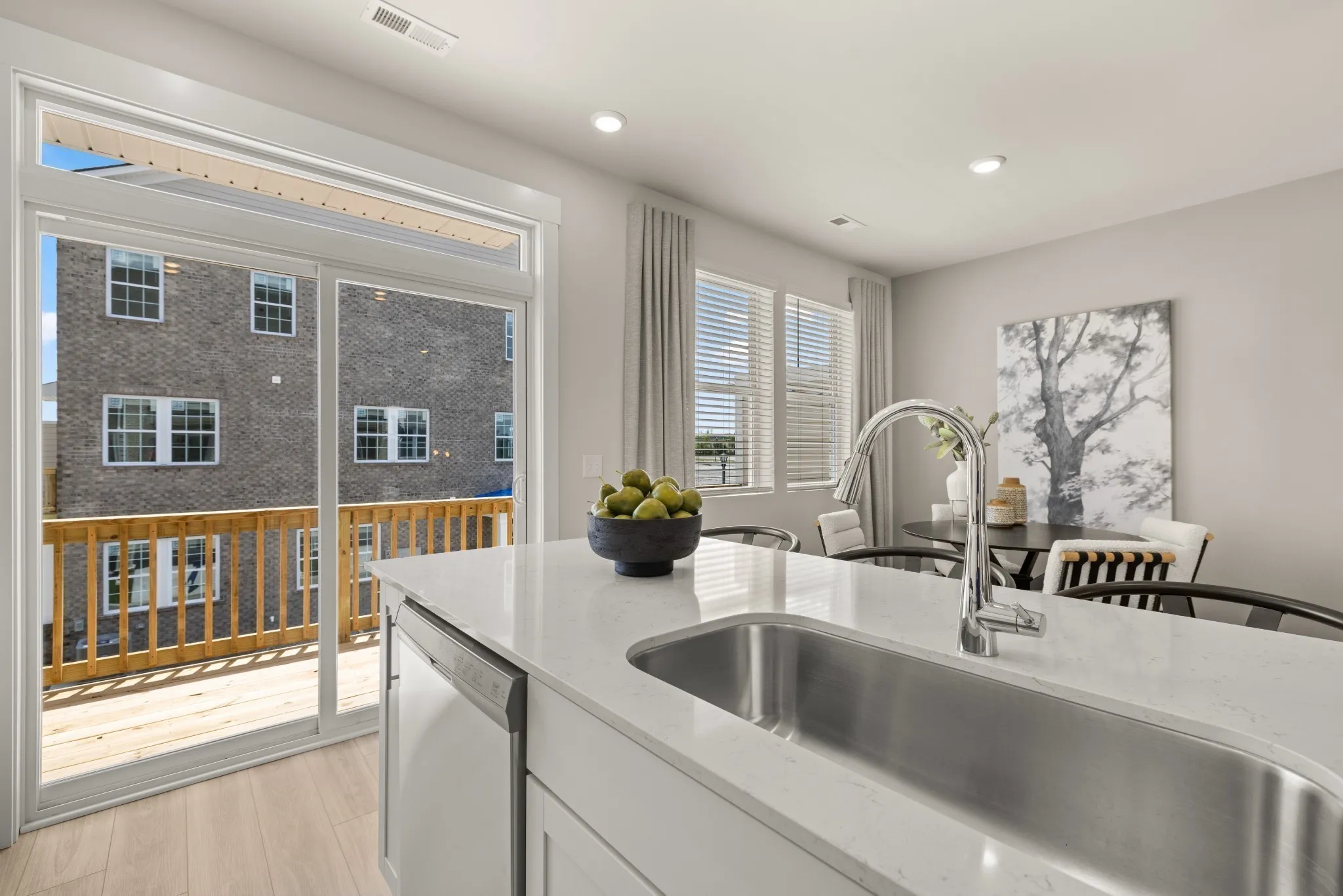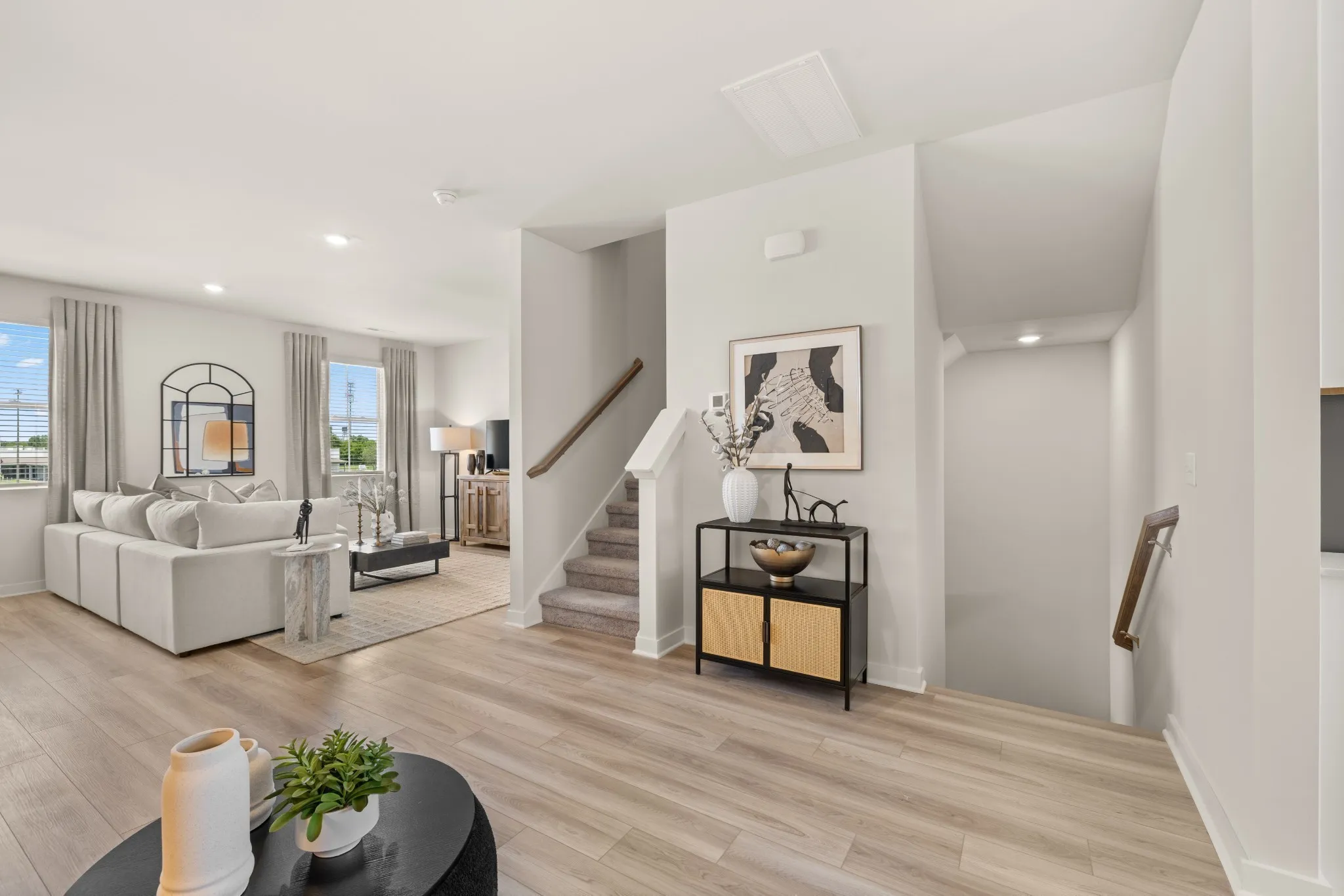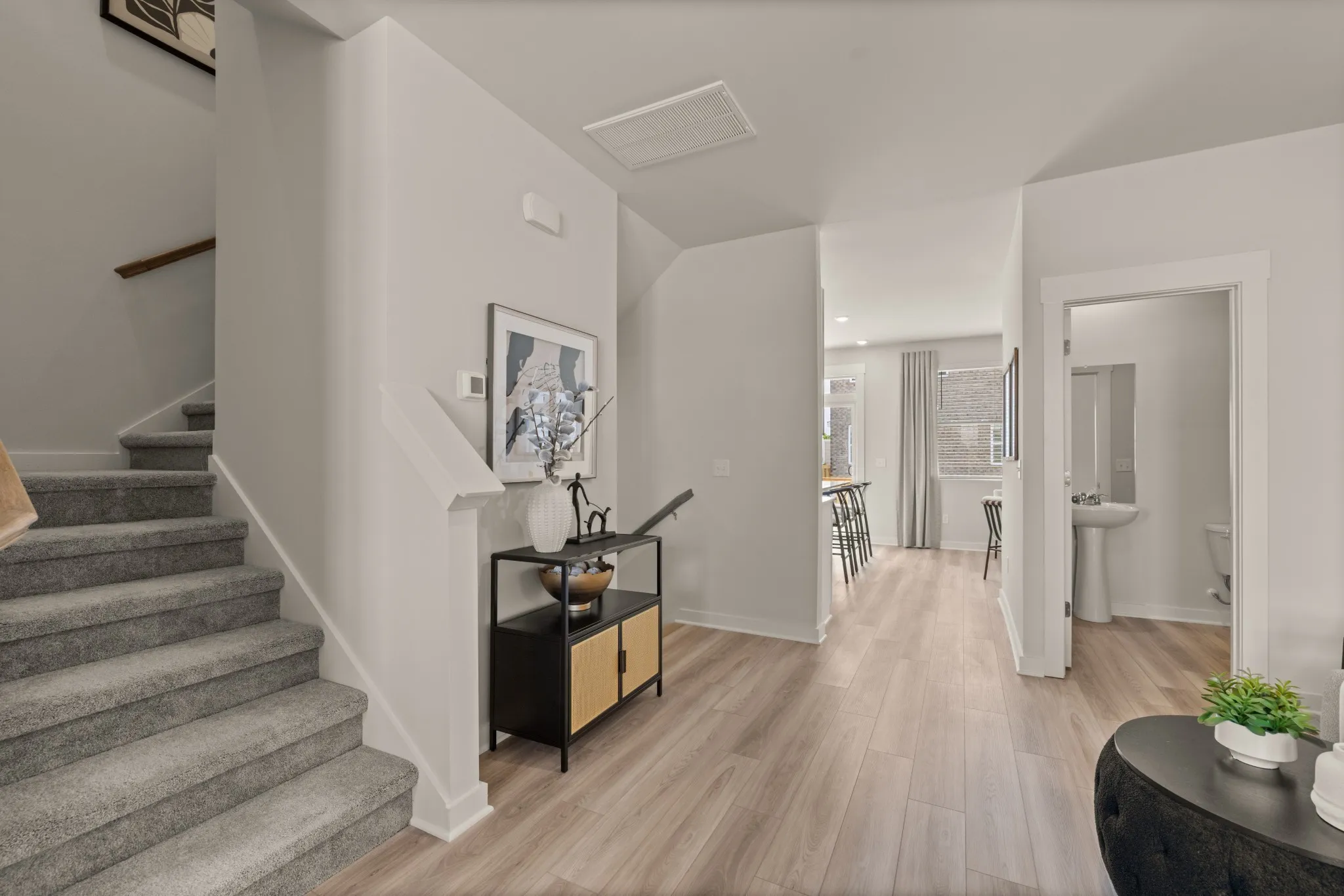 LOT #1047 – Westbrook floorplan. This new three-story townhome features a free-flowing layout that emphasizes functionality and practicality. Upon entry is a versatile bedroom suite to accommodate family members or overnight guests, while upstairs is the main living area. It includes a sprawling Great Room made for gatherings, a cozy loft that can double as an office space and a well-equipped kitchen with an adjoining nook. Residing on the top floor are the remaining bedrooms, one of which is the tranquil owner’s suite with an attached bathroom. *Images from a furnished model of this home. Actual configuration and features may vary.