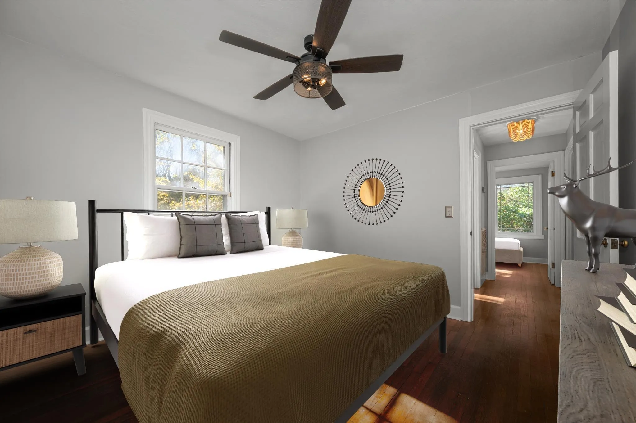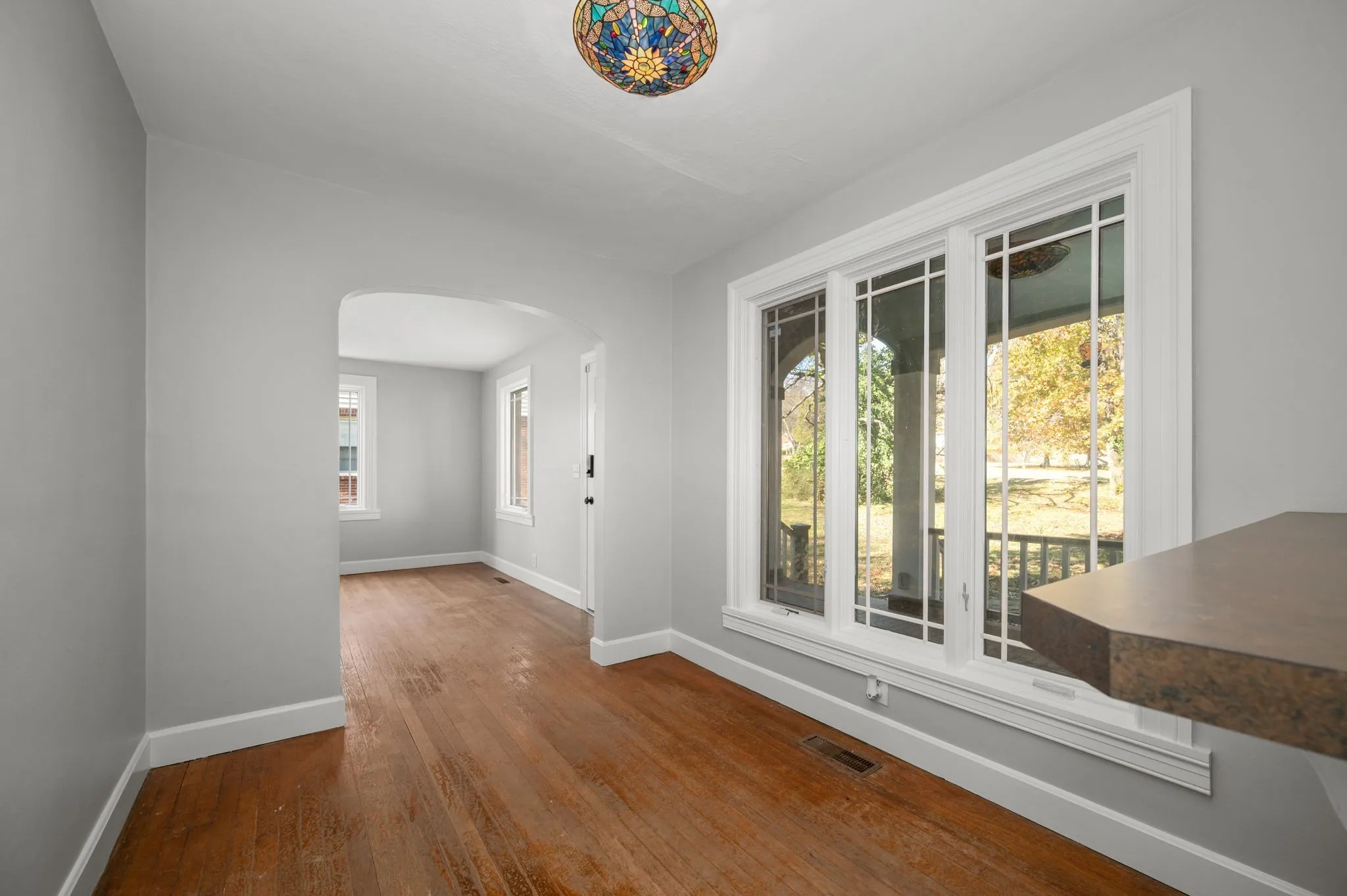 Inside, you’ll find original hardwood floors and solid wood doors that highlight the home’s character, paired with modern updates for today’s lifestyle. The kitchen has been refreshed with updated finishes, appliances, and ample cabinet space, while both bathrooms have been tastefully updated as well. Fresh interior paint and newer windows throughout bring in plenty of natural light, creating a bright and cheerful atmosphere.