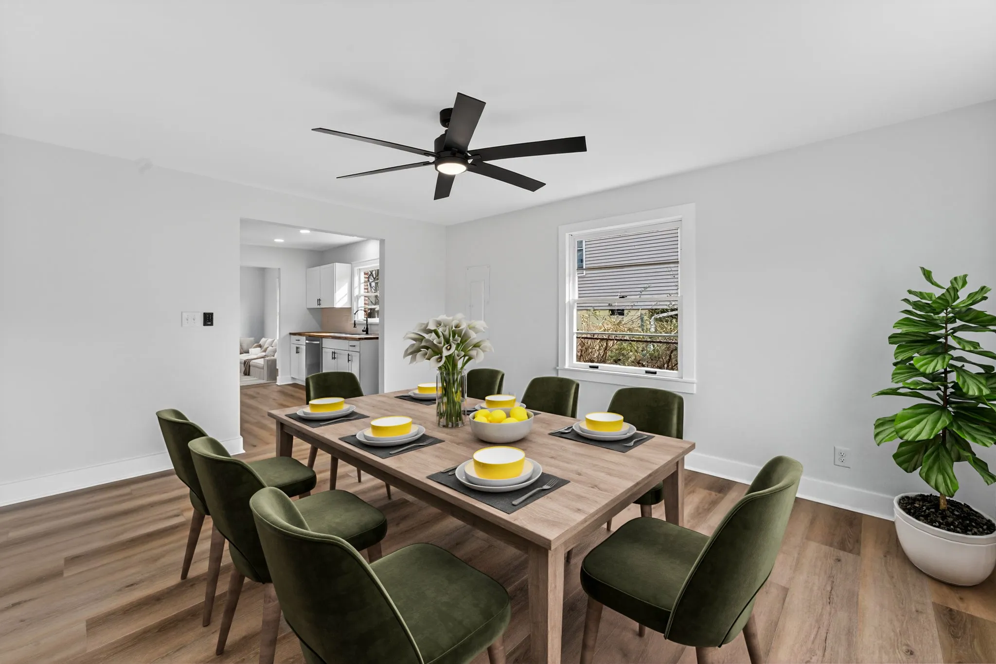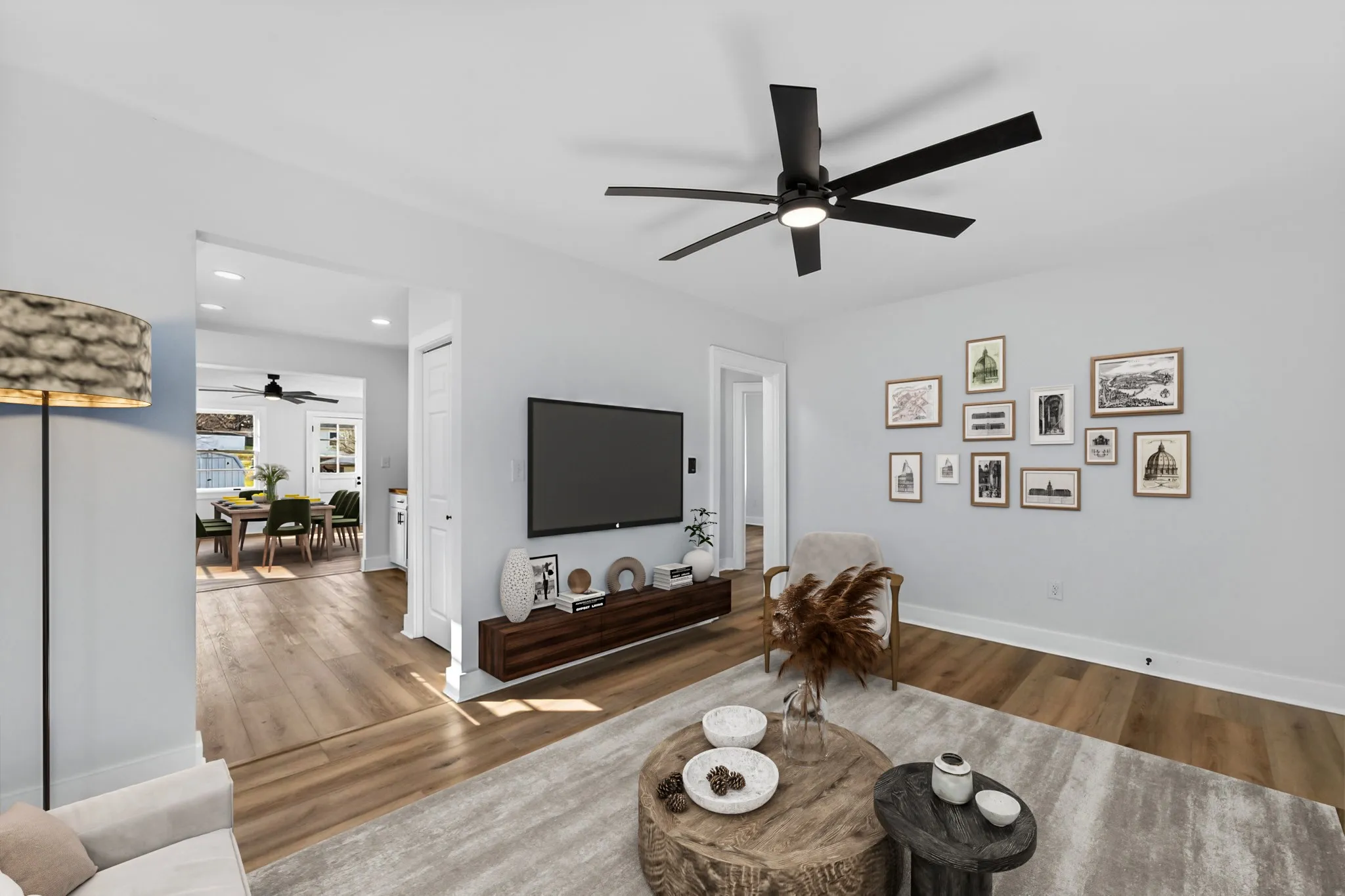 Natural light fills the main living room, creating a welcoming space for slow mornings, movie nights, or gathering with friends. The kitchen has been completely updated with shaker-style cabinetry, butcher block countertops, tile backsplash, and brand-new stainless appliances — blending modern finishes with warmth and character. Just off the kitchen, a separate dining room or den gives you flexibility for family dinners, a playroom, or a cozy second living space.