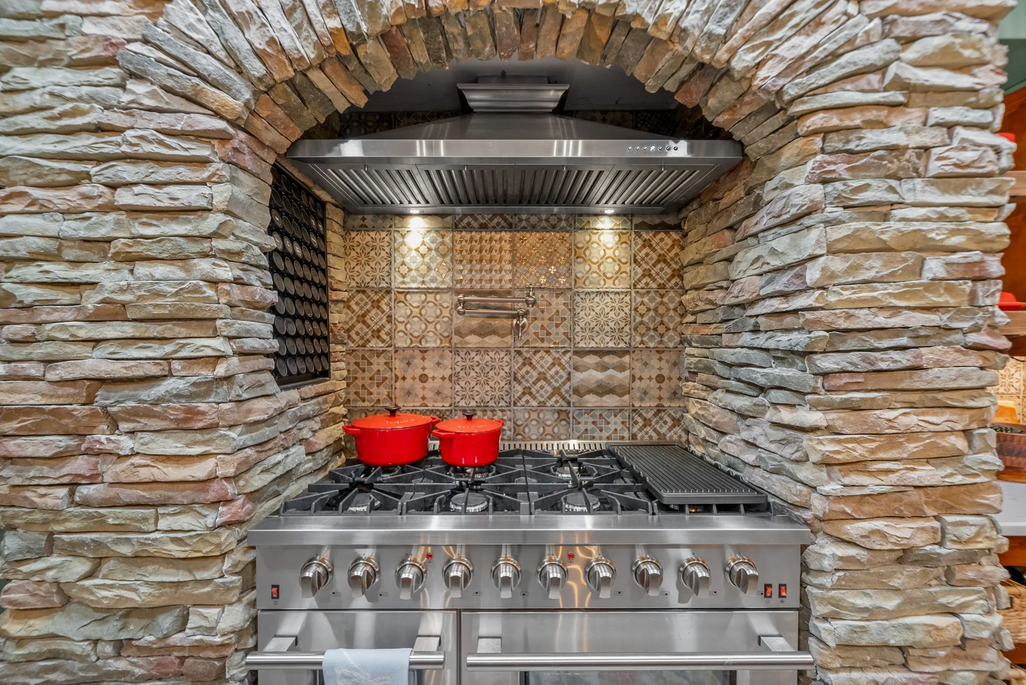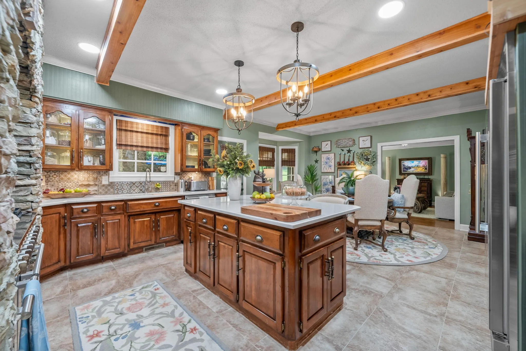 Inside, nearly 3,900 square feet of living space showcases new flooring, custom stone and tile work, all-new hardware, fixtures, and designer lighting. The gourmet kitchen is a true showpiece, featuring commercial-grade appliances, an 8-burner gas range, double ovens, and premium finishes designed for both beauty and performance.