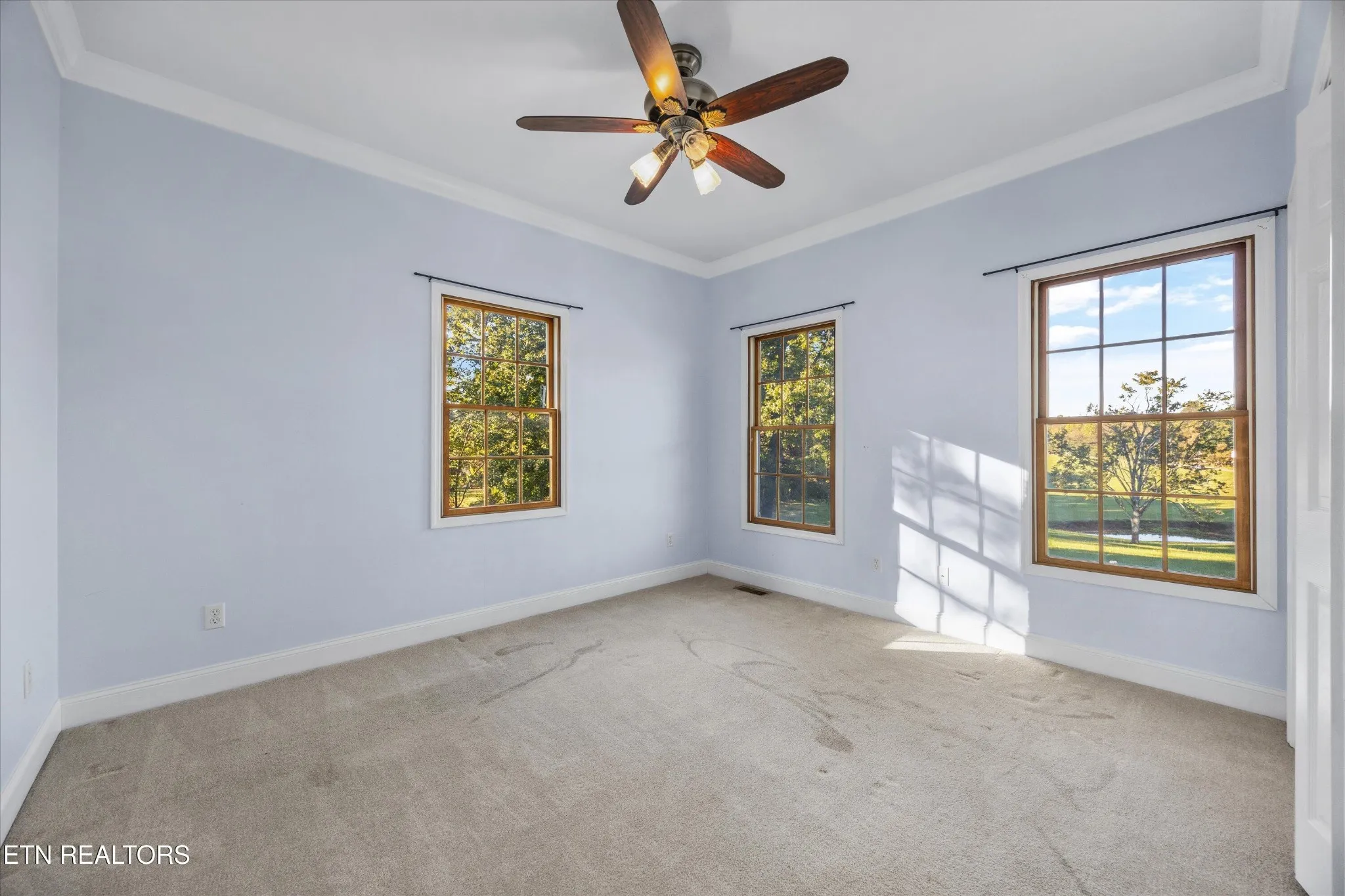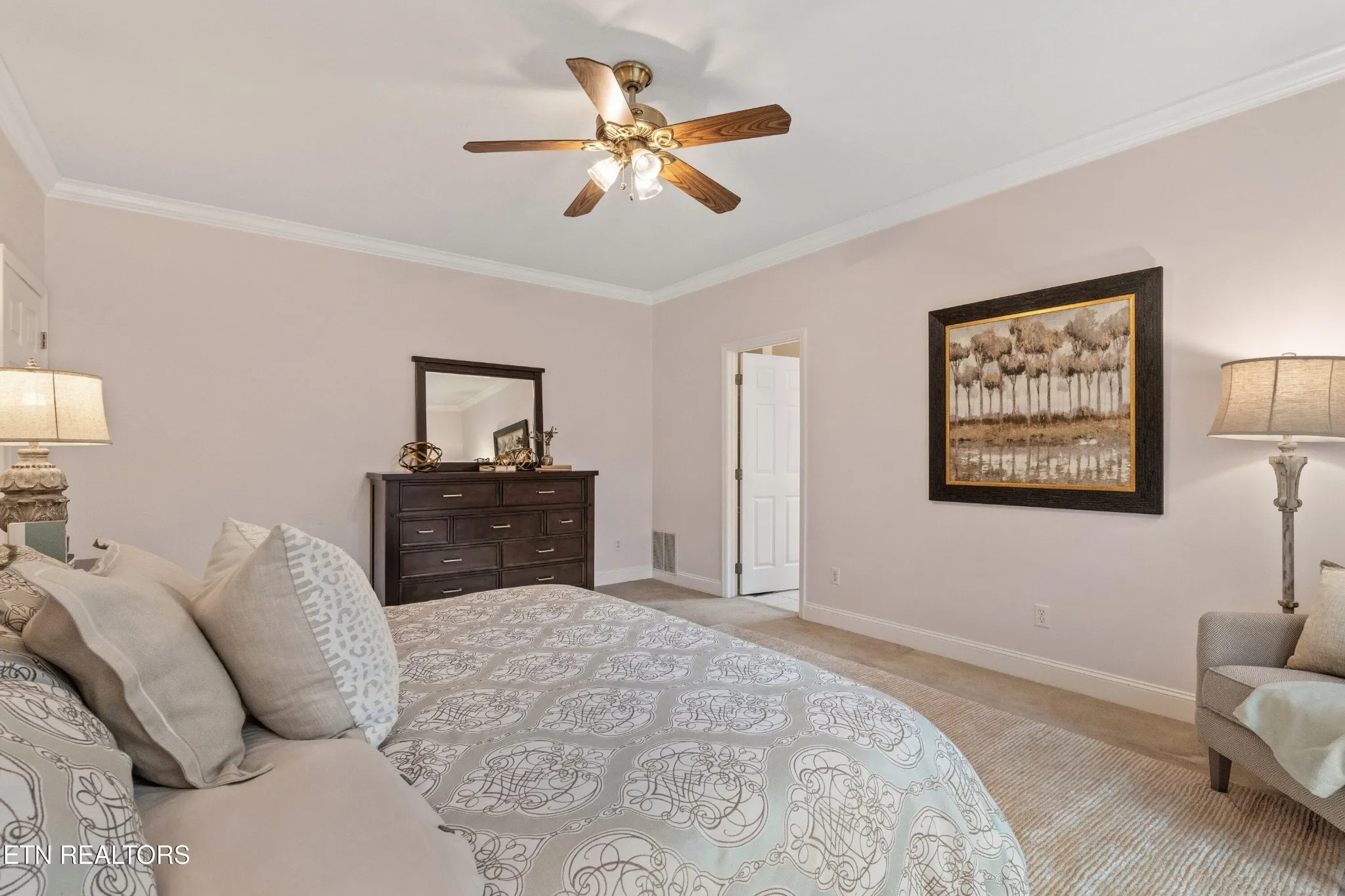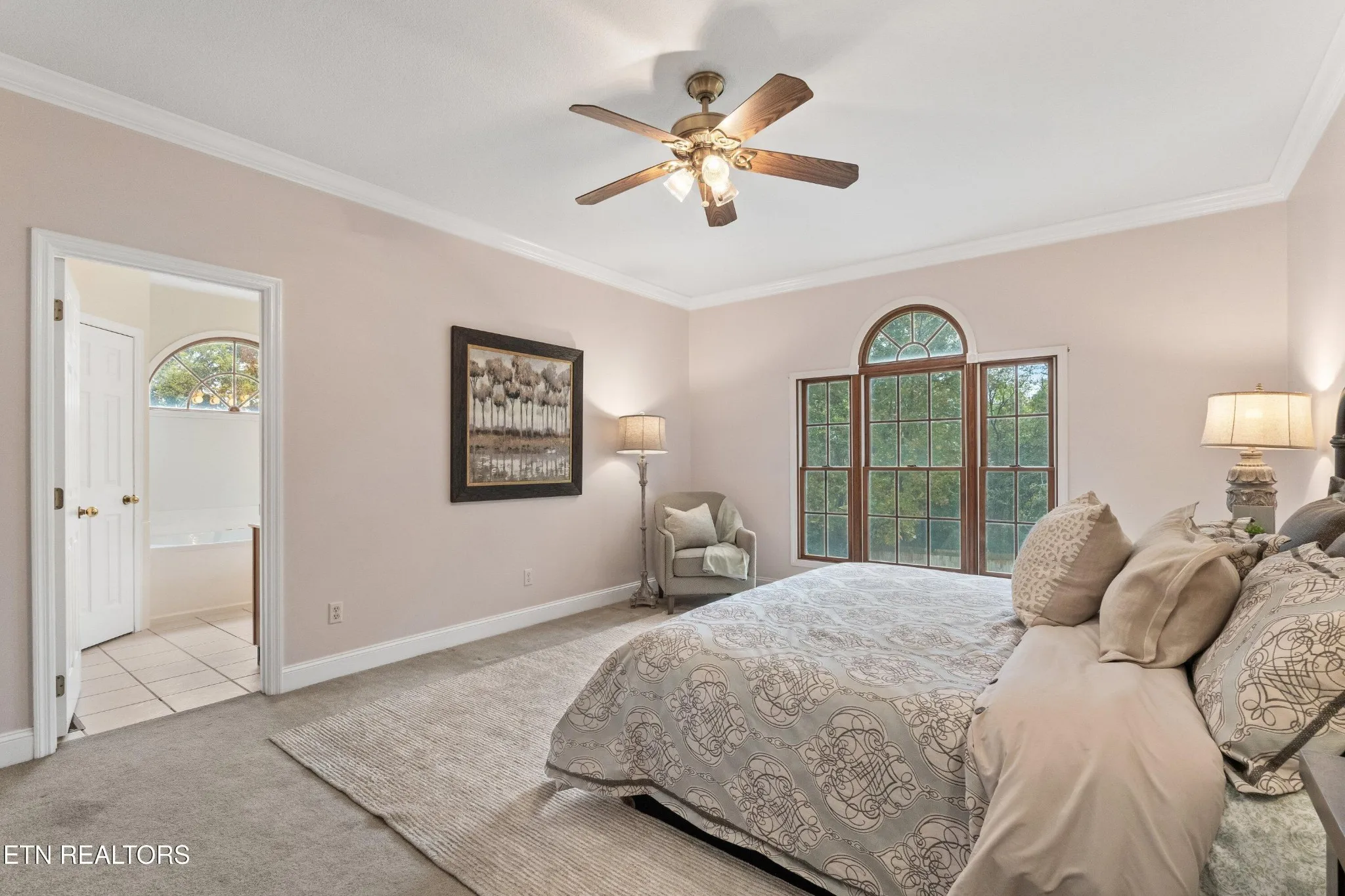 The main level features a spacious primary suite, a welcoming great room with a gas fireplace framed by french doors as well as a 3-car garage. Upstairs you will find two additional suites that provide ample space for bonus rooms. As evening falls, the chandelier in the entryway catches the setting sun and twinkles light across the foyer, adding a touch of everyday magic.