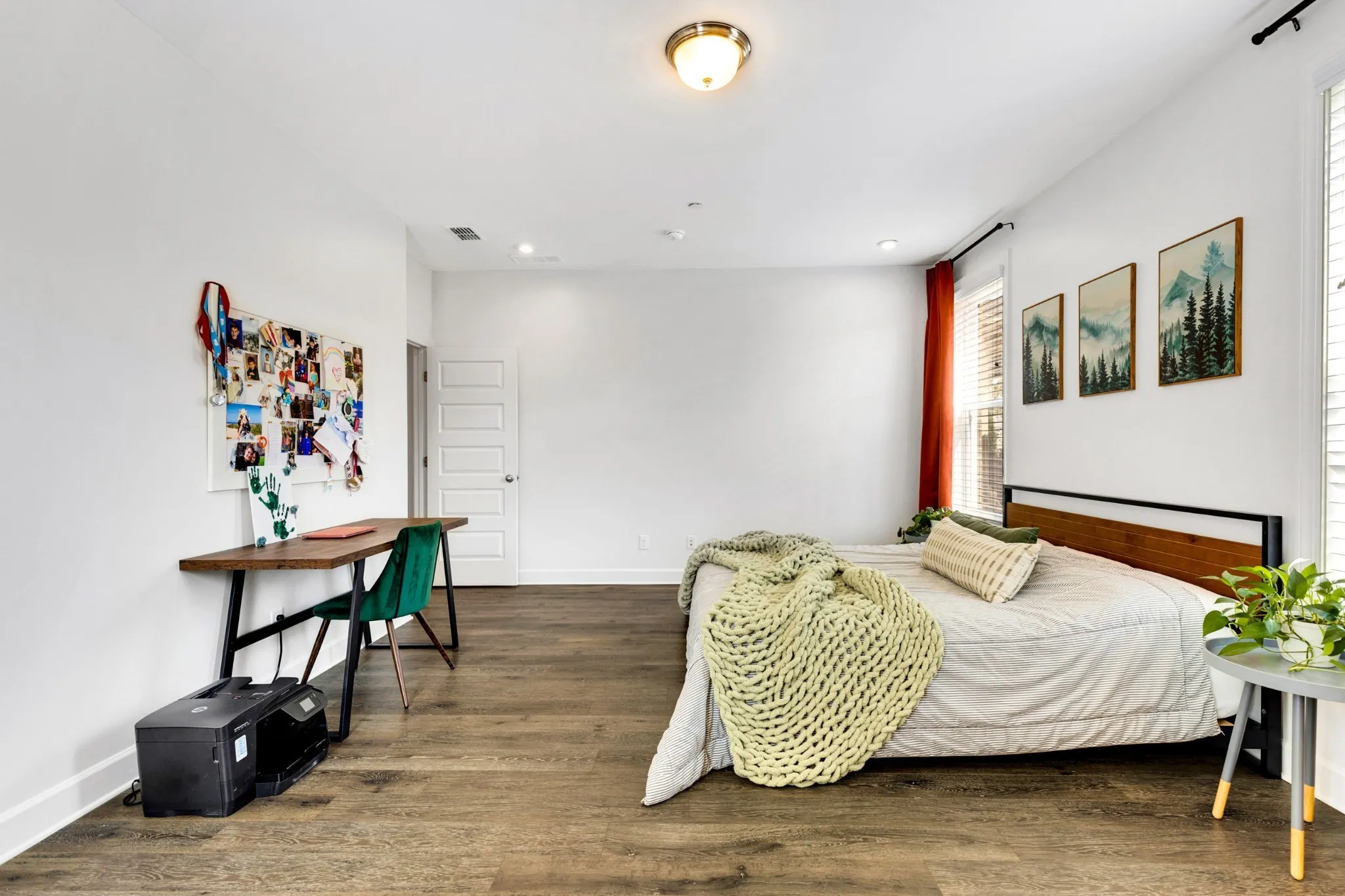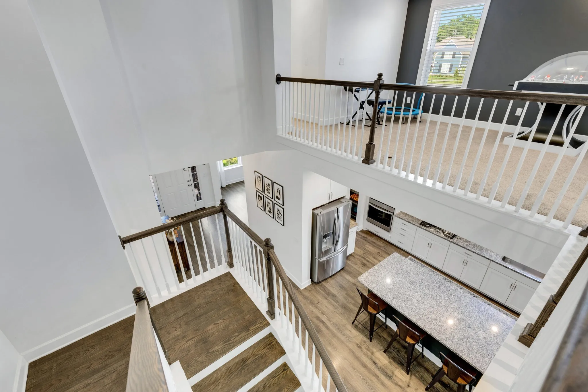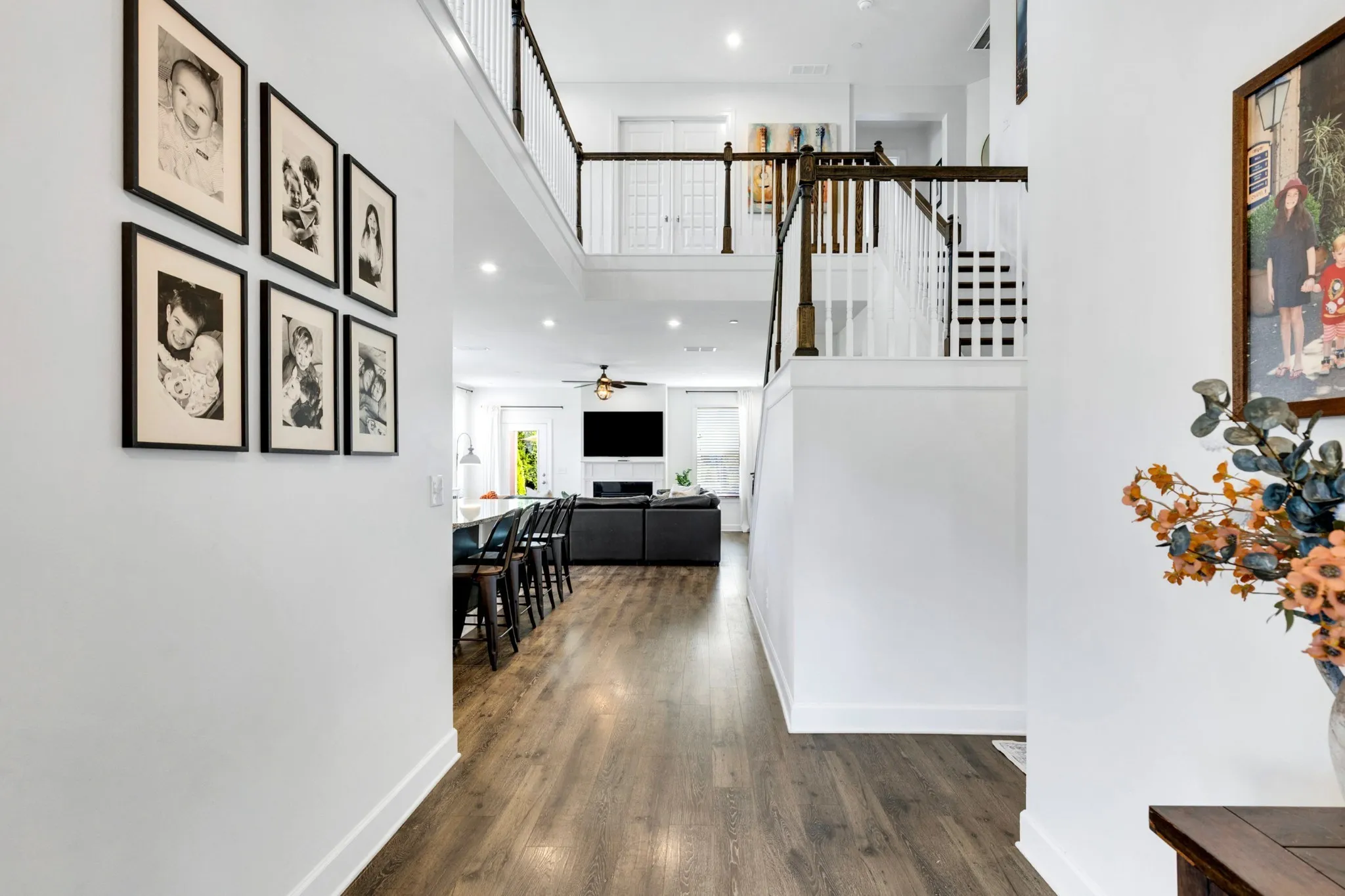 Step inside to an open, sun-filled layout with soaring ceilings, gleaming hardwoods, and a chef’s kitchen equipped with a gas range, double ovens, granite countertops, and a generous island made for gathering. The living room centers around a cozy gas fireplace, while the formal dining room, upstairs loft, and spacious media room (or optional 5th bedroom/office) provide flexible living and work-from-home options. Every bedroom includes a walk-in closet, with the upstairs primary offering a spa-like bath and an oversized closet.