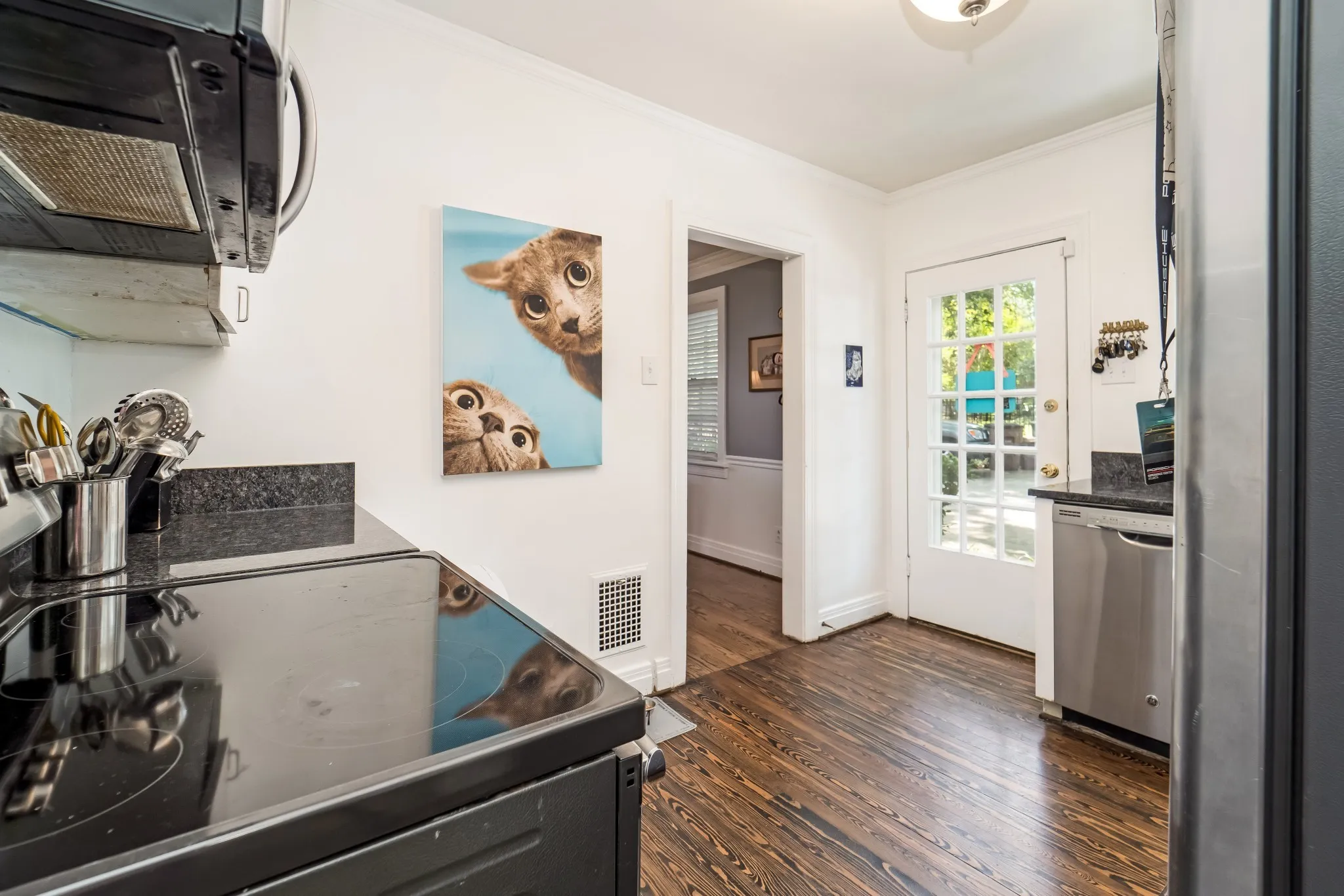 The current home features two bedrooms on the main level with hardwood floors throughout, plus an upstairs primary suite with a spa tub, separate shower, and walk-in closet. A sunroom off the living room adds flexible space for an office or bonus room. The kitchen includes hardwood flooring and stainless steel appliances.