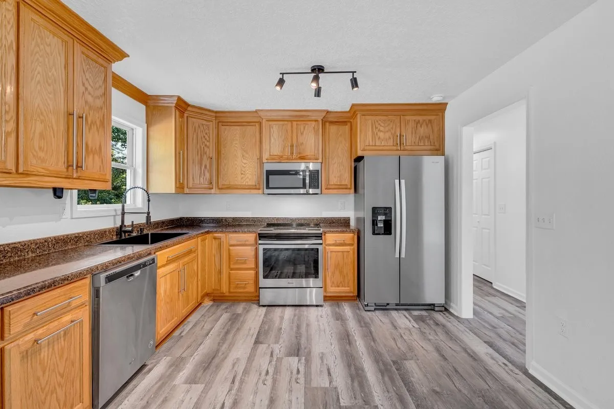 Inside, the home feels light, bright, and inviting with an open layout, spacious kitchen featuring a large sink and stainless steel appliances, and a comfortable primary suite with double closets. Step outside to relax on the charming covered front porch, entertain on the large back deck, or enjoy a rare perk — the ability to hunt right from your own backyard.