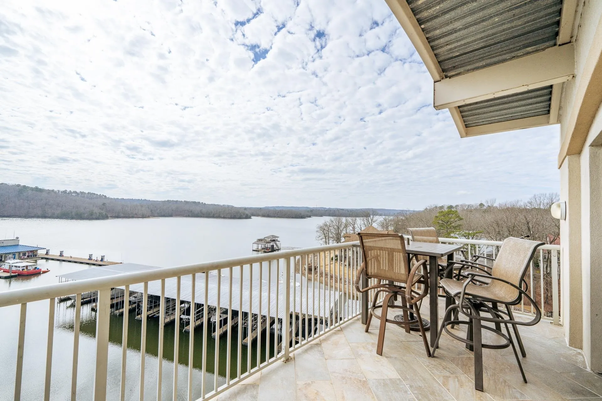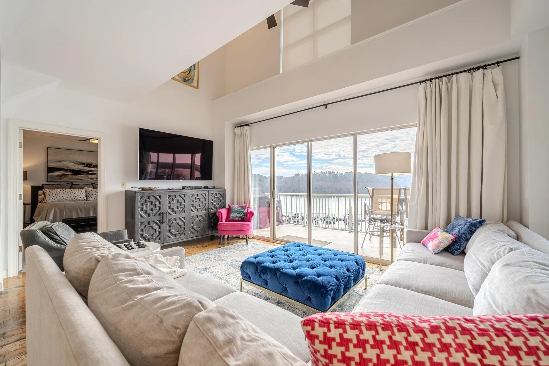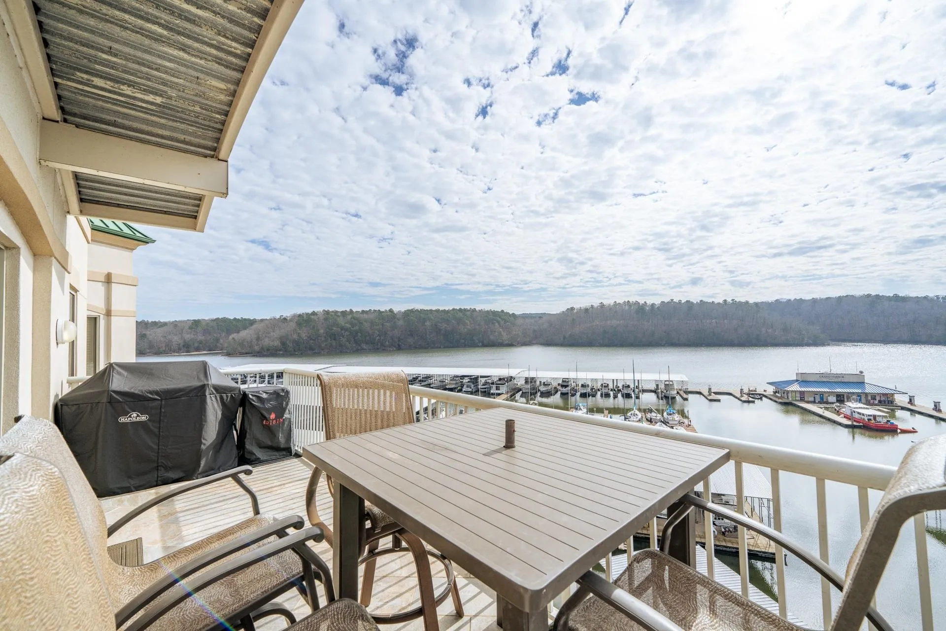 Luxury penthouse in Grand Harbor with stunning views of Yellow Creek cove on Pickwick Lake. This 4-bed, 4-bath corner unit features an open concept layout with beautiful hardwood floors throughout. The kitchen is appointed with elegant granite countertops and a stylish tile backsplash, creating a chef’s dream. The dining area overlooks the community pool. Fully furnished for your convenience, this penthouse offers a seamless transition to upscale living. In addition to the primary suite the main level includes a second Br with a private bath, and a 3rd bedroom room with shared bath. Upstairs you will find the 4th bedroom with a private bath. Enjoy Grand Harbor amenities: tennis court, gym, pool, full service marina, and a covered parking space nearby. Experience the best of lakeside living in this exquisite property.