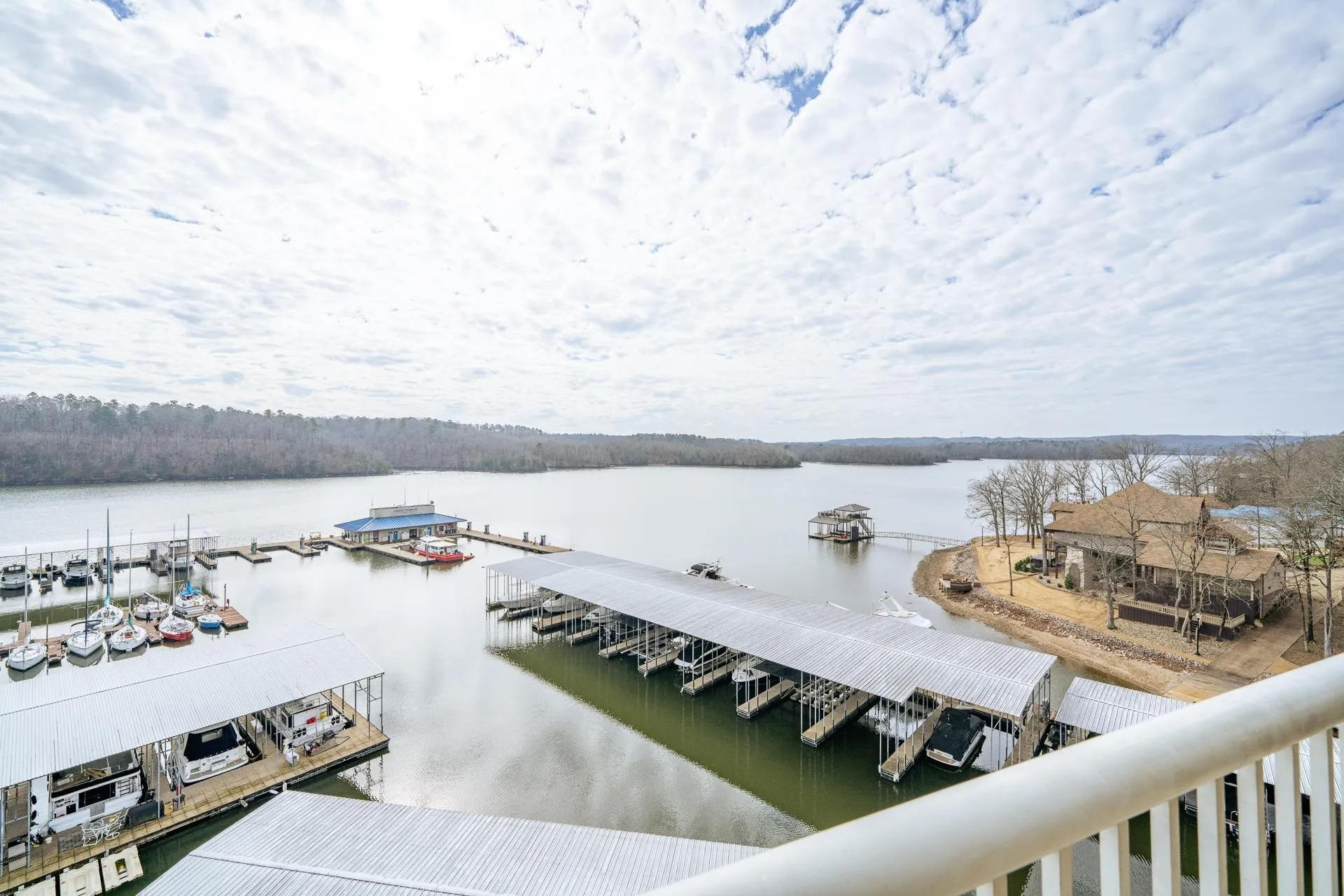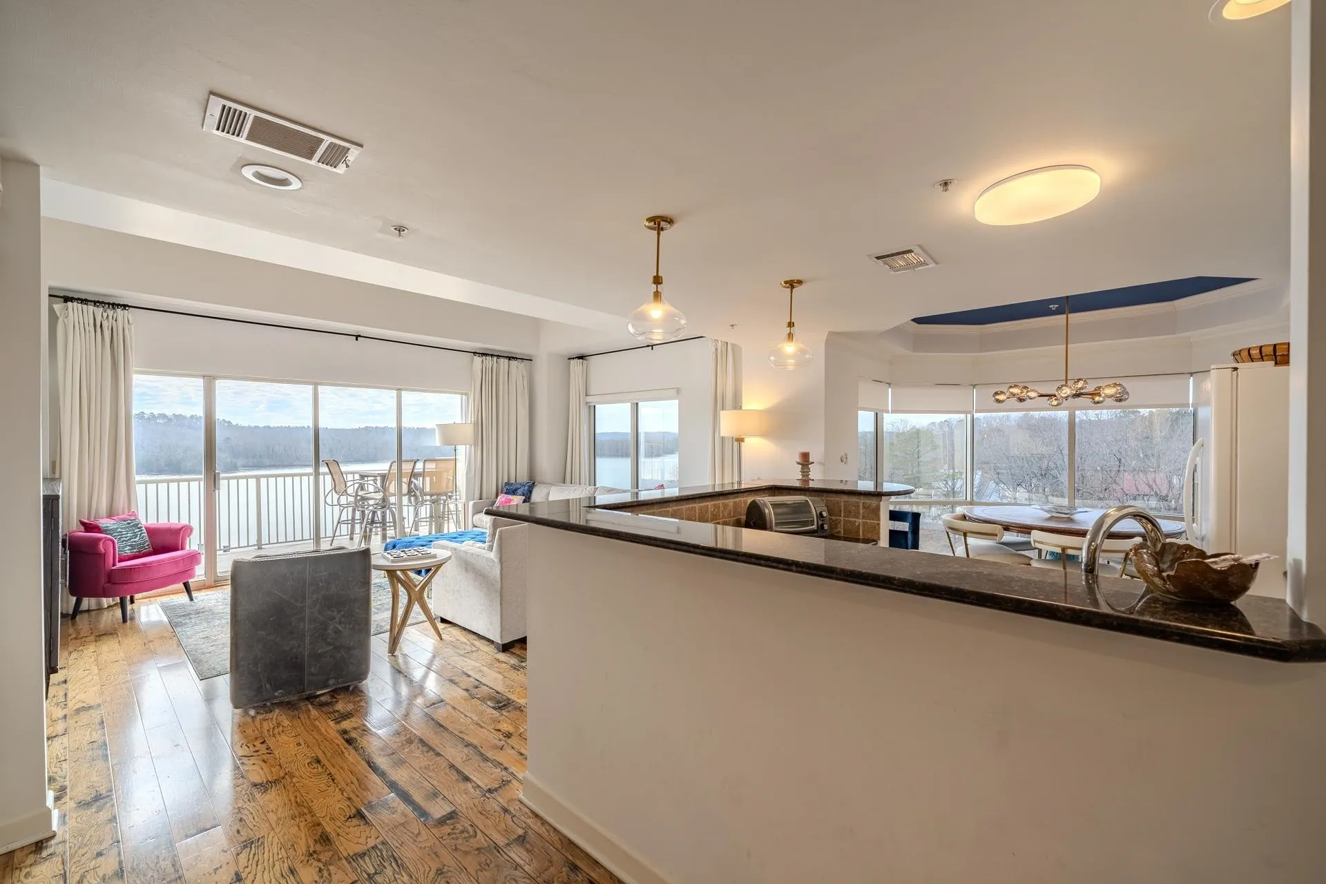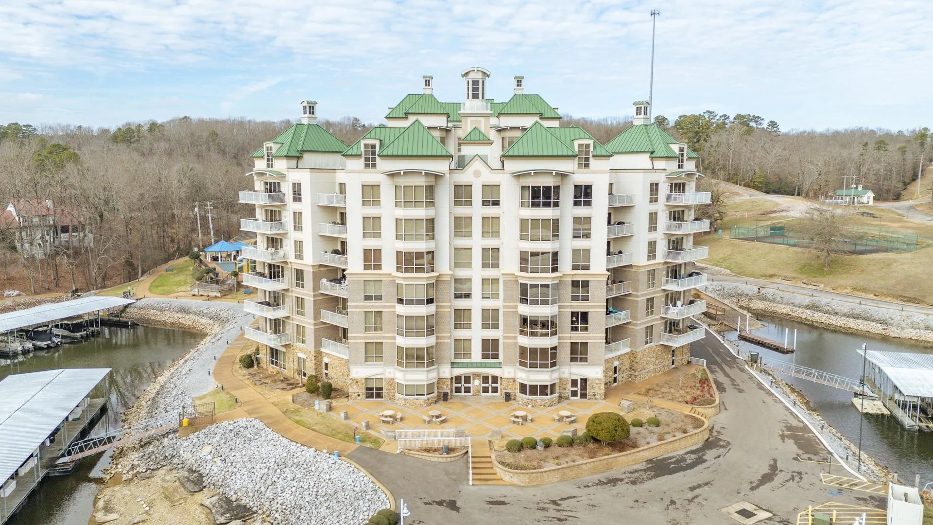 Luxury penthouse in Grand Harbor with stunning views of Yellow Creek cove on Pickwick Lake. This 4-bed, 4-bath corner unit features an open concept layout with beautiful hardwood floors throughout. The kitchen is appointed with elegant granite countertops and a stylish tile backsplash, creating a chef’s dream. The dining area overlooks the community pool. Fully furnished for your convenience, this penthouse offers a seamless transition to upscale living. In addition to the primary suite the main level includes a second Br with a private bath, and a 3rd bedroom room with shared bath. Upstairs you will find the 4th bedroom with a private bath. Enjoy Grand Harbor amenities: tennis court, gym, pool, full service marina, and a covered parking space nearby. Experience the best of lakeside living in this exquisite property.
