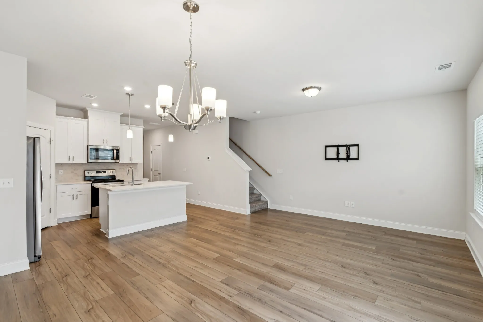 Welcome Home! This beautiful townhome rental comes complete with a washer, dryer, refrigerator, and window blinds for your convenience. Entertain guests in the spacious second-story loft—perfect for game nights or a home office. Downstairs, the open-concept kitchen features a large island overlooking the great room and dining area, ideal for everyday living and entertaining.