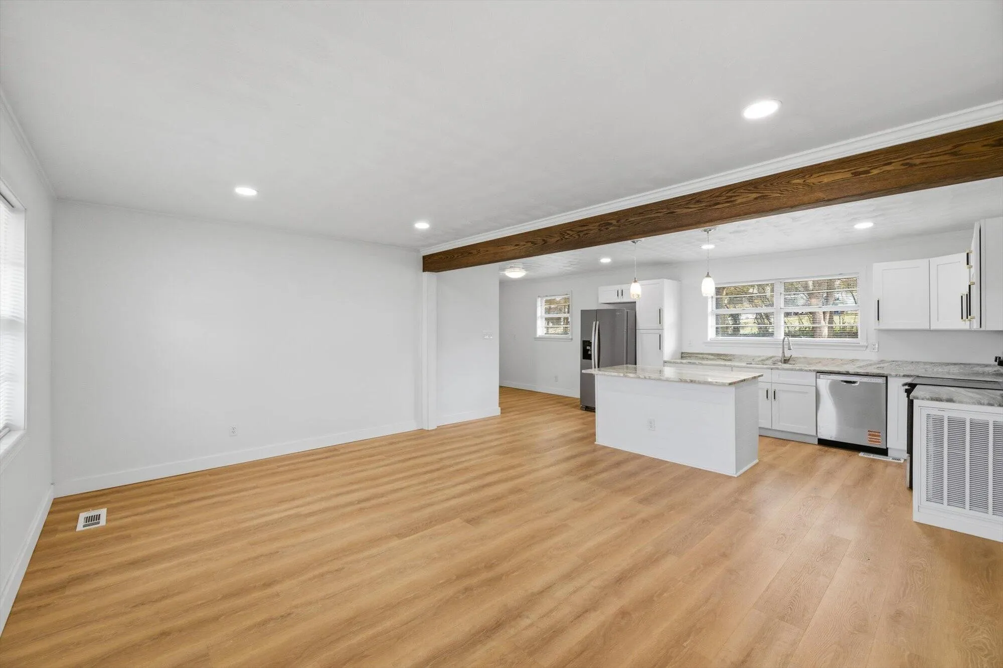 Inside, the home features an open concept layout with natural light throughout. The kitchen is anchored by a functional island, creating a natural gathering space for cooking, casual meals, and conversation. Updates include all new appliances and mechanicals, including a brand new HVAC system, eliminating major maintenance concerns.