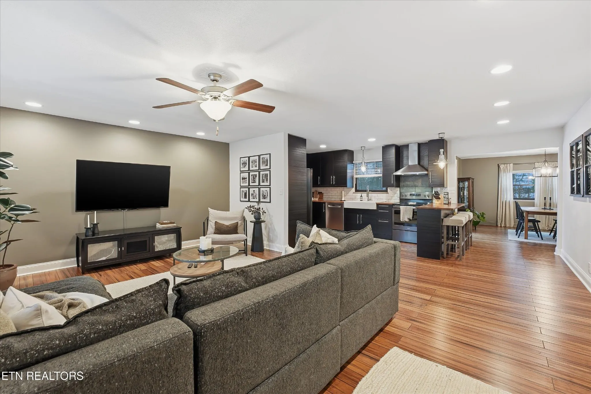 This stunning brick-front ranch perfectly balances classic curb appeal with a sophisticated, modern interior. After stepping up to the inviting covered porch, you enter a bright and welcoming living room featuring beautiful wood-look flooring that carries throughout the home. The layout offers a seamless ”open flow” that maintains a sense of warmth and defined structure, leading you from the living space into a showstopping kitchen.