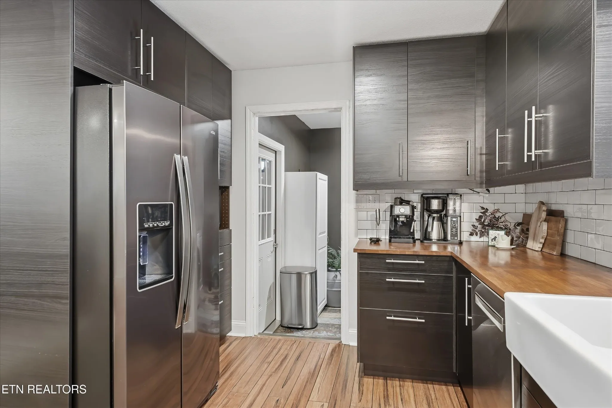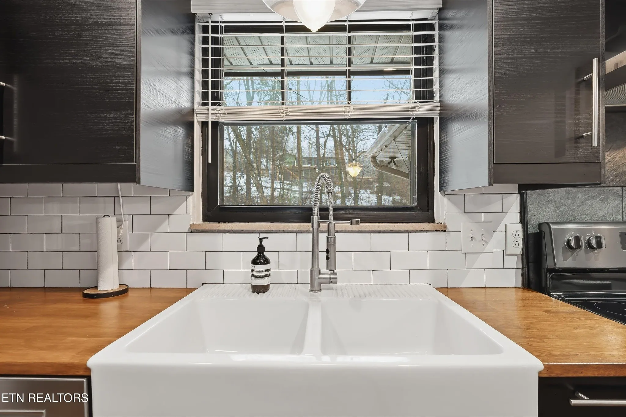 The kitchen is a designer’s dream, boasting modern black cabinetry, rich butcher block countertops, and a classic farmhouse sink. A stylish tile backsplash and stainless steel appliances—perfectly coordinated with the fixtures—complete the space, which transitions effortlessly into a large dining area surrounded by windows that flood the room with natural light. For the primary retreat, enjoy a spacious bedroom highlighted by a custom feature wall, a walk-in closet, and an ensuite bathroom with a custom tile shower and glass door.