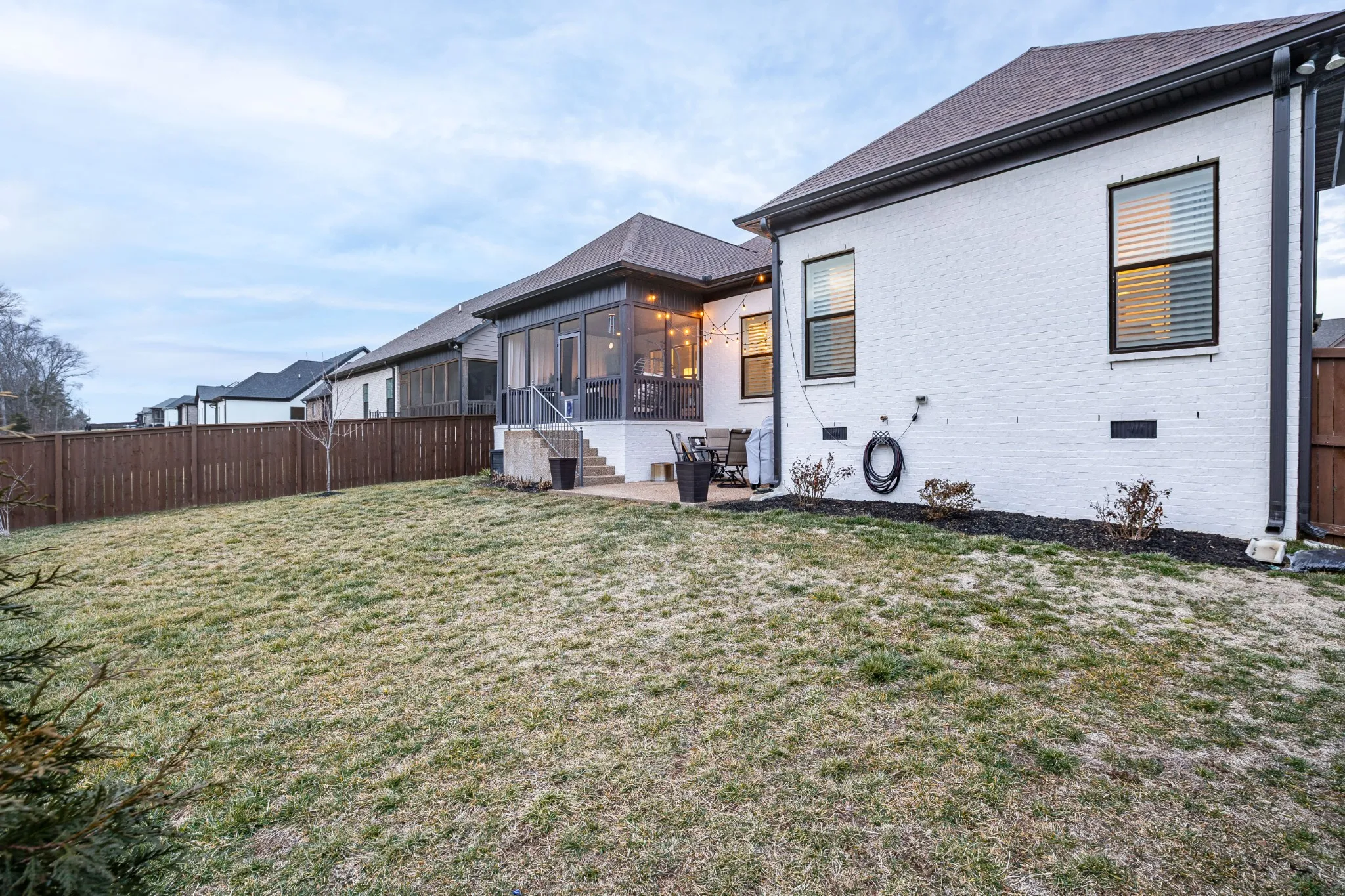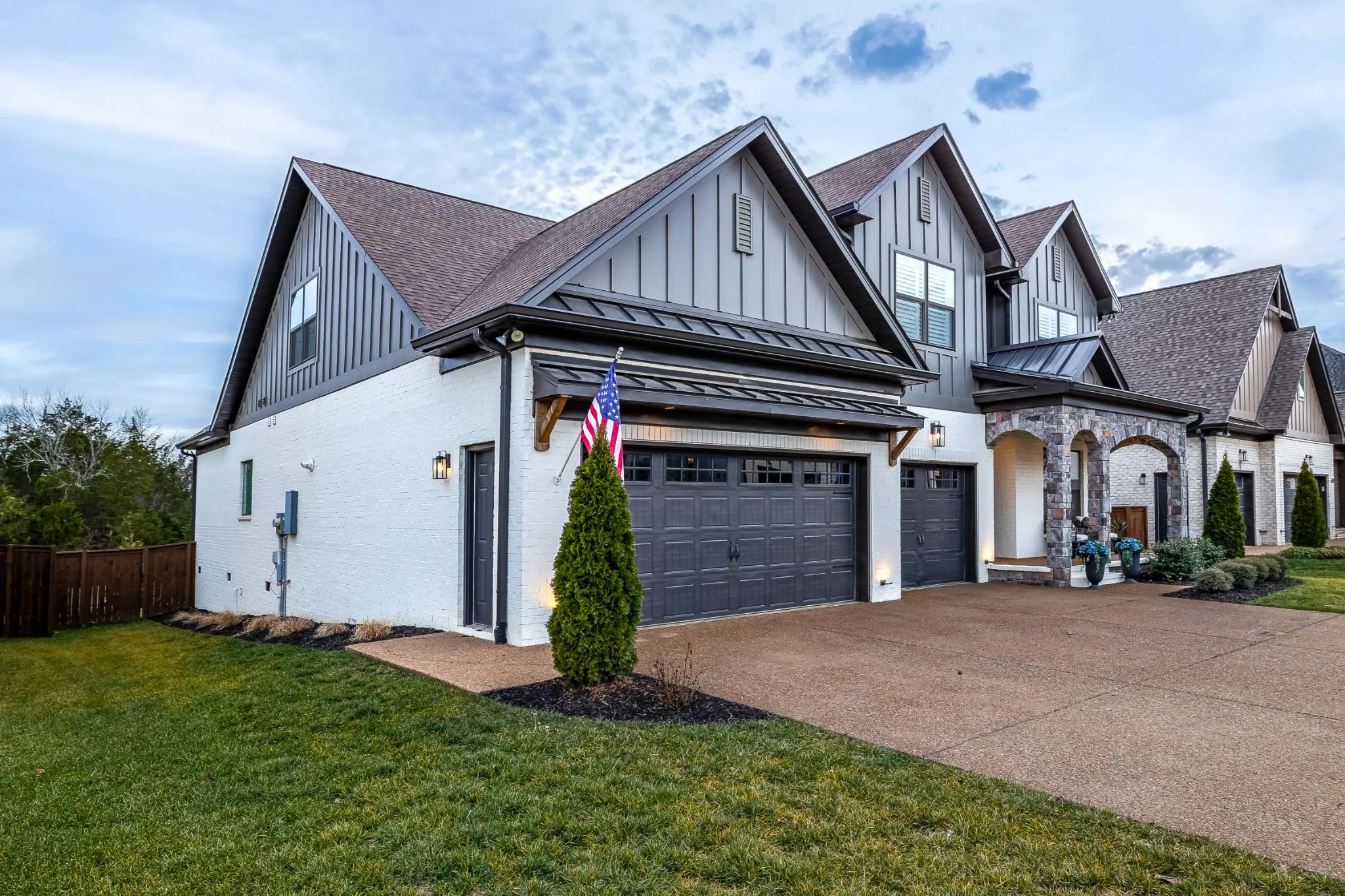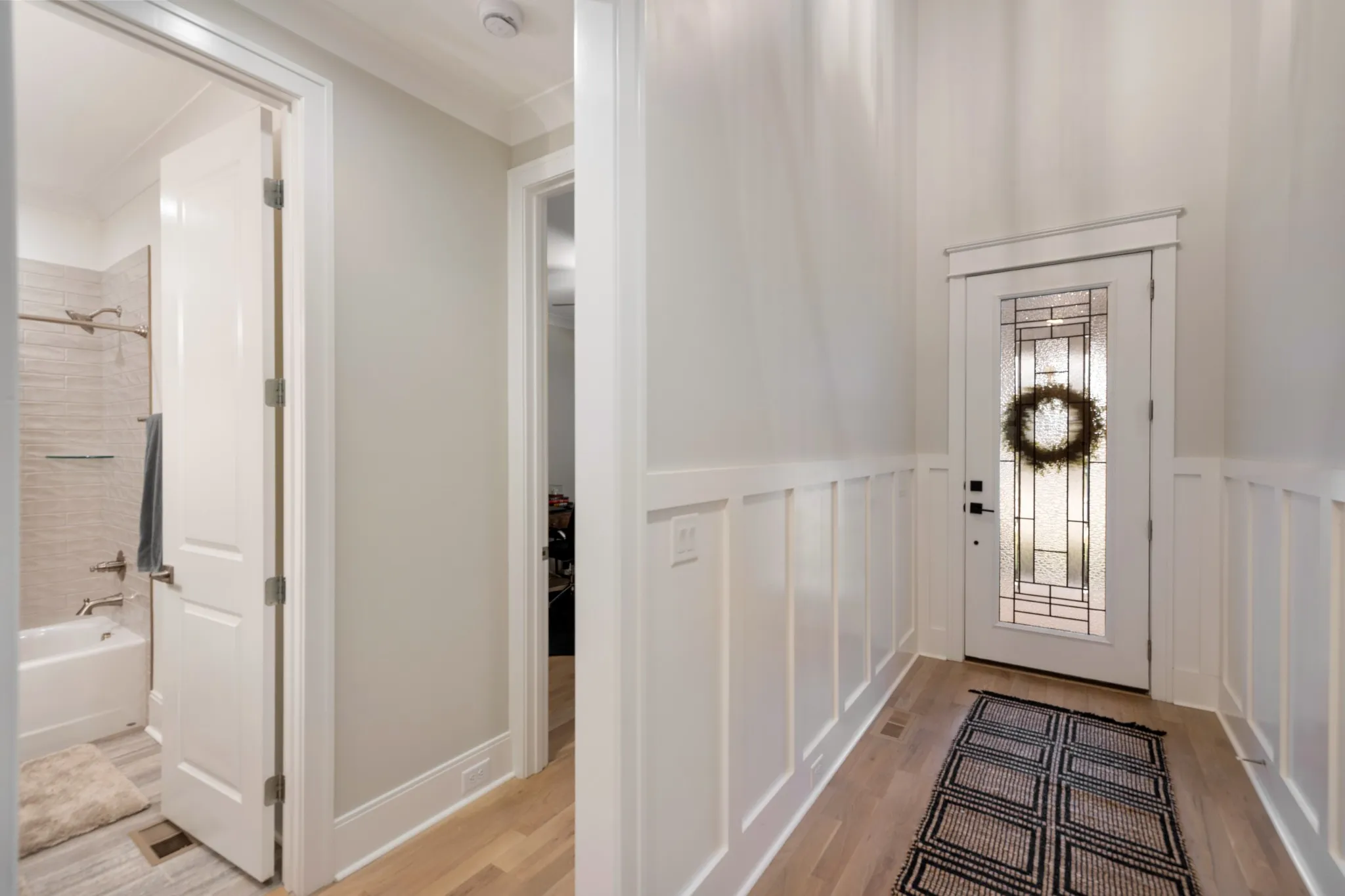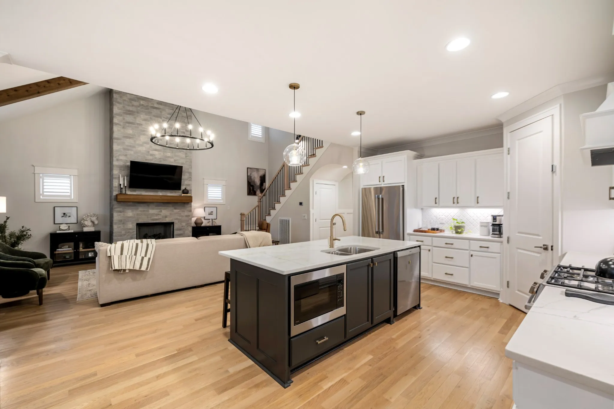 Professionally Designed and thoughtfully appointed, this Modern 4 Bedroom, 3 Full Bath Home is located in the charming Stone Hollow neighborhood, complete with a community swimming pool, kiddie pool, walking trails and a playground. White oak floors and plantation shutters flow throughout the home, creating a bright and timeless foundation. The gourmet kitchen features new luxury appliances: Thermidor Fridge, Bosch range, Bosch dishwasher, built in counter GE microwave, quartz countertops, and a spacious walk-in pantry; perfect for both everyday living and entertaining. The primary suite is conveniently located on the main level featuring a spa like bathroom with a jacuzzi soaking tub and a his & hers walk-in custom closet. The main floor also has a guest bedroom and full bathroom, offering flexible living options. Upstairs, enjoy a Juliet balcony, two additional bedrooms, and two large bonus rooms ideal for a private office, guest suite, playroom, gym, or media space, plus a full bathroom. The covered, screened-in back porch includes privacy roman shades and overlooks mature landscaping and a peaceful tree line, providing a serene outdoor retreat with updated exterior light fixtures. A three-car garage with epoxy floors adds both style and functionality. Ideally situated just minutes from award-winning schools, dining, shopping, and easy highway access, this exceptional home blends modern comfort with everyday convenience. A quick 20 min drive to the BNA Airport & 30 mins to Downtown Nashville!