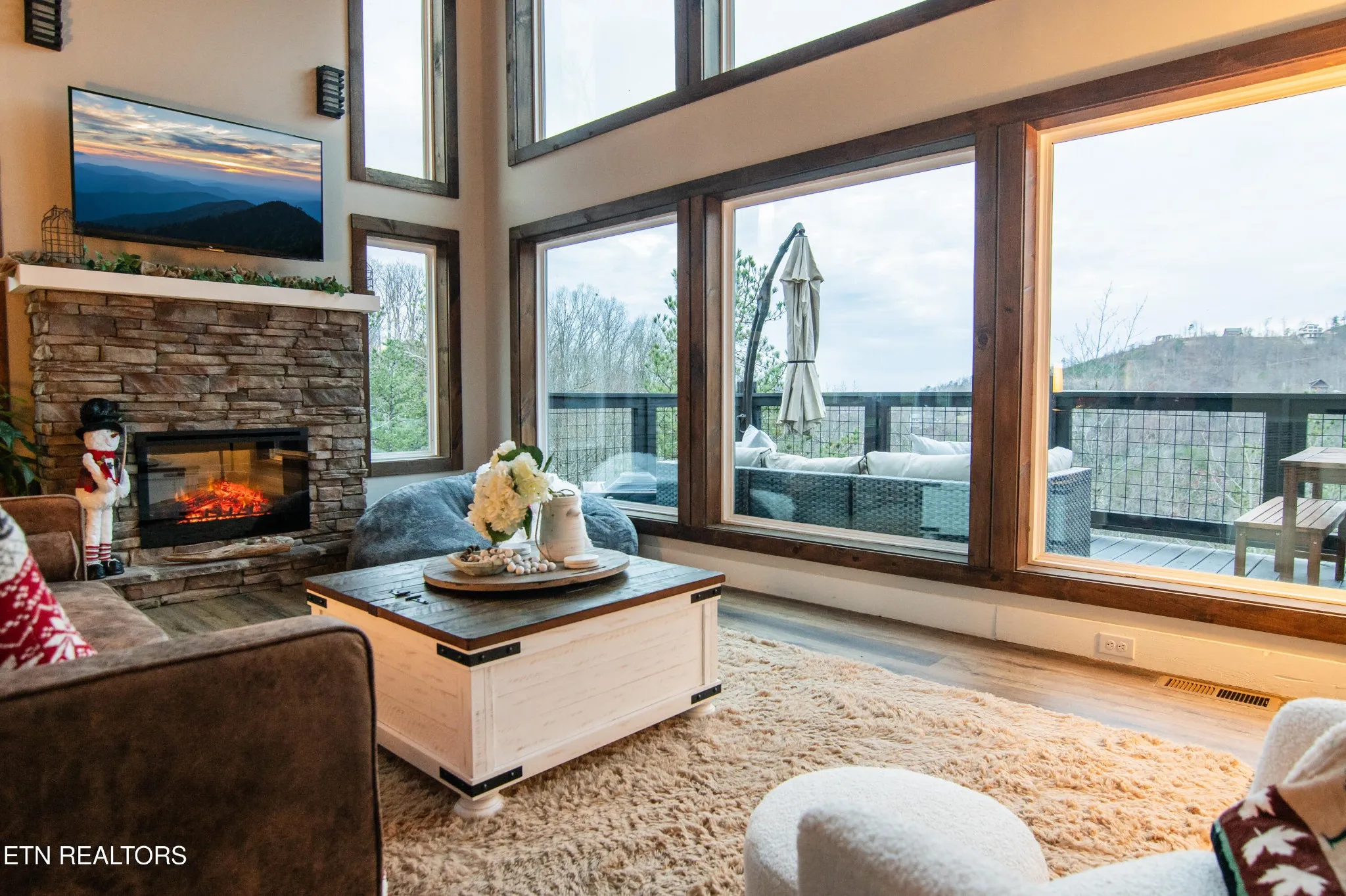 Inside, the open-concept living space is designed for both comfort and connection. A dedicated dining area flows seamlessly into the kitchen and living room, making it easy for guests to gather and visit together. The cozy living area is anchored by a gas fireplace and framed by floor-to-ceiling windows showcasing expansive mountain views, creating a warm, welcoming atmosphere year-round. A gaming nook adds an extra touch of fun and functionality.