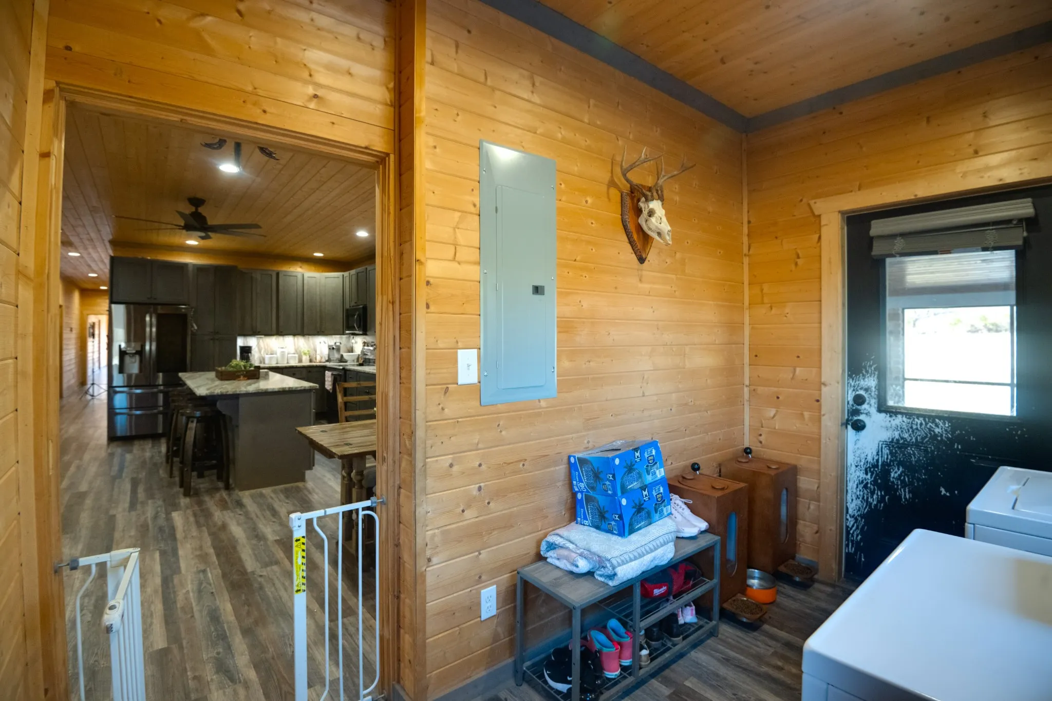This stunning barndominium blends rustic charm with modern luxury on 2.35 private acres, offering over 2,800 sq ft of thoughtfully designed living space. The 5-bedroom home features tongue-and-groove walls and ceilings, a chef’s kitchen with leathered granite countertops, walk-in pantry, mud room, and tankless water heater.