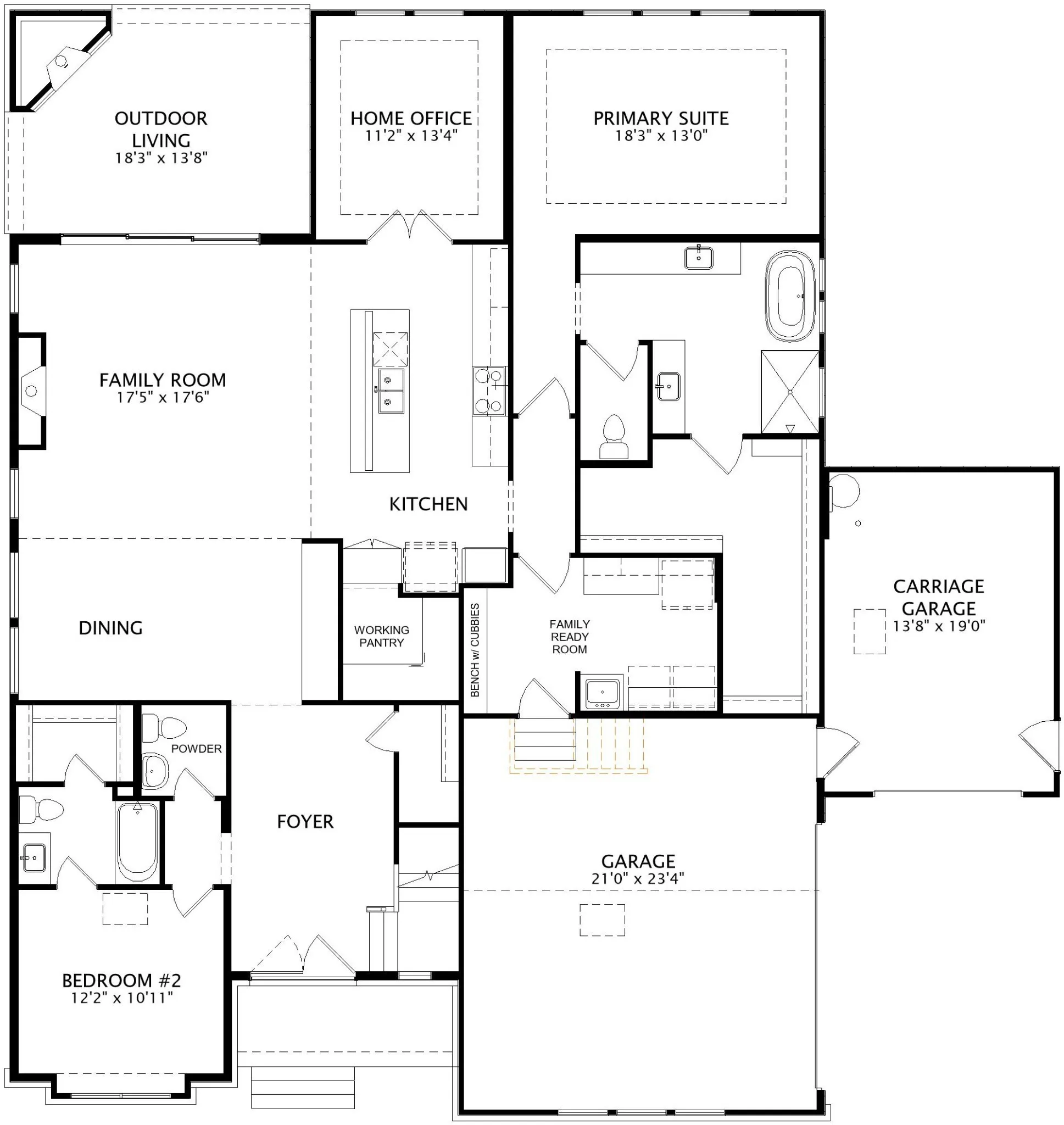 Designed for both privacy and comfort, the luxurious primary suite is tucked into its own private wing and features direct access from the primary closet to the laundry room. The spa-inspired bathroom includes a freestanding soaking tub, an oversized walk-in shower, and abundant cabinetry for storage.