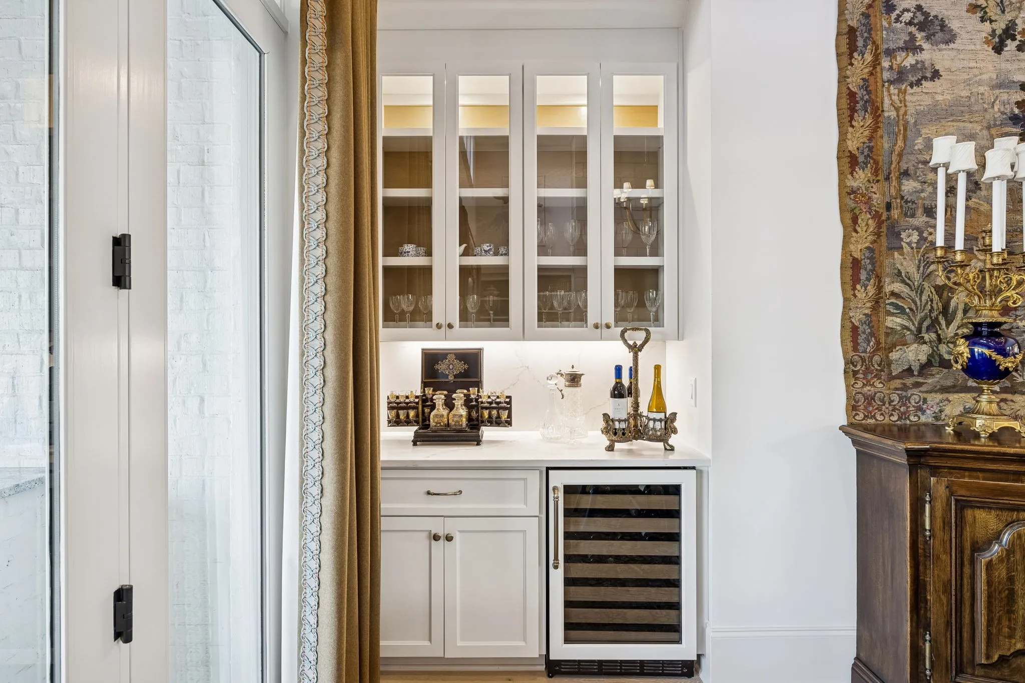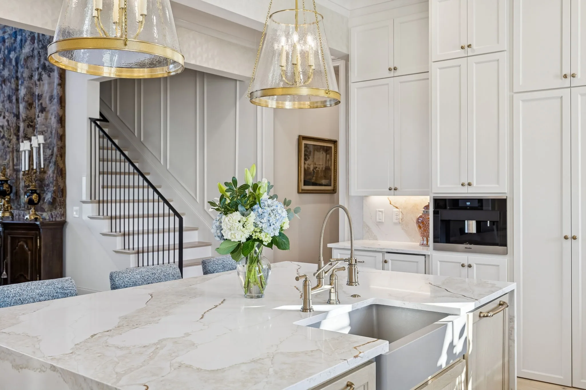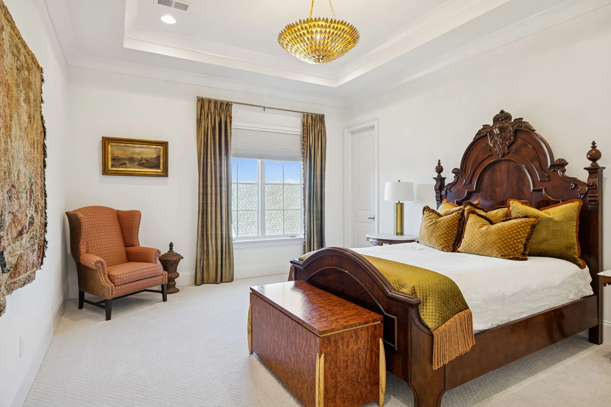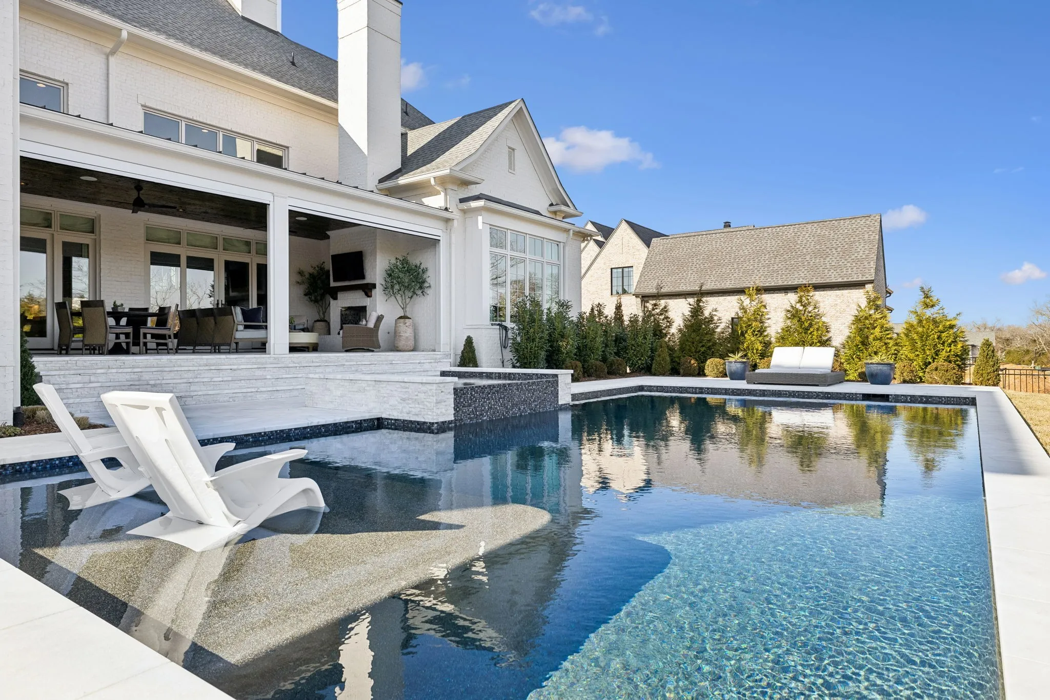 Experience an elevated lifestyle where timeless architecture meets modern luxury! A dramatic two-story foyer welcomes you into light-filled living spaces designed for both everyday comfort and effortless entertainment. The gourmet kitchen is the heart of the home, featuring Wolf & Sub-Zero appliances, Scotsman ice machine, Miele Luxury built-in coffee machine, marble slab backsplash, and a hidden walk-in pantry ideal for seamless hosting. The great room & dining room impress with soaring 19-foot coffered ceilings that create a warm yet grand atmosphere. The primary suite serves as a private retreat with a vaulted beam ceiling and spa-inspired bath offering heated floors, a spacious walk-in shower, freestanding soaking tub, and dual walk-in closets. The main level also includes a private guest suite with vaulted ceiling, an elegant bath with separate tub and shower, and a generous closet, along with a richly appointed study perfect for work or relaxation. All bedrooms feature ensuite bathrooms, ensuring comfort and privacy. Upstairs, enjoy a versatile bonus room with wet bar, ideal for entertaining or as a home theater, plus an adjacent workout or hobby room. Outdoor living is exceptional with covered living and dining areas showcasing marble pavers, an outdoor fireplace, motorized screens, and a fully equipped outdoor kitchen. The backyard oasis features a 40′ x 20′ saltwater gunite pool with waterfall spa & tanning ledge, expansive fire pit, custom seating, mature trees, and curated lighting. Smart home features include a Prodigy system for lighting and window treatments, security cameras, automated lighting zones, whole-home audio, & enhanced WiFi. Comfort is achieved with whole-house humidity control and high-efficiency American Standard HVAC systems. Designer lighting throughout completes this move-in-ready home offering luxury, comfort, and effortless living. Requests for showings should include Proof of Funds or a lender preapproval at the time of submission.