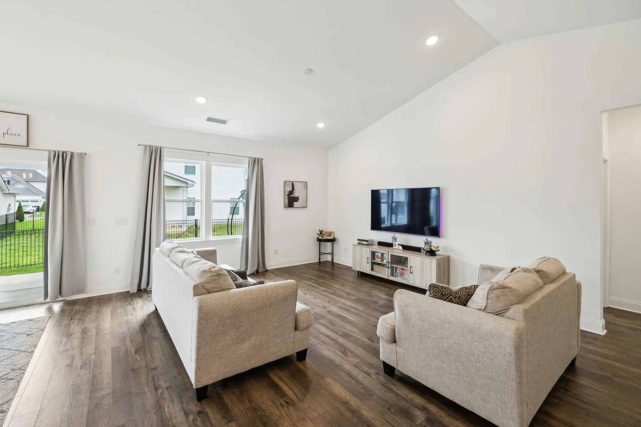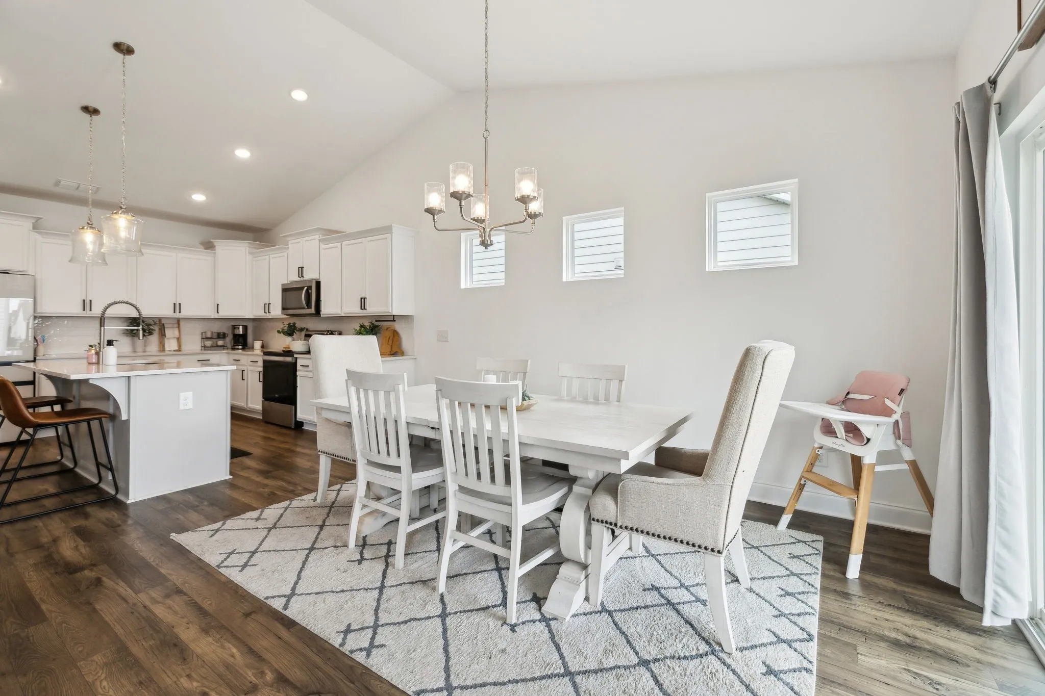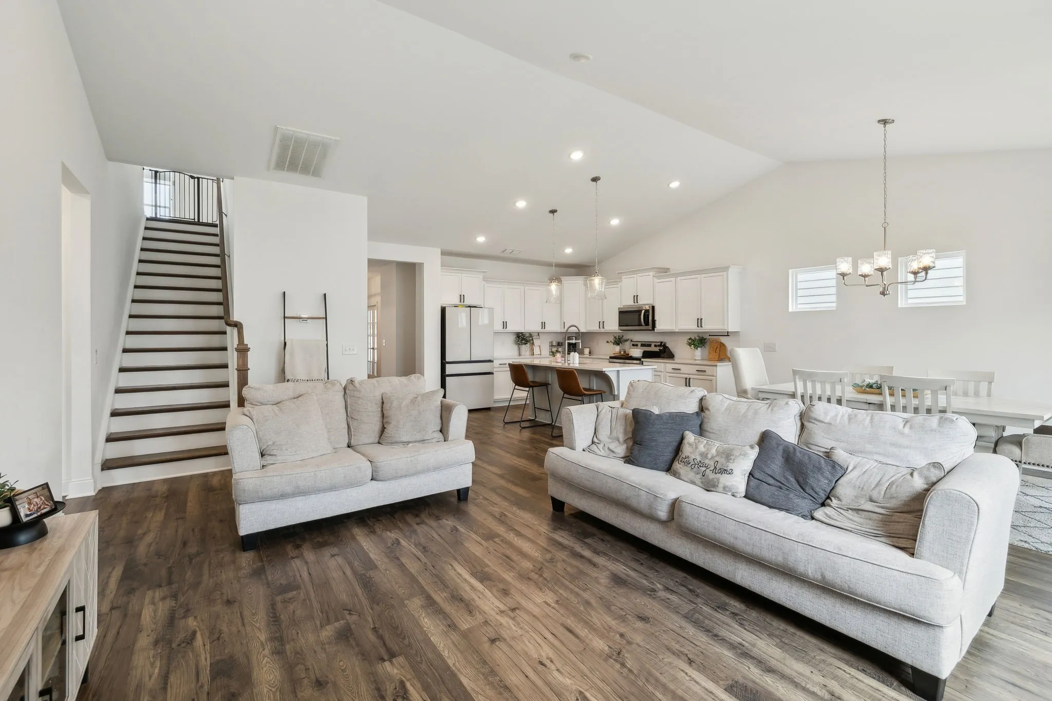 Step into this beautifully designed home featuring an open-concept kitchen and dining area with soaring vaulted ceilings and loads of recessed lighting that create a bright, and airy feel! Main level features beautifully finished wood flooring throughout. The kitchen is a true highlight, offering ample cabinetry, a spacious layout, and generous walk-in pantry–perfect for both everyday living and entertaining! Just off of the main living area, you’ll find a dedicated office space, ideal for working from home or managing daily tasks in peace along with a convenient half bath. The main-level primary suite offers an oversized walk-in closet and an ensuite bath and an oversized walk-in shower. Upstairs, a versatile bonus area provides a second living space or kids’ retreat, while the secondary bedrooms are generously sized and each with a walk-in closet! Enjoy outdoor living on the covered patio, perfect for grilling and entertaining. NO carpet on main level!