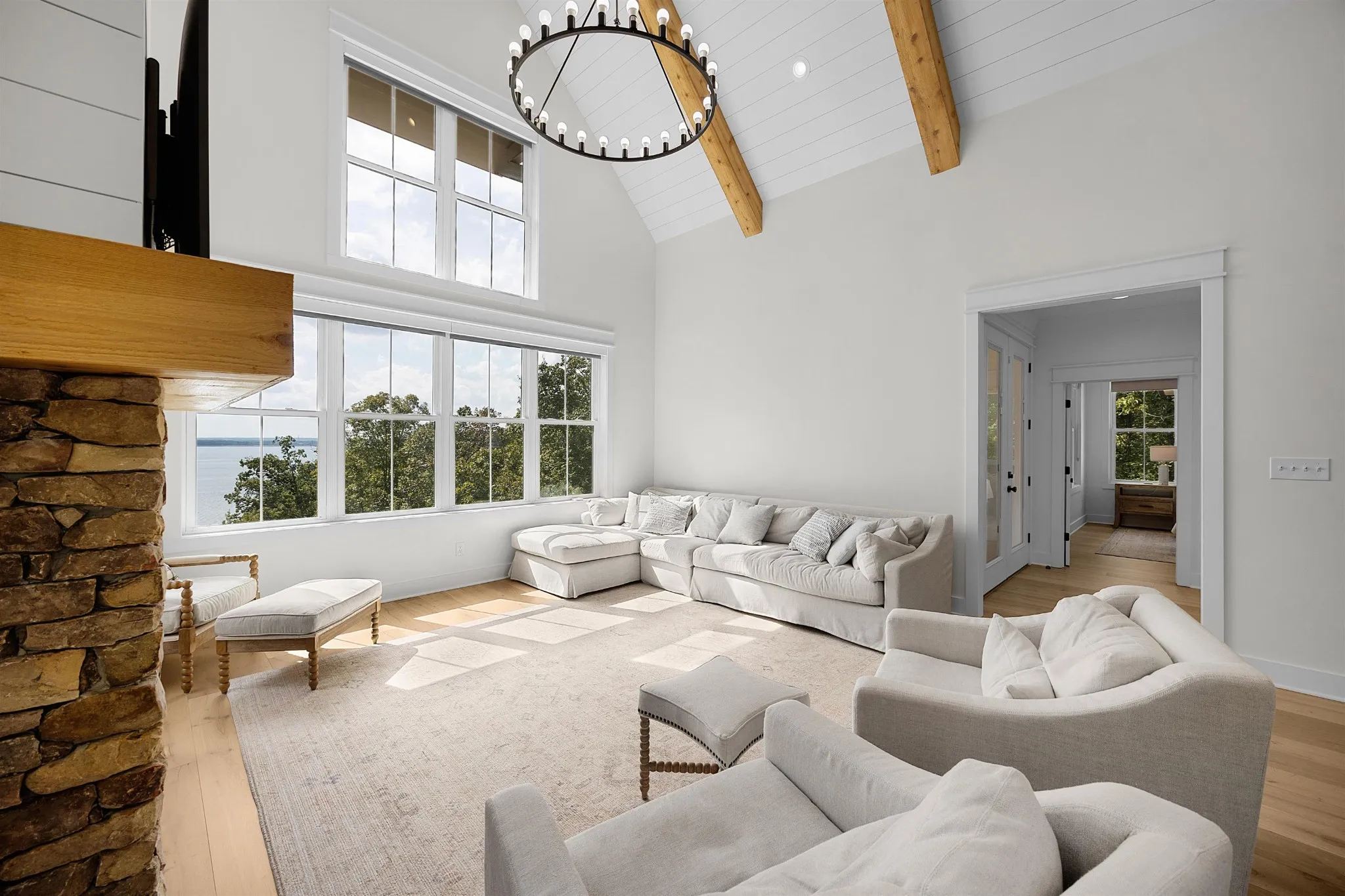Nestled within the exclusive gated community of Premier Preserve at Pickwick, this custom-built home offers panoramic views of Pickwick Lake. The main level features an open-concept design, seamlessly connecting the gourmet kitchen, living area, and dining space. The kitchen is equipped with stainless steel appliances, a gas cooktop, granite countertops, and stylish shaker cabinets. Vaulted tongue and groove ceilings with cedar beams add a touch of rustic elegance to the living and dining areas. Retreat to the spacious master suite, complete with hardwood flooring & a luxurious master bath featuring a tile shower. Enjoy outdoor living on the covered porch with a gas fireplace. The lower level offers a welcoming sitting area with a wet bar, three additional bedrooms, and two full baths. Step outside to a covered porch that leads to a charming fire pit, ideal for entertaining. The upper level includes a 5th BR with a full bath. The home includes a covered boat slip in the private marina.