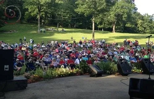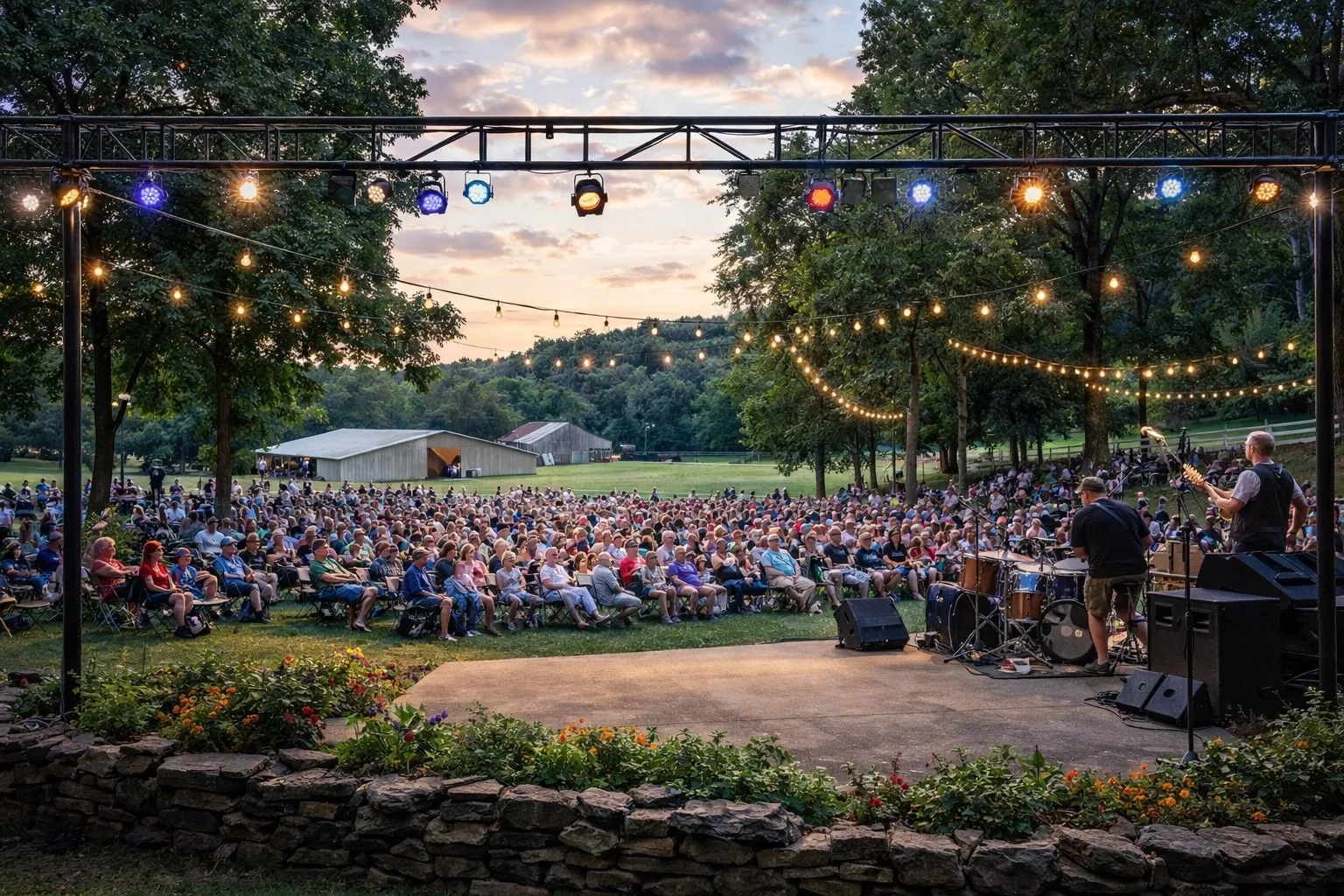 Stage area with professional lighting and electric hookups, ideal for concerts, weddings, and festivals