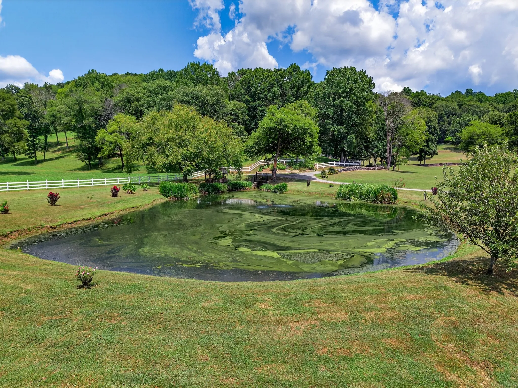 Barn, pond, fountains, and mature landscape