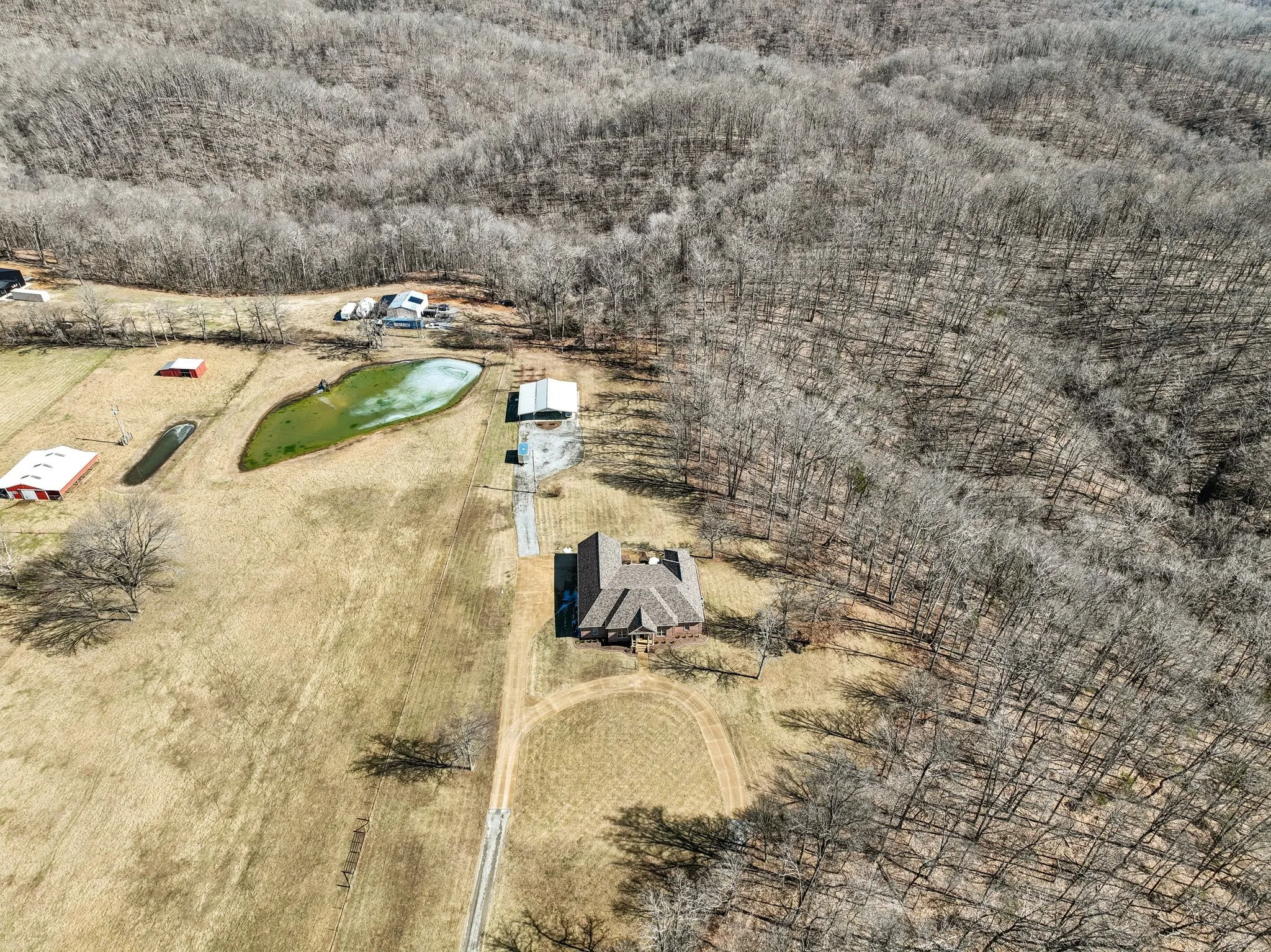 Exceptional Gated Country Estate on 10 Acres – Minutes from the Interstate! Private and elegant custom brick home offering mostly one-level living with a circular driveway and grand foyer entry. Refinished hardwoods, neutral colors, formal dining room, and spacious living area open to a well-appointed kitchen, casual dining, and light-filled flex room. Main-level primary suite features a remodeled bath with soaking tub, large walk-in closet, sunroom, and private office. Three additional bedrooms on the main level, including one suitable as a guest suite with kitchenette. Upstairs includes a large media/rec room, playroom, and optional bedroom with full bath. Beautiful wooded acreage with room for a deer stand, 48×48 metal barn/workshop, 50-amp RV service, and abundant privacy. Additional 18.5 acres available. Call Agent for details.