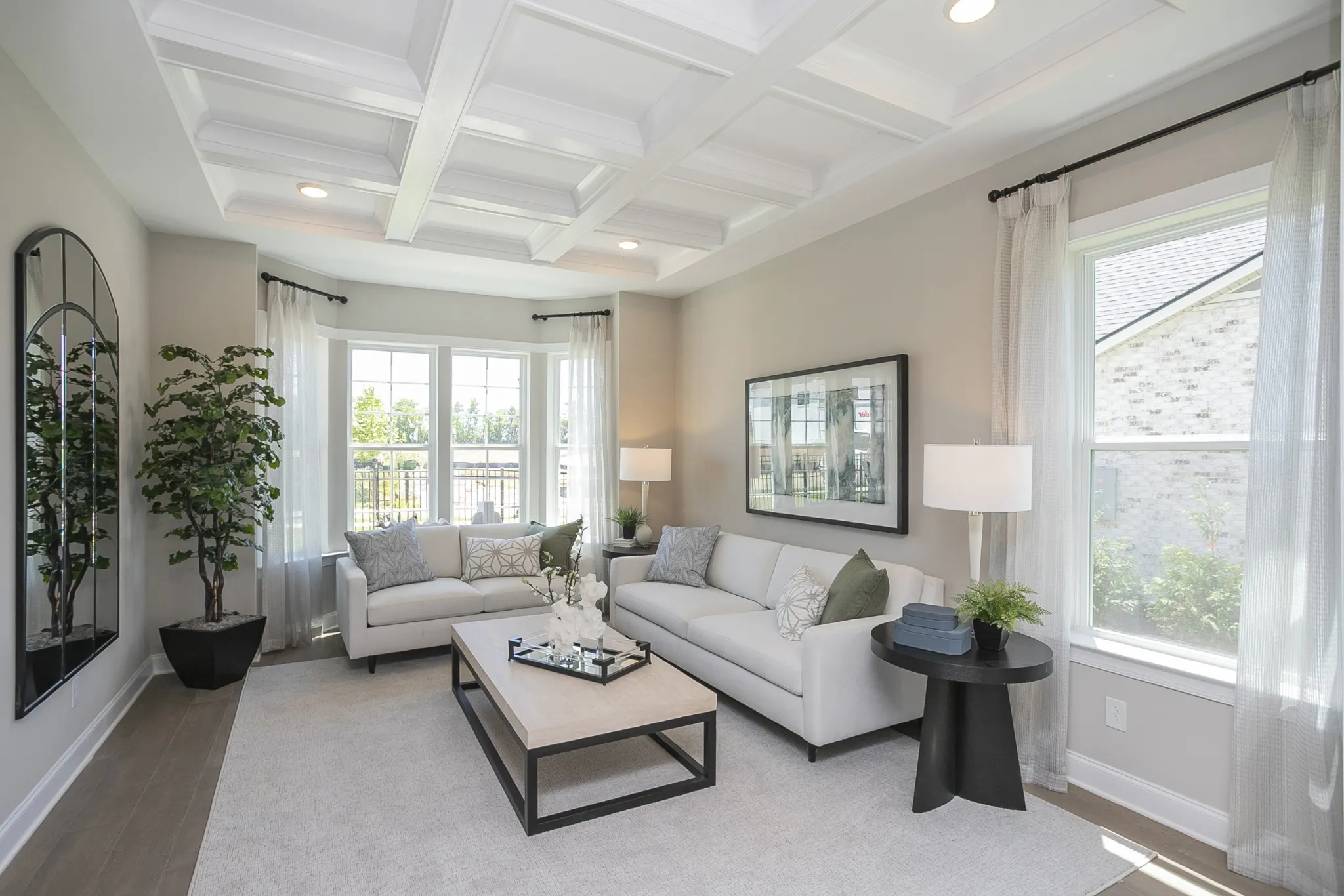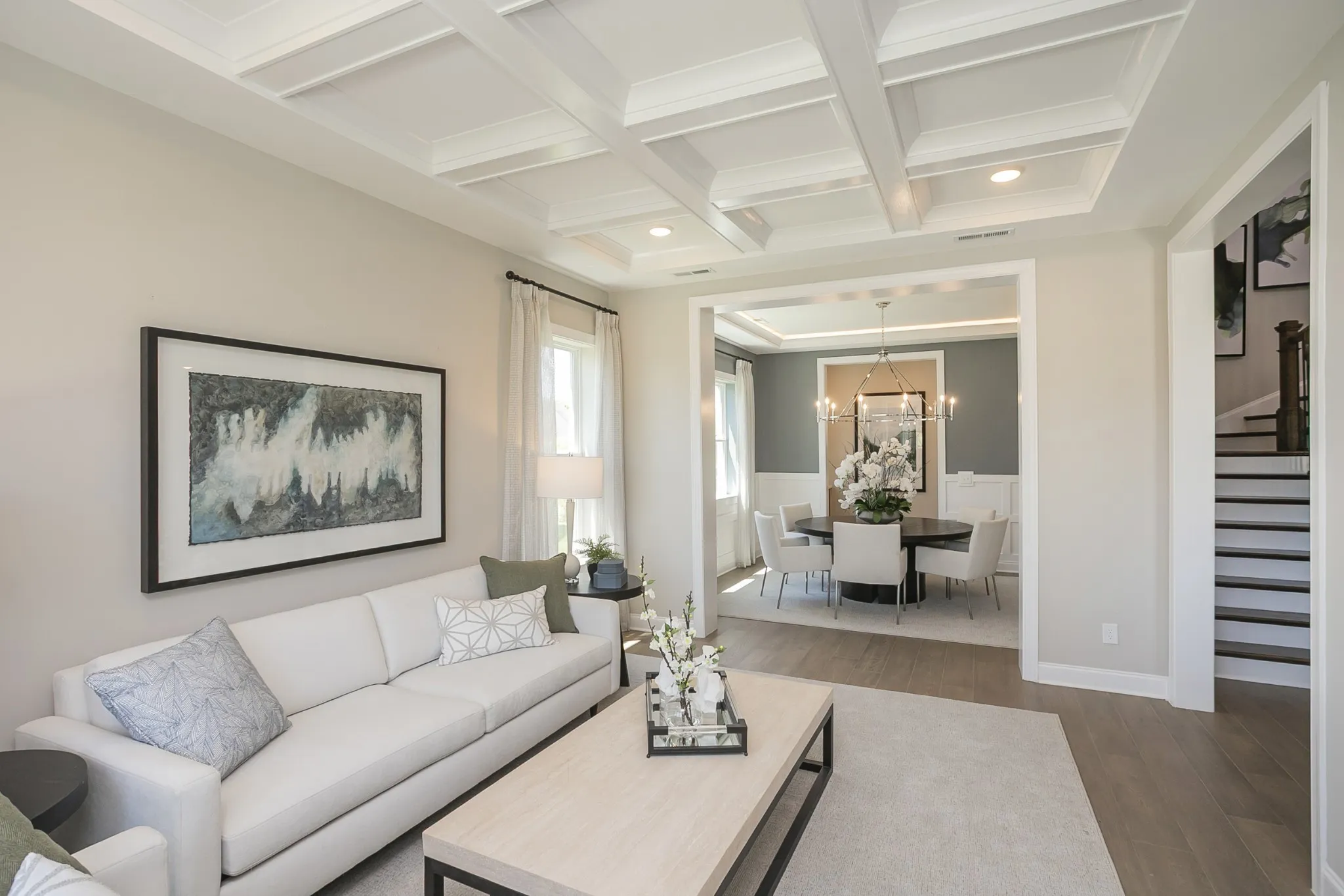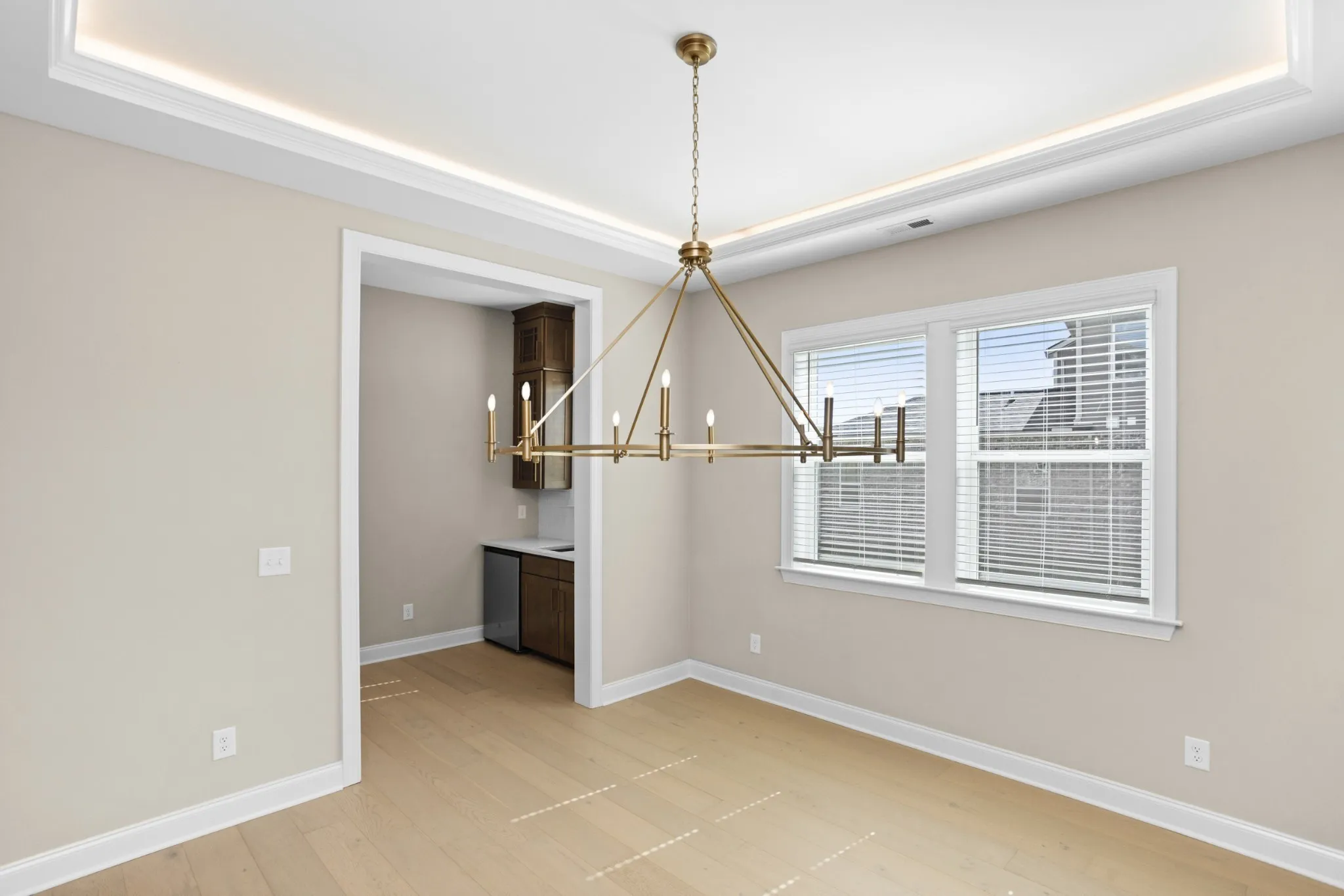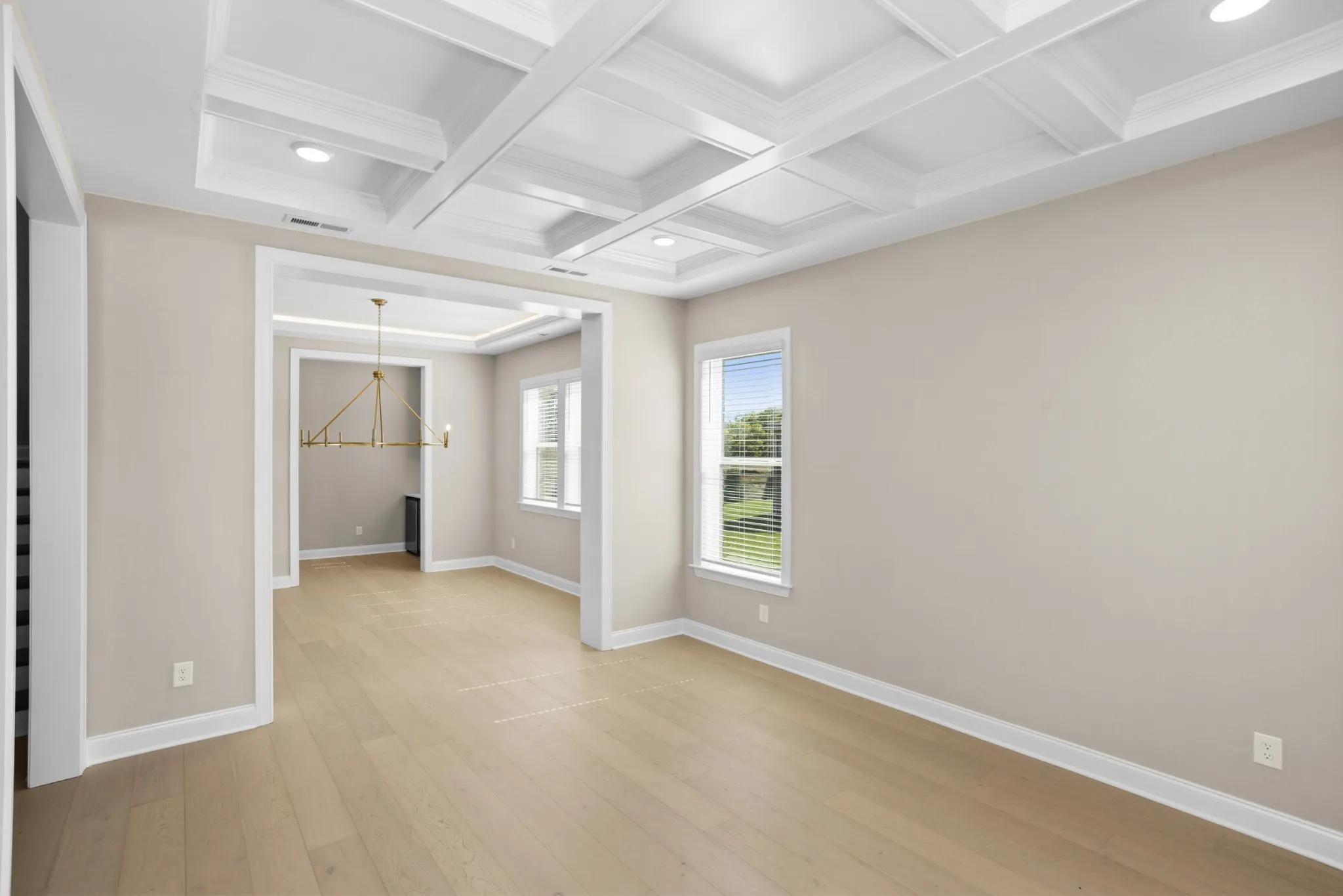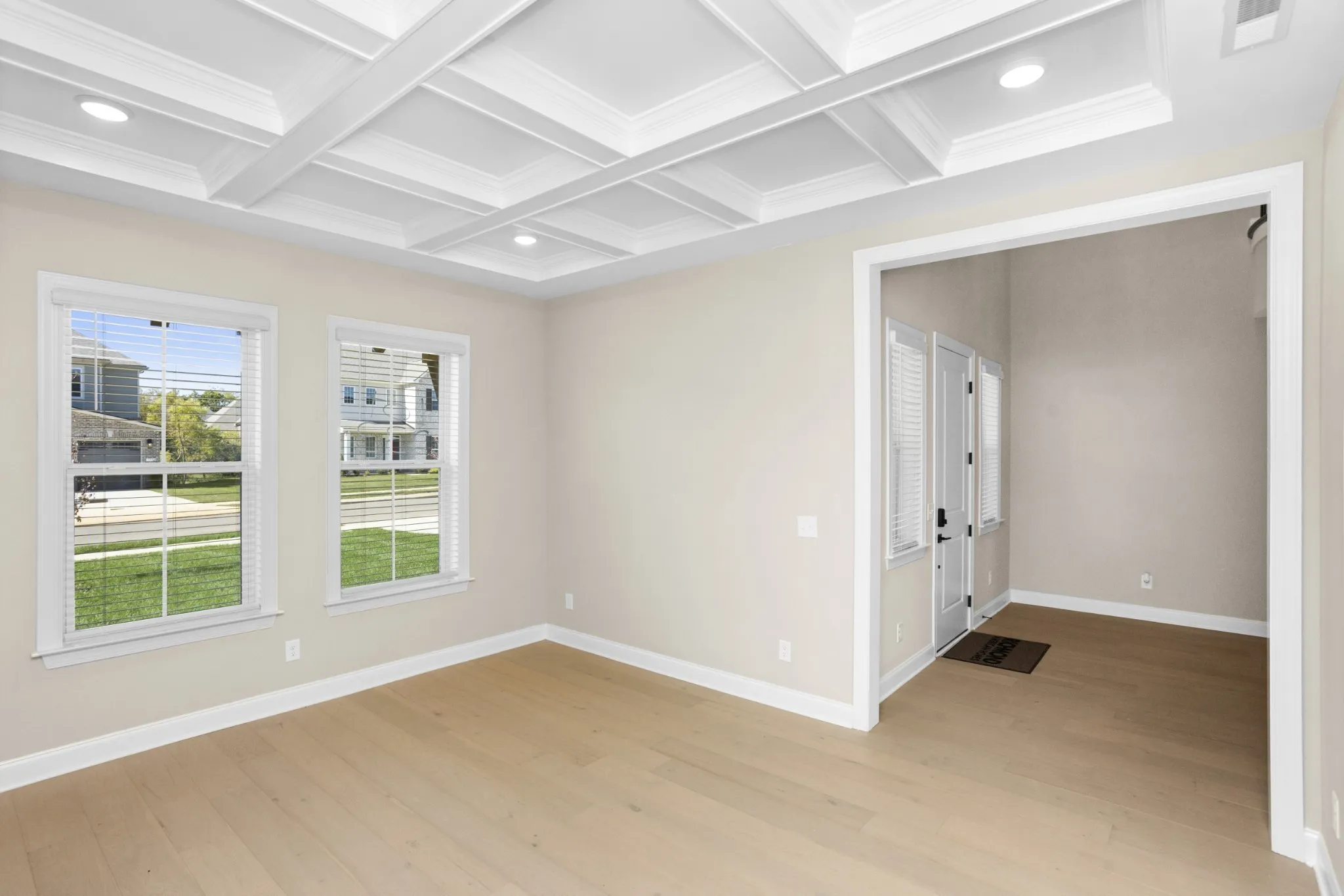 A grand two-story entry leads to an open layout with tray and beamed ceilings—perfect for festive gatherings. The gourmet kitchen, with large island and walk-in pantry, flows into a cozy breakfast nook and covered patio for holiday entertaining.