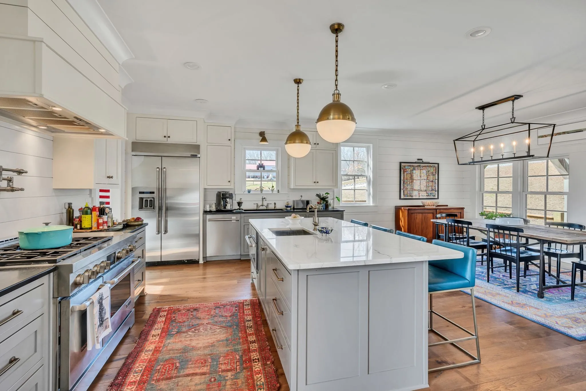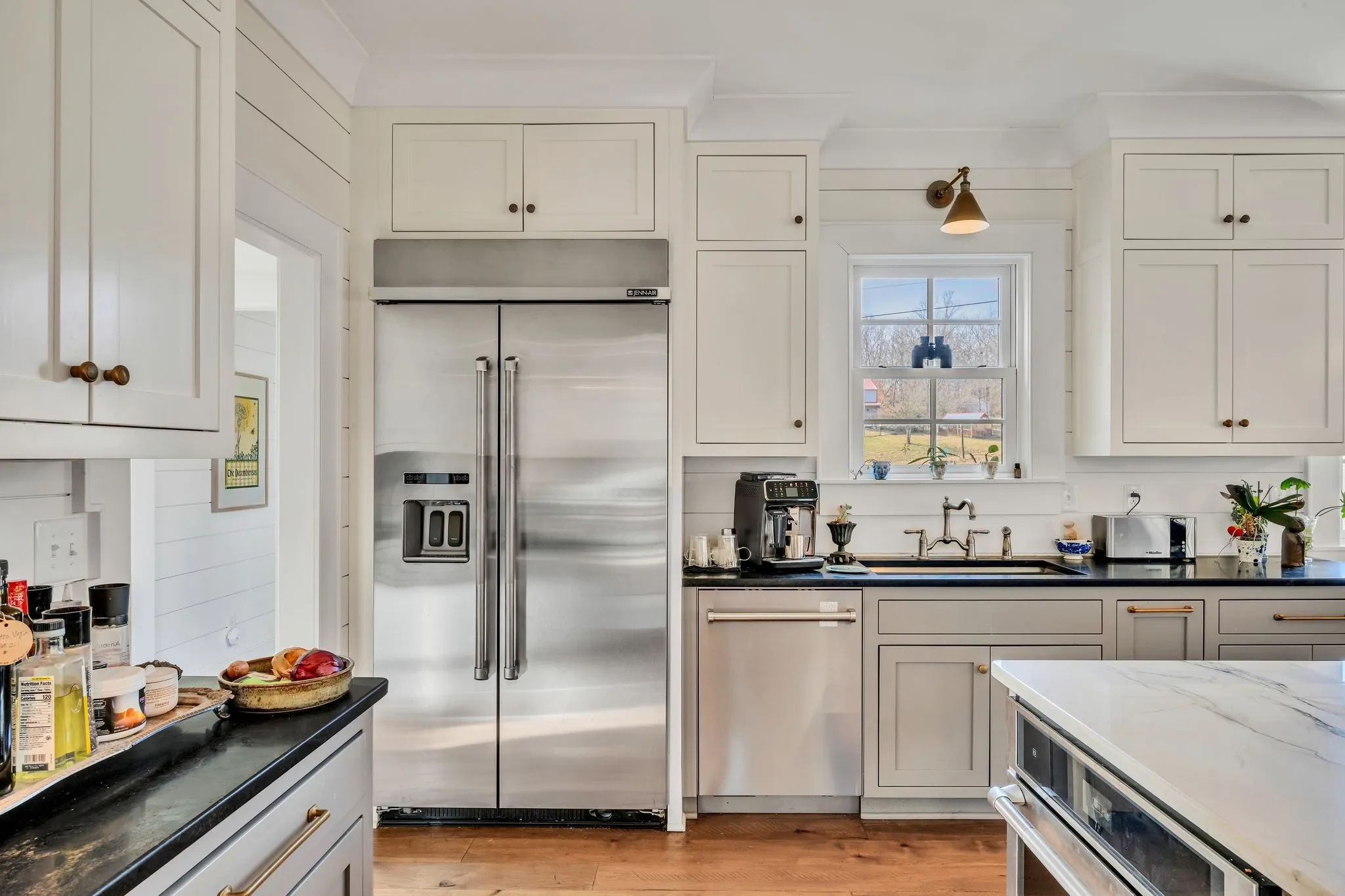 Wide plank hardwood floors, premium lighting selections & architectural details add warmth and sophistication, while the dream kitchen serves as the true heart of the home featuring high-end JennAir stainless appliances, custom Spencer Mill cabinetry, quartz surfaces, and a gourmet pot filler designed for both beauty and function.