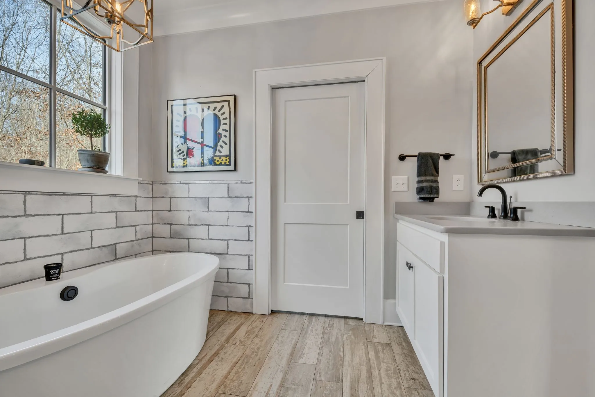 The primary suite offers a spa-worthy retreat, complete with a floating soaking tub, custom tile shower, and tranquil views of the surrounding acreage — a perfect place to unwind after a day on the land.