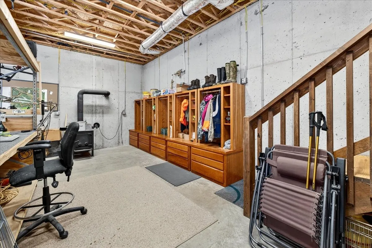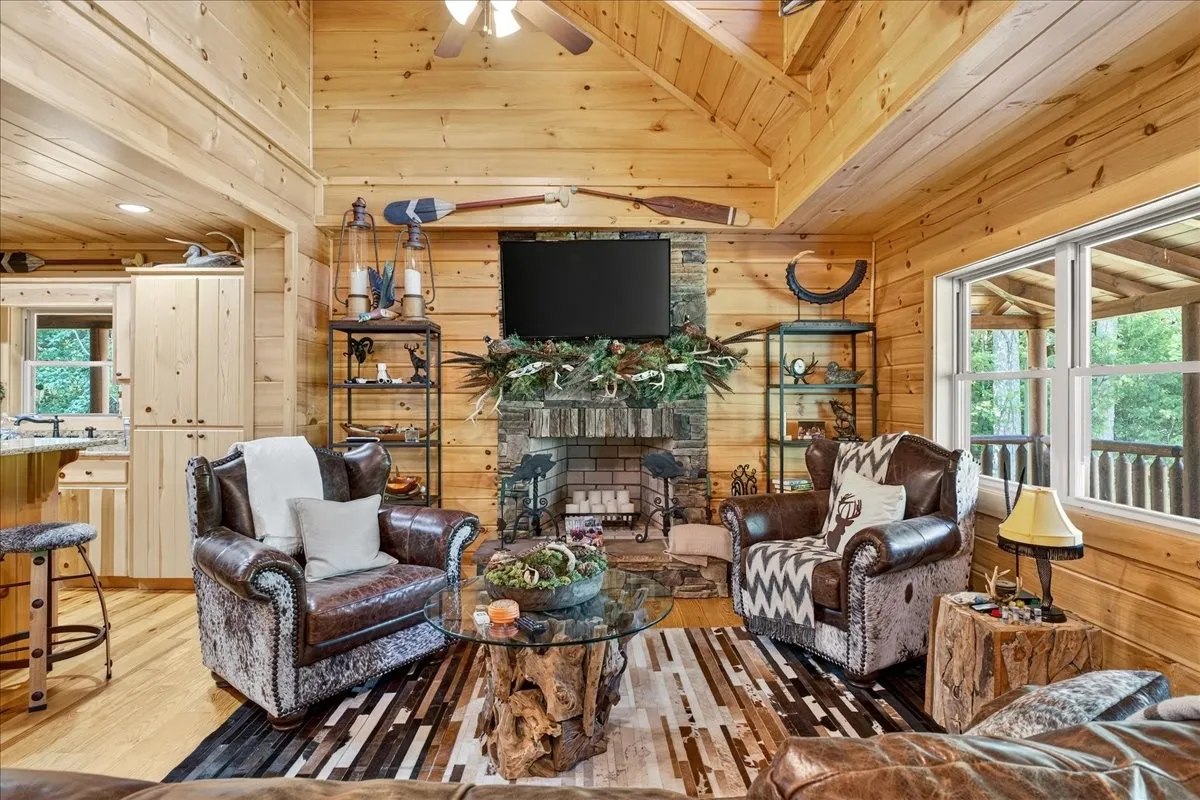 The cabin is uniquely equipped for self-sufficiency, featuring two 5,000-gallon rainwater collection tanks with integrated filtration and purification, fully tied into the home’s plumbing and switchable from city water. A substantial 40kW solar power system allows seamless operation independent of the county power grid, while maintaining full utility connectivity.