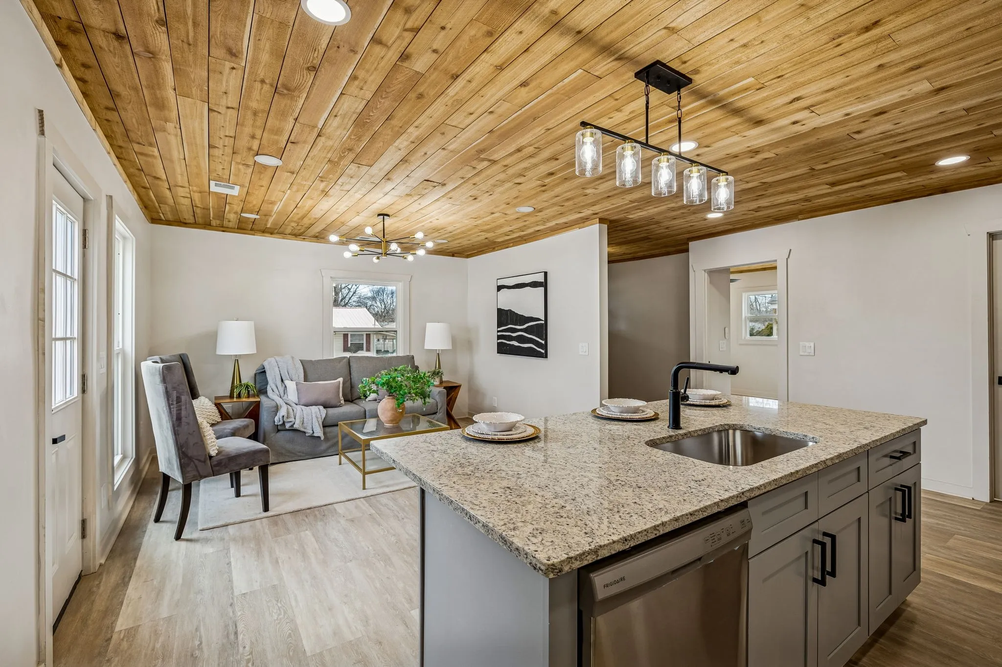 Updated flooring and a cohesive contemporary finish palette throughout give the home a fresh, updated feel. The kitchen includes granite countertops, stainless steel appliances, modern cabinetry, and subtle undermount lighting, while the bathrooms showcase clean lines and tasteful finishes. Updated lighting and plumbing fixtures in a sleek matte black finish add a consistent, modern look throughout the home.