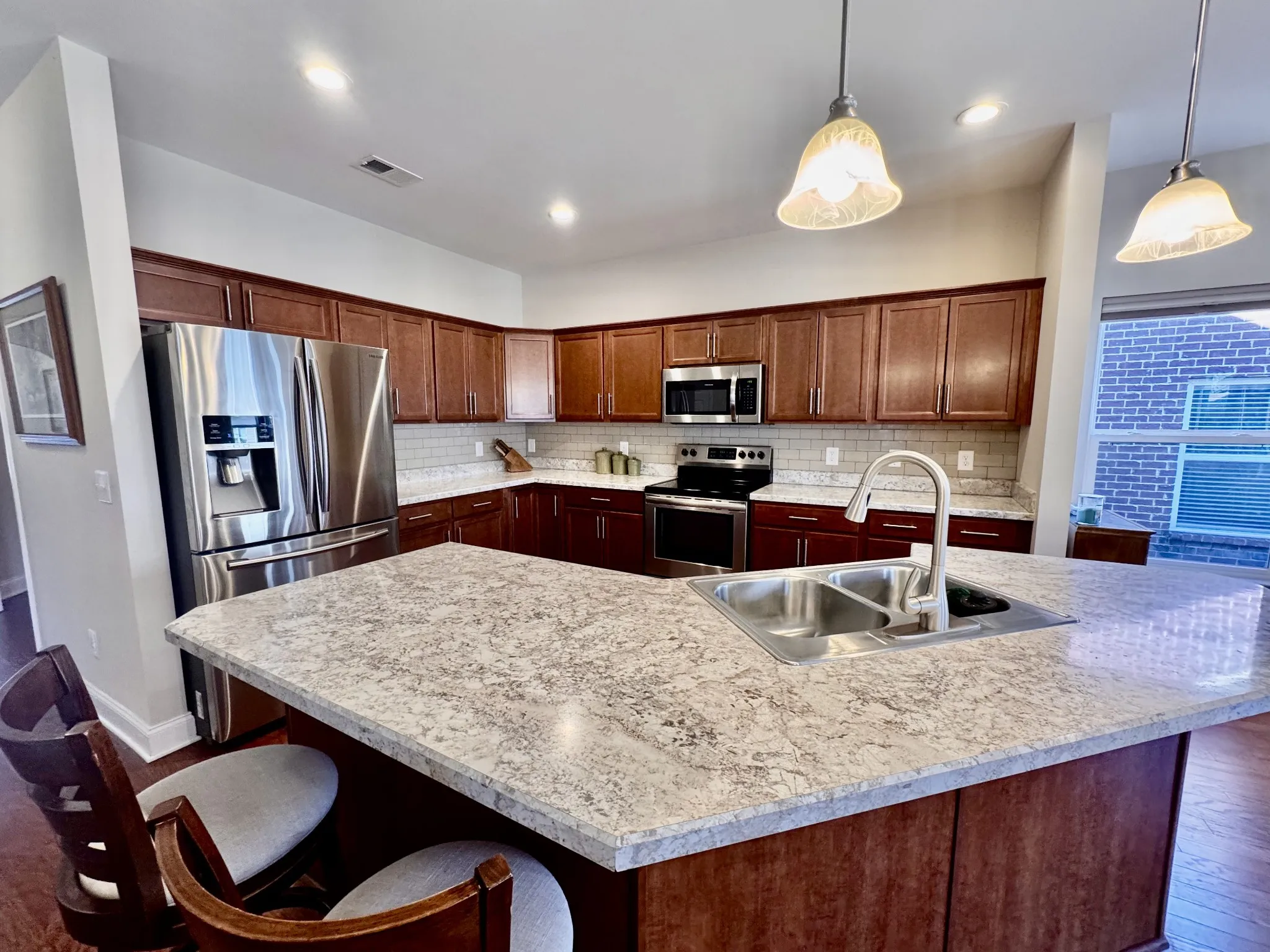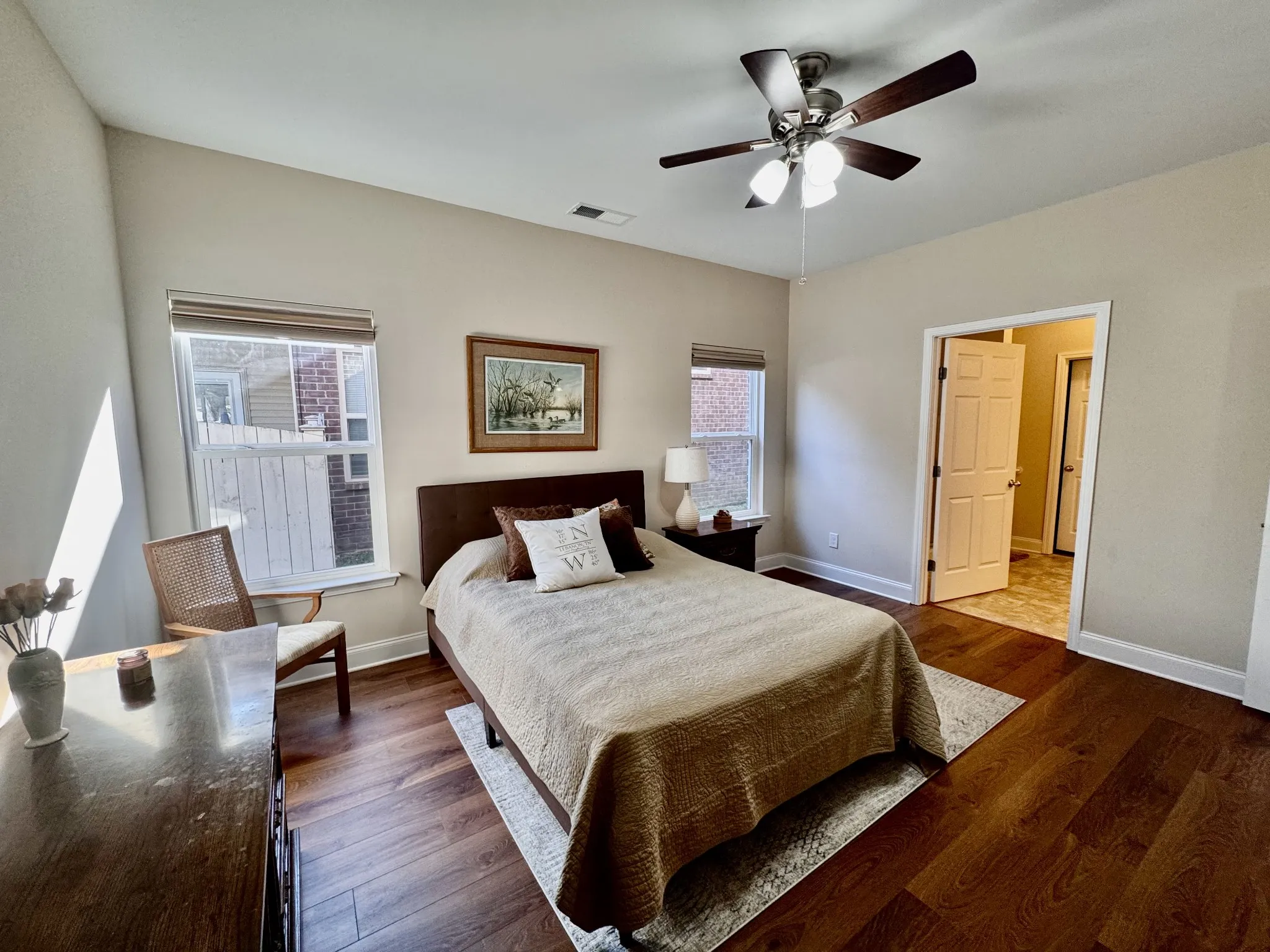 Inside, enjoy a bright, open floor plan with hardwood floors throughout (no carpet!). The kitchen is designed to impress with plenty of countertop space, stainless steel appliances, and seamless flow into the main living area ideal for everyday living and entertaining. You’ll love the thoughtful upgrades, including custom blinds in the living room and bedrooms, custom closet organizers in both bedroom closets and the pantry, and a spacious primary suite featuring a large walk-in closet. Plus, the washer is new in 2024 for added peace of mind.