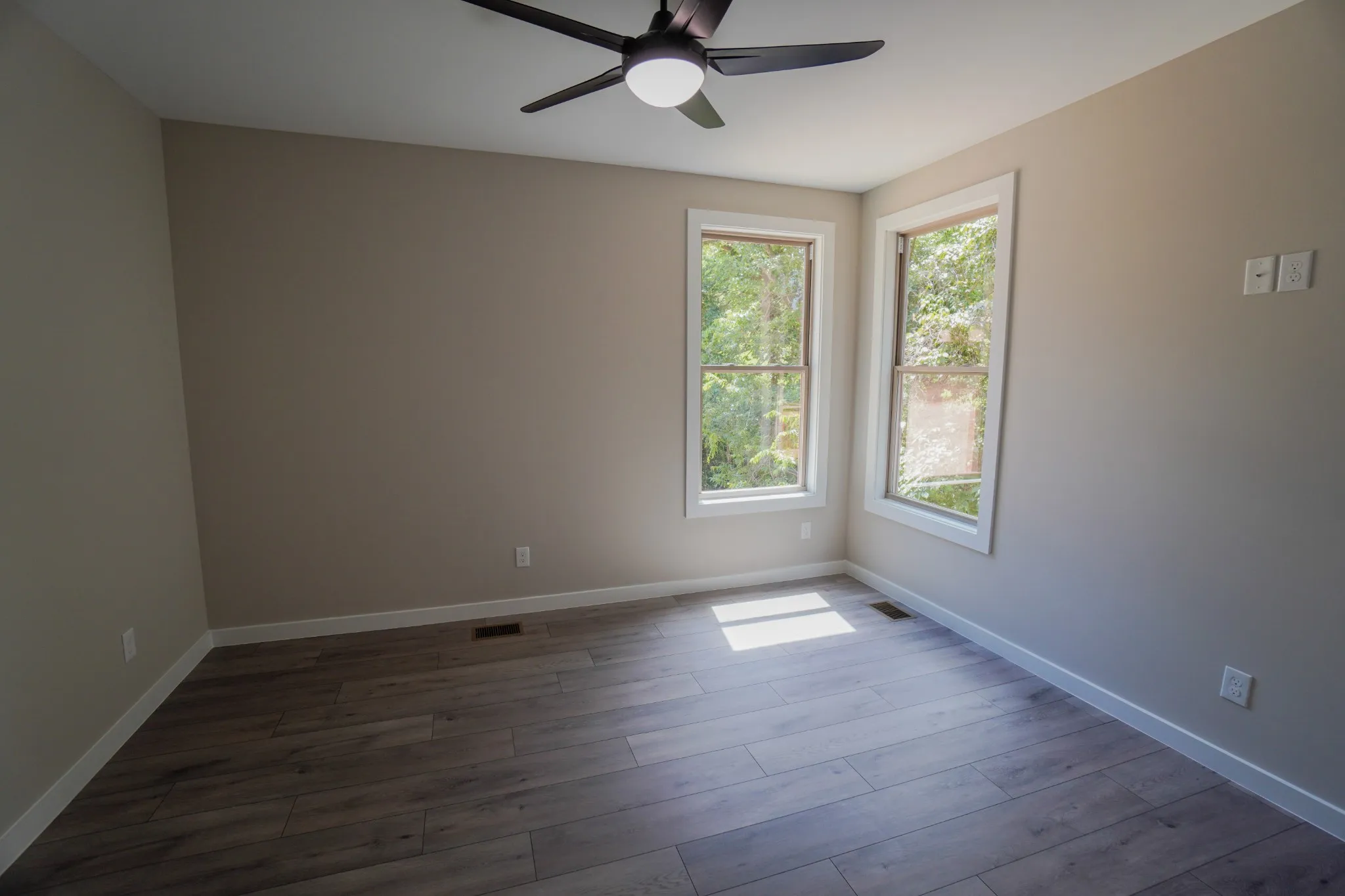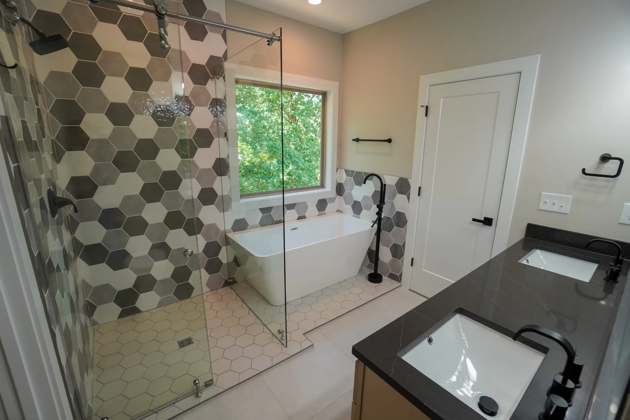 The primary suite includes a spa-inspired bath with dual vanities, bold hexagon tile accents, matte black fixtures, and a glass walk-in shower. Enjoy the elevated covered deck with ceiling fan and serene wooded views.