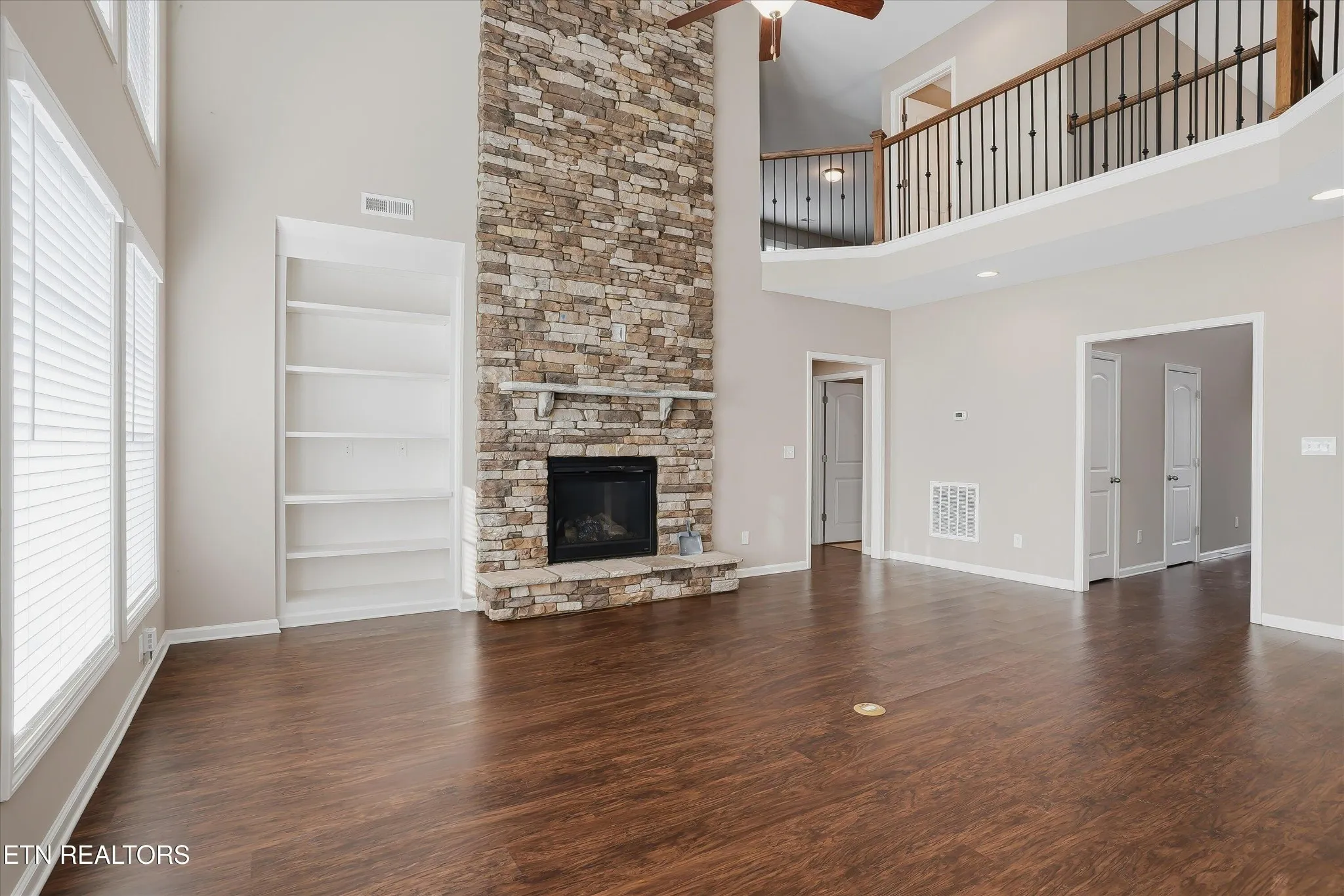 The main level showcases an open family room with a dramatic two-story ceiling and a wall of tall windows overlooking the backyard, filling the space with natural light. An optional inside chase fireplace with an adjacent bookcase adds warmth and character. A railed second-floor catwalk overlooks both the family room and the impressive two-story foyer, enhancing the home’s open and airy feel. Nine-foot ceilings further elevate the spacious design. The first-floor primary suite features a tray ceiling and a large bay window with views of the rear yard. The luxury primary bath includes a garden tub, separate shower, and double bowl vanity.