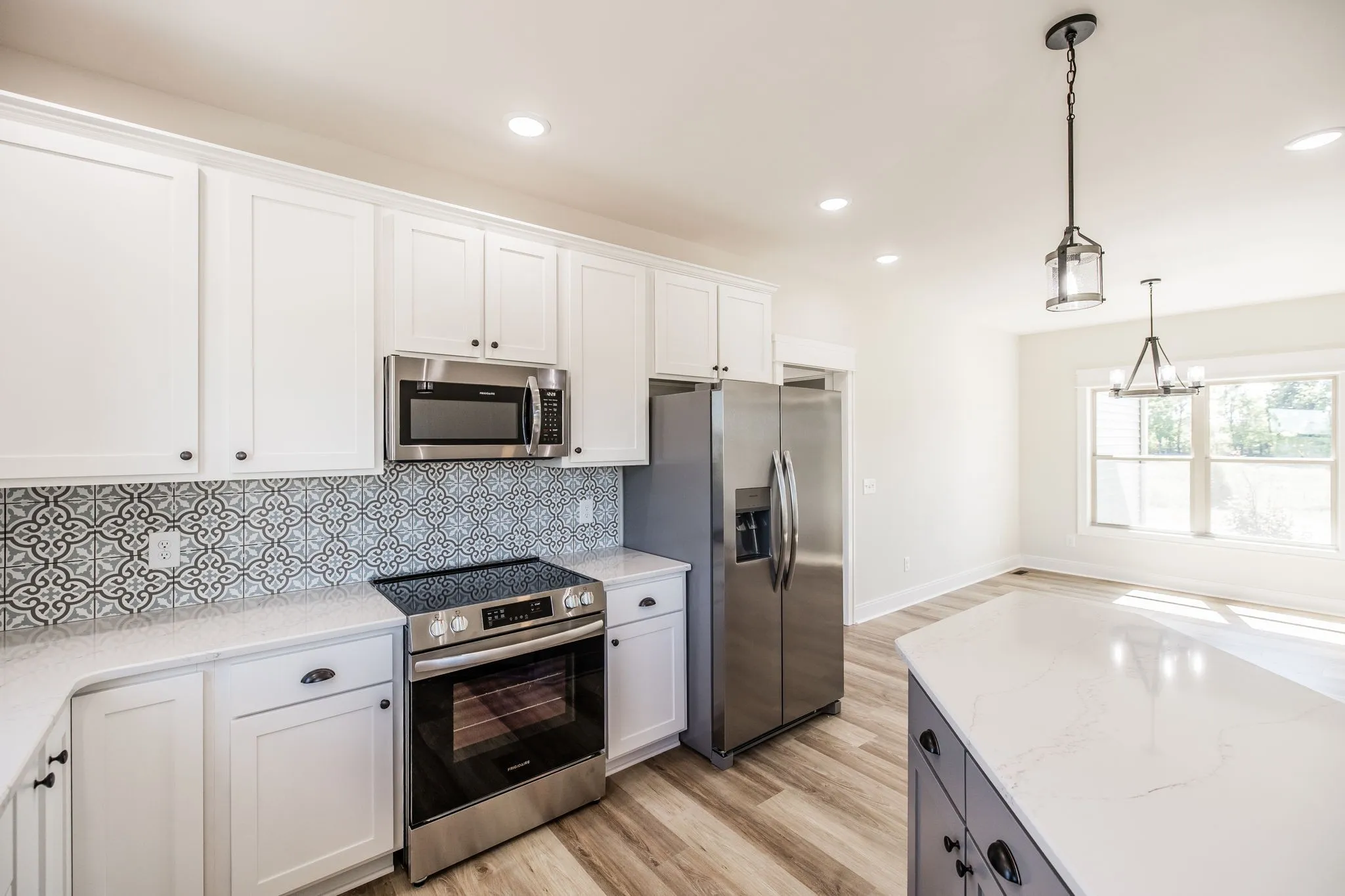 1204 Vickie Lane offers three bedrooms, two bathrooms, and a spacious bonus room above the garage. The open layout connects the living area, dining room and kitchen which features solid surface countertops, tile backsplash, stainless steel appliance, and plenty of cabinet space. Laminate wood flooring runs throughout the house with zero carpet, and both bathrooms include durable tile flooring.