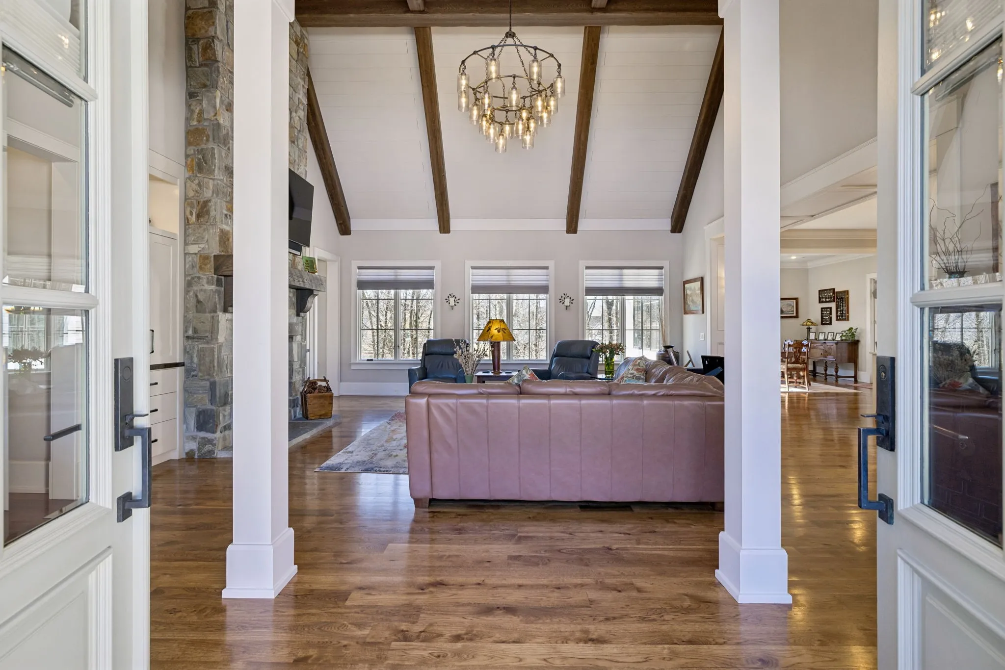Step into one of the rare gems in The Grove. This beautiful, Custom Hatcliff Construction-built home sits on nearly three-quarters of an acre on one of the most coveted streets in the community. Tall hardwoods shade the house while allowing scenic views of Two of The Grove golf courses’ fairways. At the front, a courtyard-style entrance allows both a 4-car garage and a full front porch to greet you as you arrive home. From the front porch, you’ll step into almost 4500 Square Feet of Maximized living. The great room has vaulted ceilings and rich timber beams. The Kitchen is equipped with a Wolf steam oven, Wolf convection oven, Wolf gas stovetop, and a Sub-Zero refrigerator. Off the kitchen is a lovely screened-in porch with a gas fireplace. The Primary bedroom Suite with heated bathroom floors, as well as a full guest suite, are on the main level. An elevator is built into the house, a truly rare feature for a two-story house. The basement has a Full Bar! A full Wine Cellar! Two Bedrooms and Bathrooms, and an emergency Safe Room. And any storm can be weathered with the Generac Whole Home Generator built into the house. Out back is a deck with a sunken jacuzzi! Maximized luxury features are combined with manageable packaging to create a truly lovely lifestyle!!