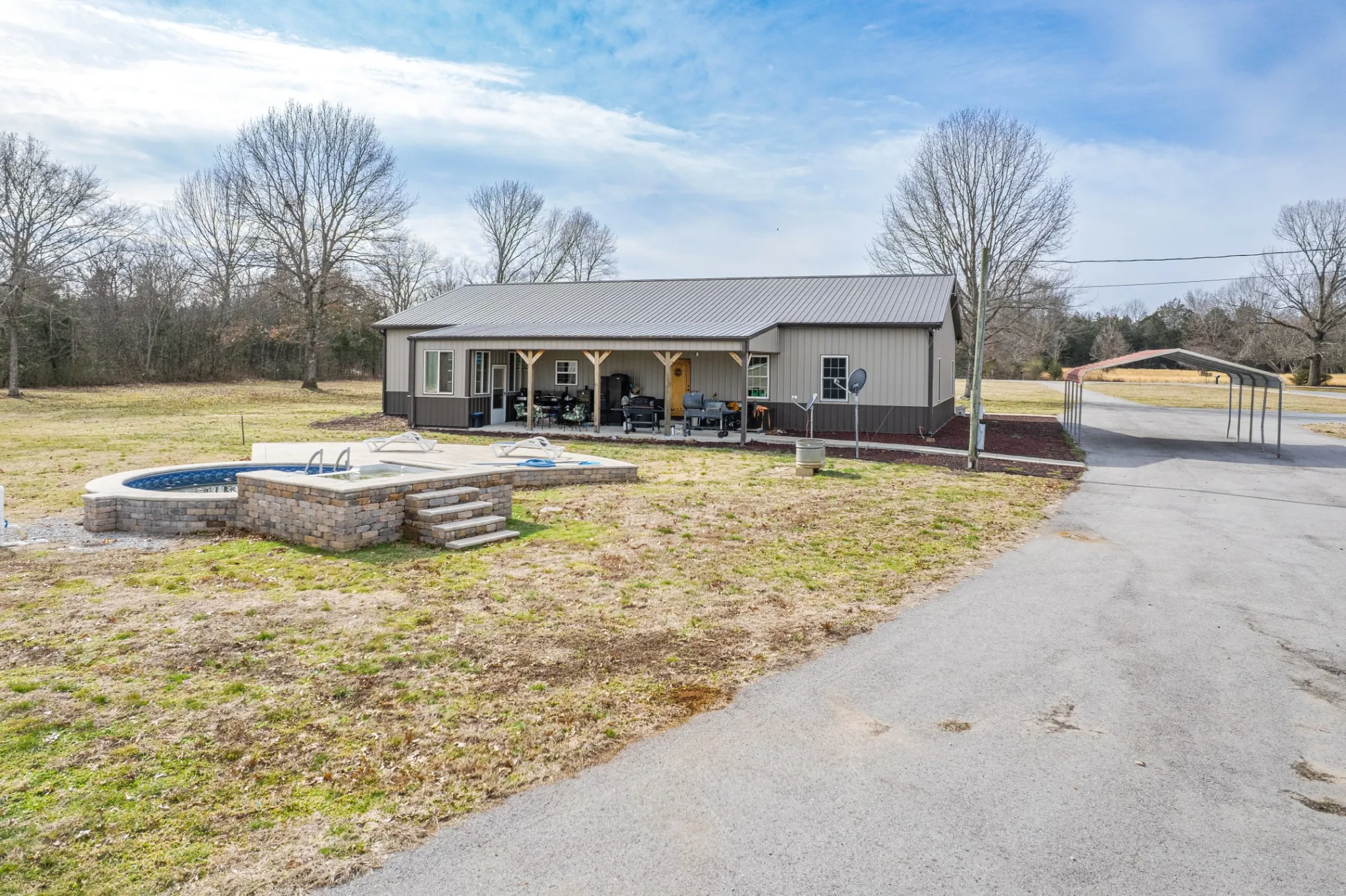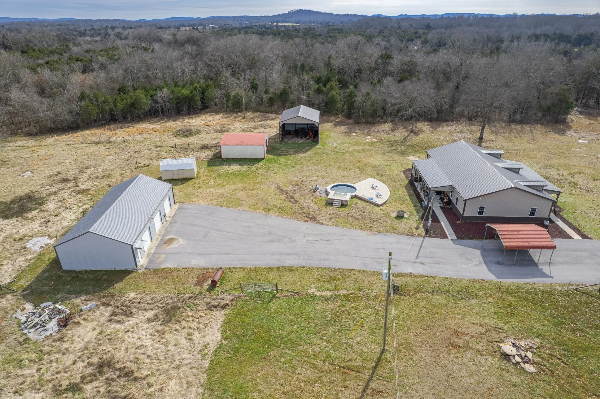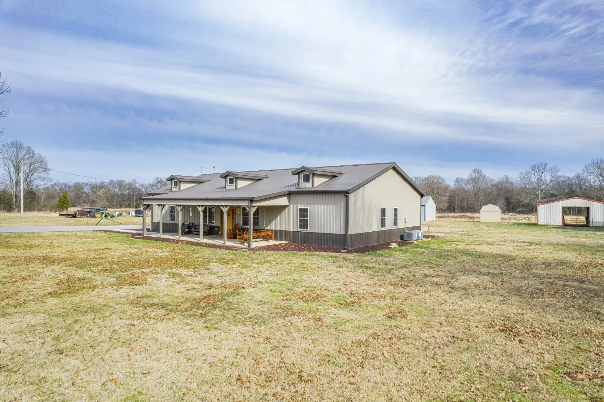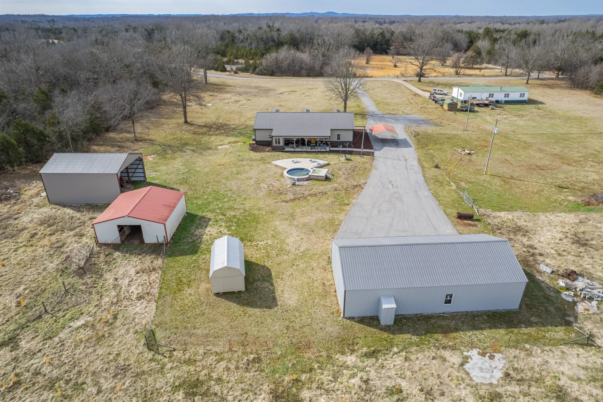 Discover the perfect blend of country living and modern comfort in this beautifully designed 3-bedroom, 2- bath barndominium. With it’s open concept and soaring ceilings, this home offers spacious living with a warm, inviting feel. This home sits on a 23.87 acre level pasture with a semi-above ground pool and a large outbuilding with 2 smaller buildings.