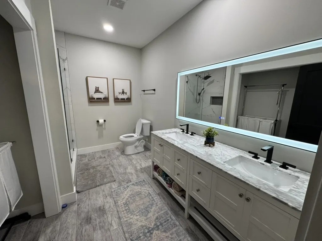The home includes spray foam insulation throughout, a gas tankless water heater, and a high-efficiency variable-speed Carrier HVAC system for exceptional energy efficiency and comfort. The kitchen is designed to impress with marble countertops and an oversized gas range, perfect for everyday living and entertaining. High ceilings throughout enhance the open, airy feel of the home.