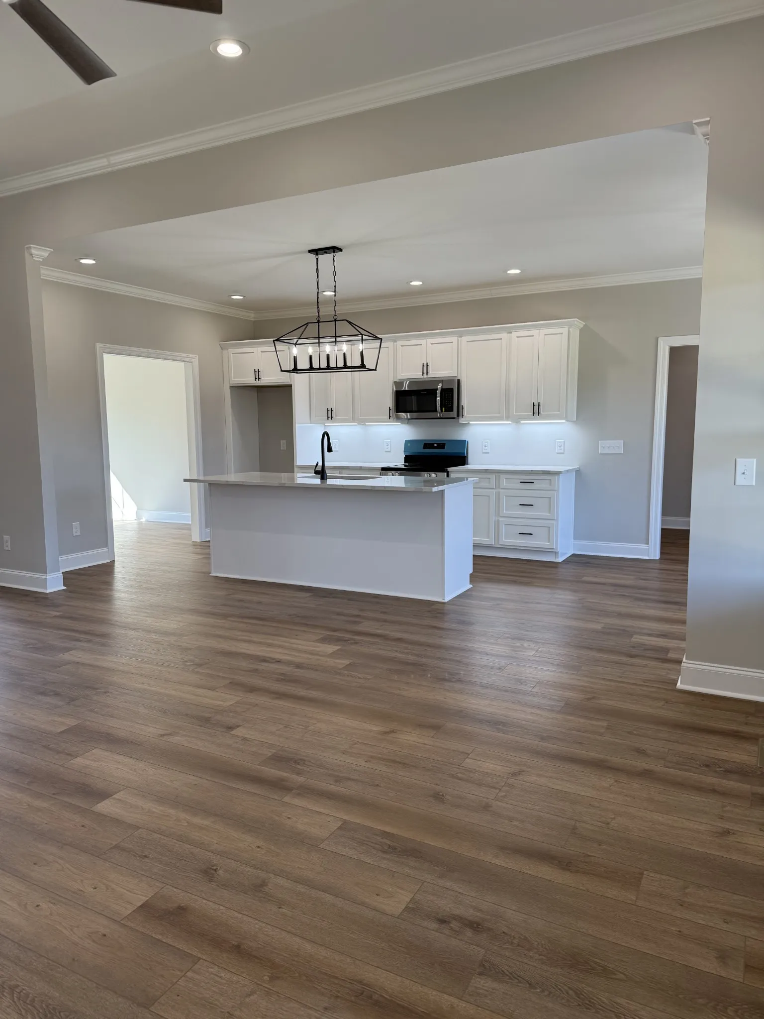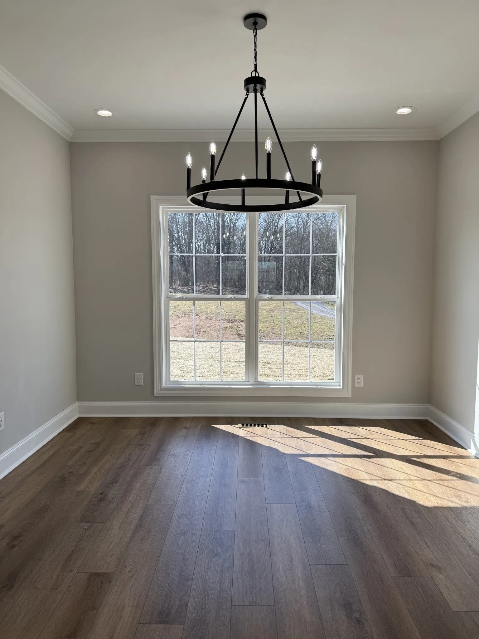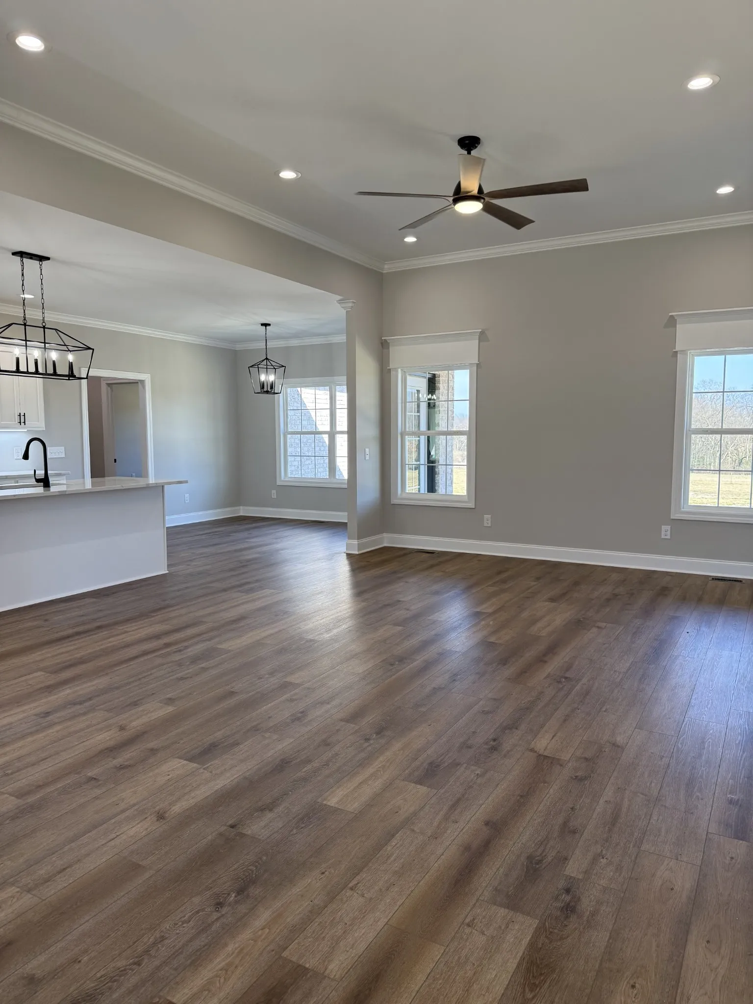 Beautiful New 3 bedroom, 2 bathroom home on 5+ acres!! This property has so much to offer with its lovely open floor plan, separate dining room, spacious primary bedroom with an en-suite bathroom featuring a tile shower, and extra large closet. The impressive upgrades include quartz countertops in kitchen and bathrooms, heavy trim and molding, soft close cabinets, stainless steel appliances, custom light fixtures, under cabinet lighting in kitchen, and stair tread lights. The flooring is high quality luxury vinyl plank, with tile in the wet areas, carpet in the bonus room, and hardwood steps. The outside is just as stunning with a covered front porch, and large covered back porch where you can enjoy your privacy and the beautiful country view. This home has it all and is move in ready!