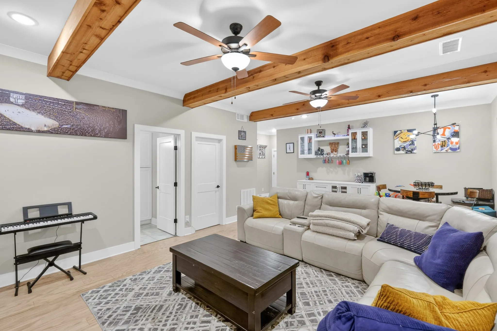 The walk-out lower level opens to a fully enclosed patio that is heated and cooled, complete with an electric roll-up door—creating a versatile space ideal for year-round entertaining.