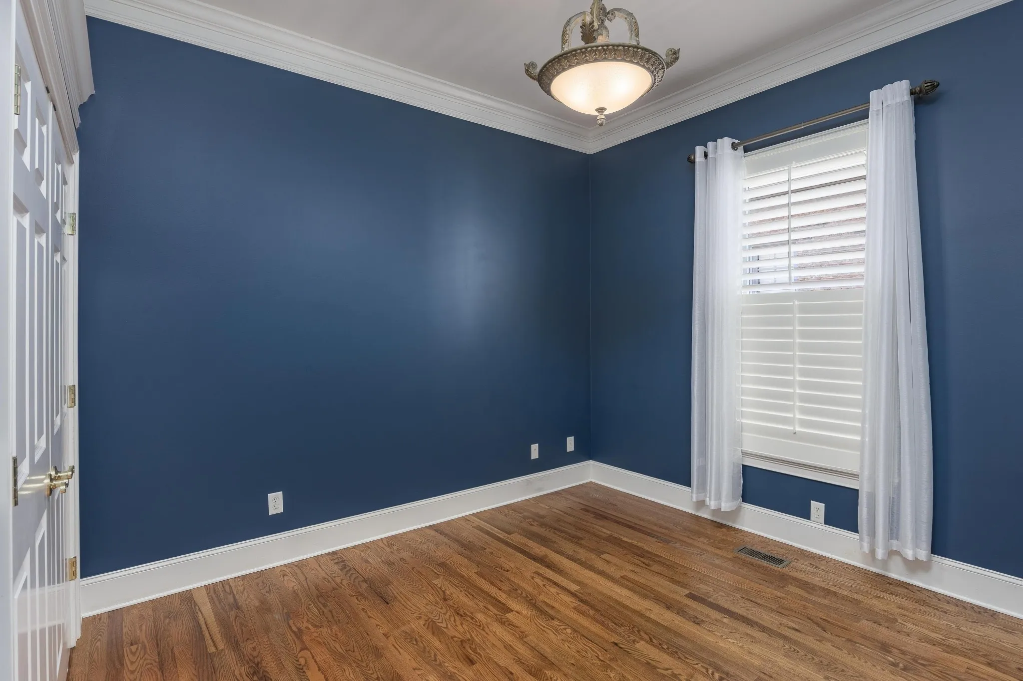 The primary suite, located on the main level, is a true retreat, featuring soaring vaulted ceilings, rich hardwood floors, and abundant natural light. Elegant French doors with plantation shutters lead to the private screened porch, offering a seamless indoor-outdoor retreat just off the bedroom. The transom window above adds architectural charm and enhances the bright, airy feel of the space—perfect for relaxing at the end of the day.
