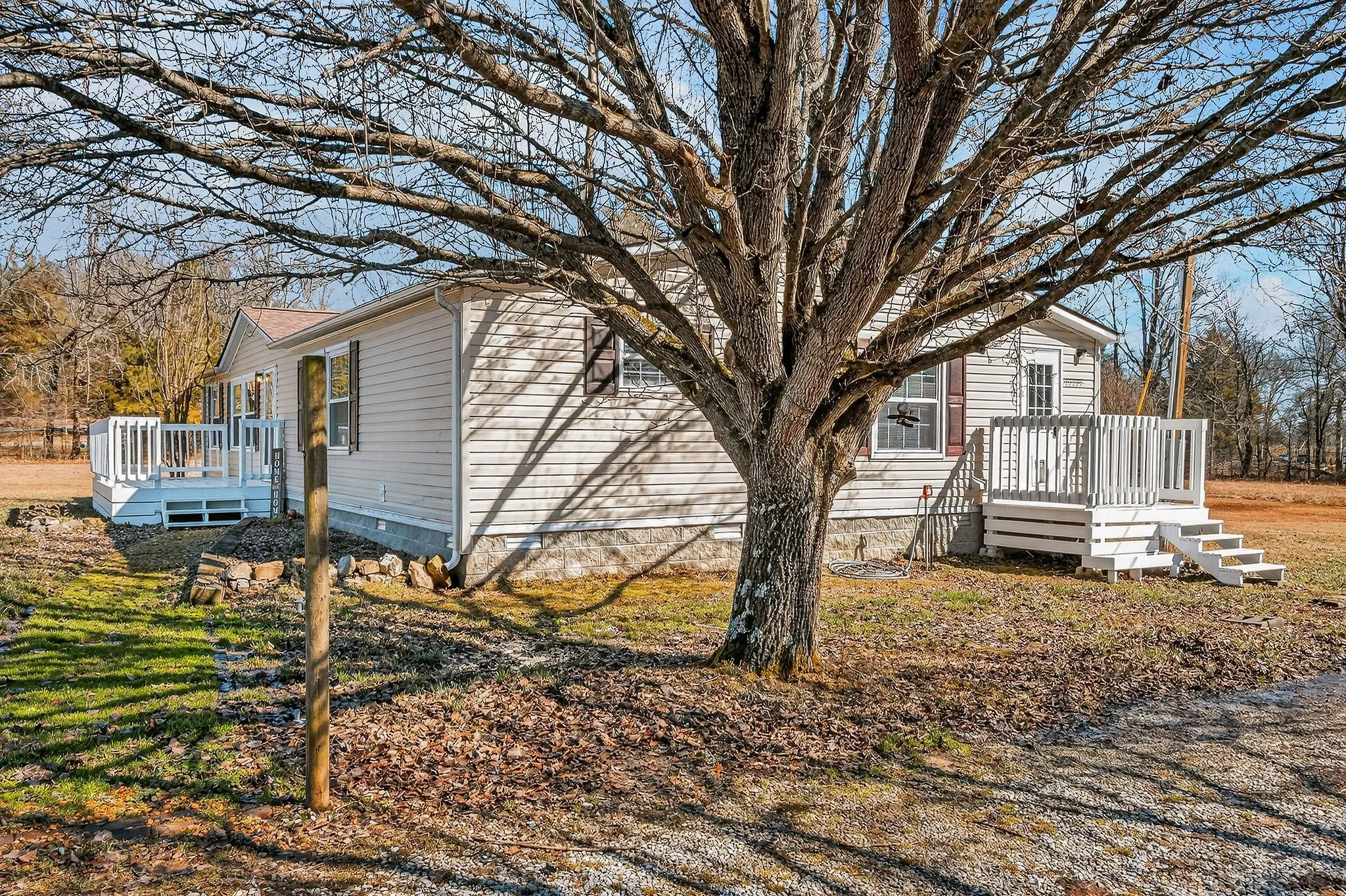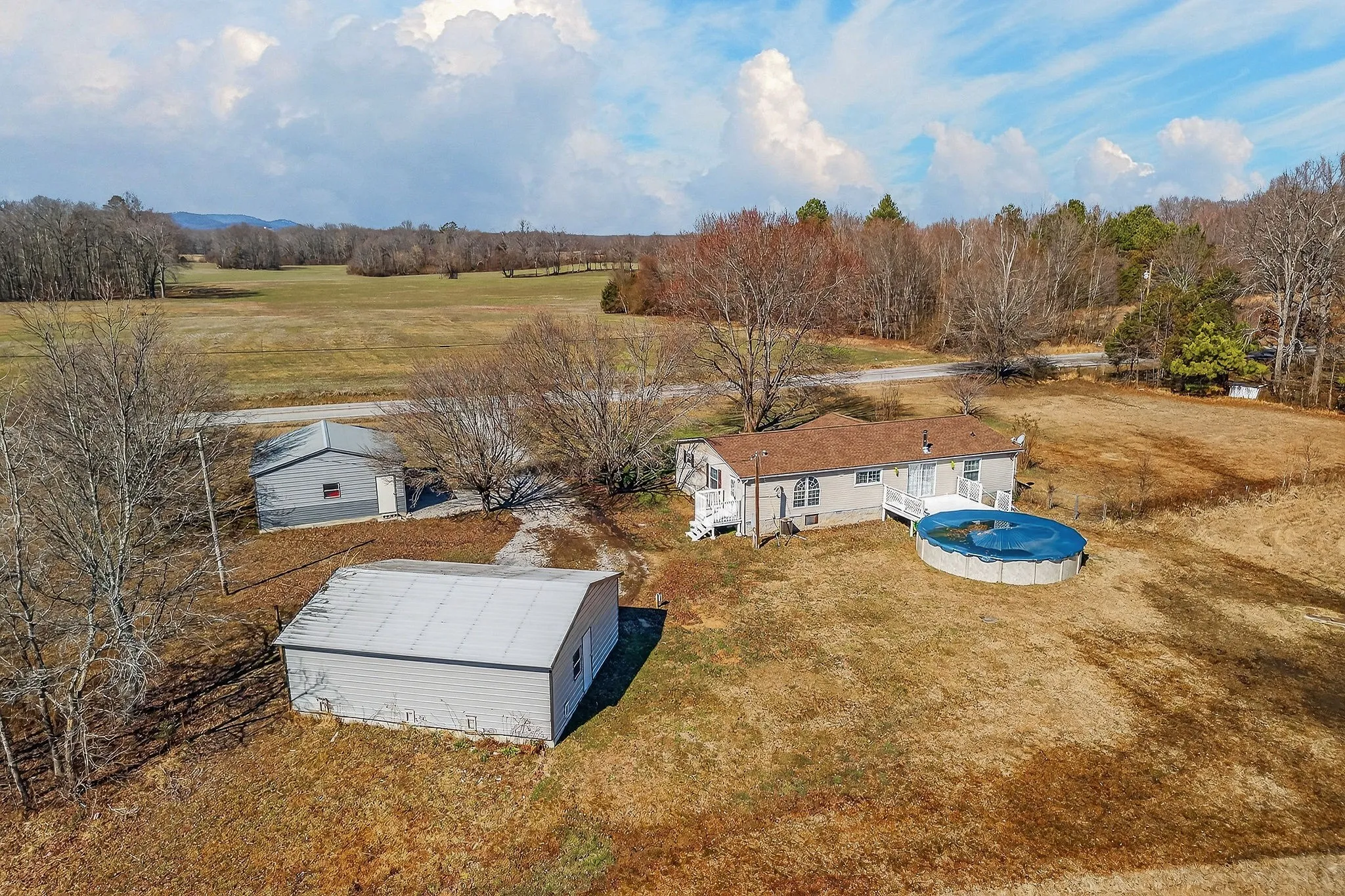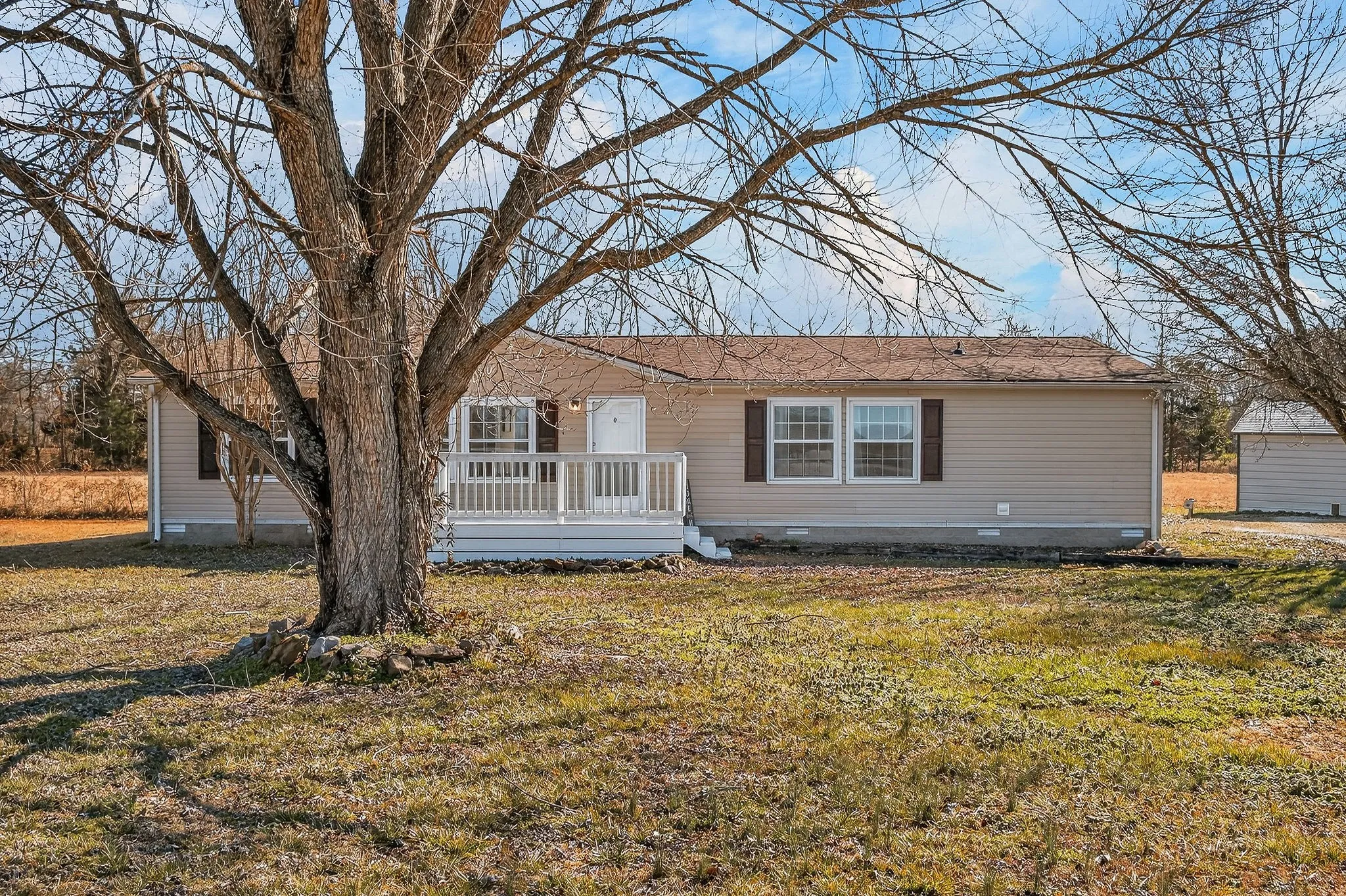 Outdoor features include a deck and porch, along with two detached 2-car garages providing a total of four covered spaces. The garage closest to the house has electricity, and shelving in both garages will remain. Annual taxes are approximately $839, and there is no HOA. Conveniently located near the DeKalb County line with easy access to both McMinnville and Smithville.