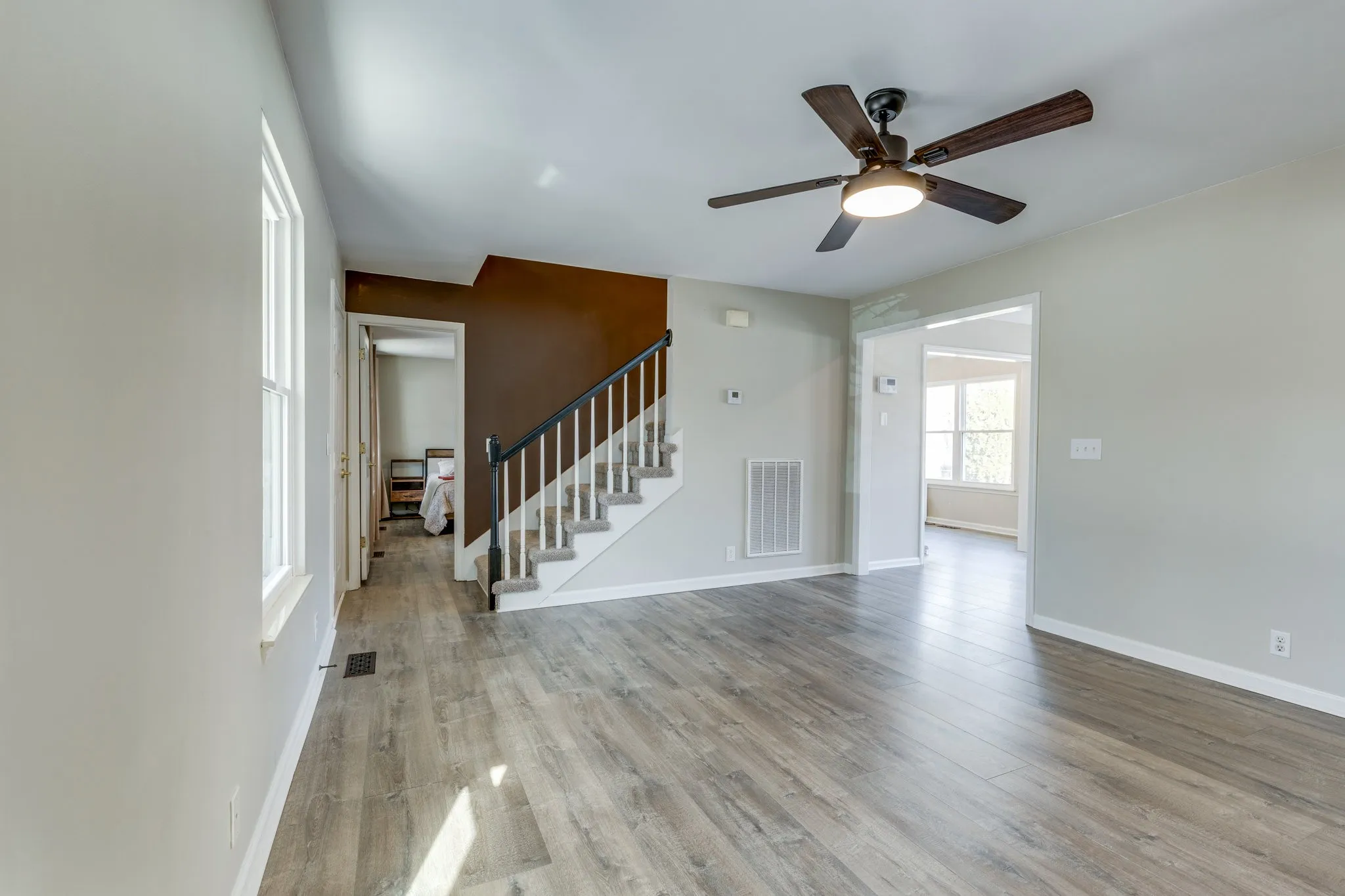 The primary suite is conveniently located on the main level, while two additional bedrooms and flexible space upstairs provide room for family, guests, or a home office setup.