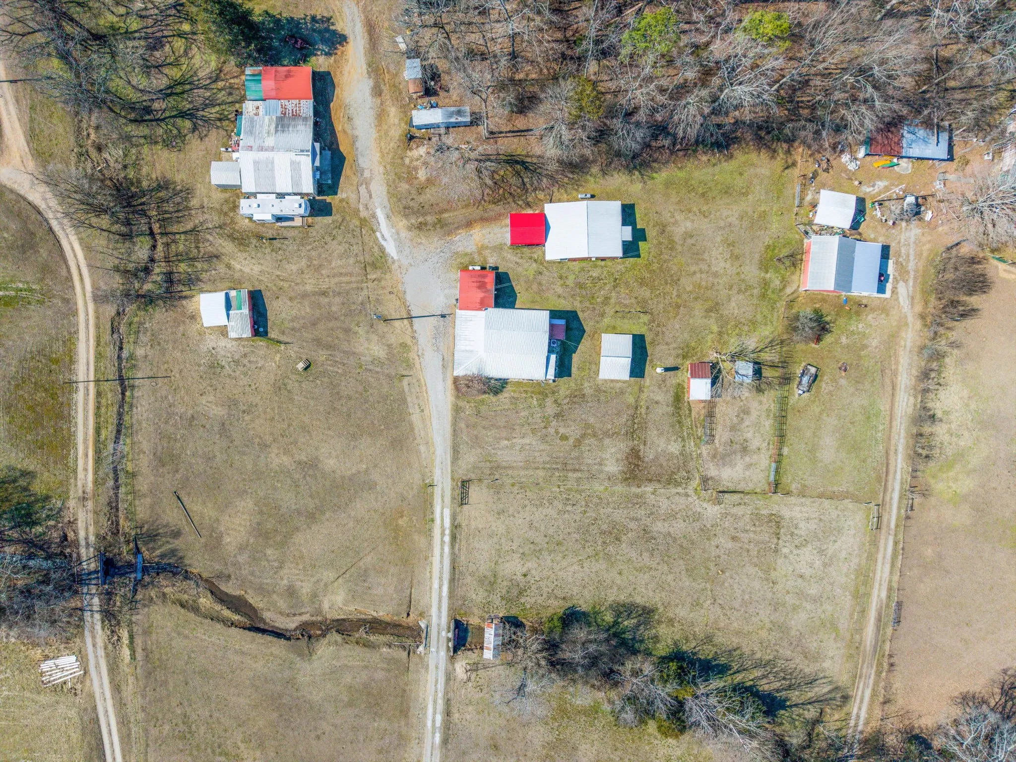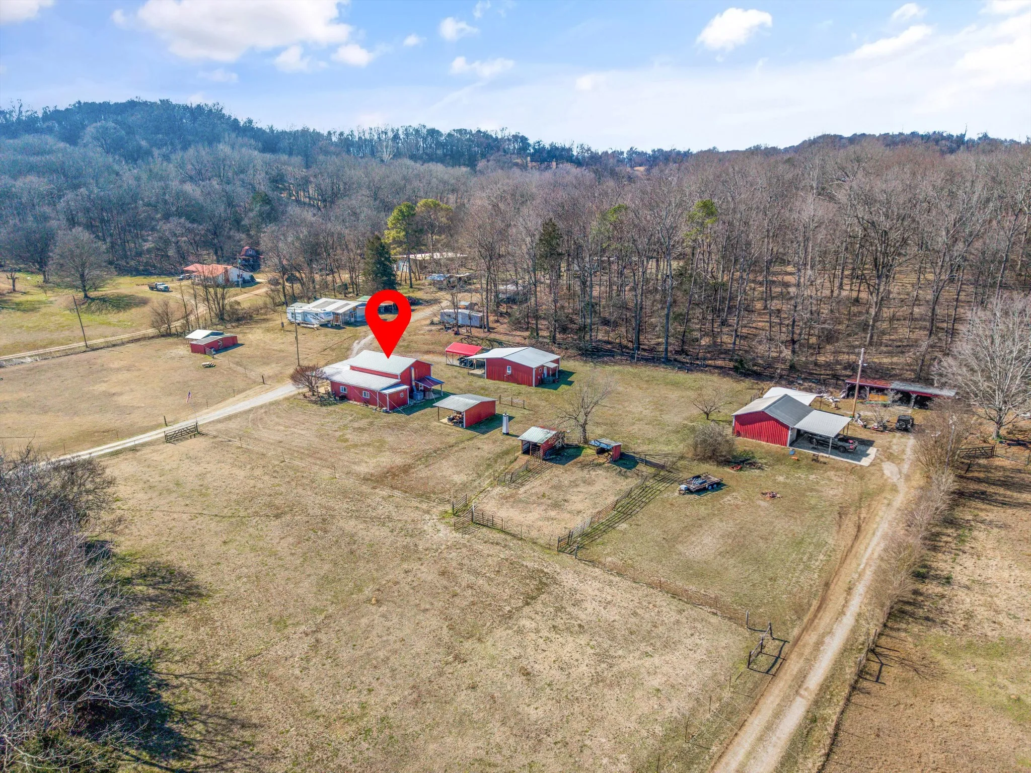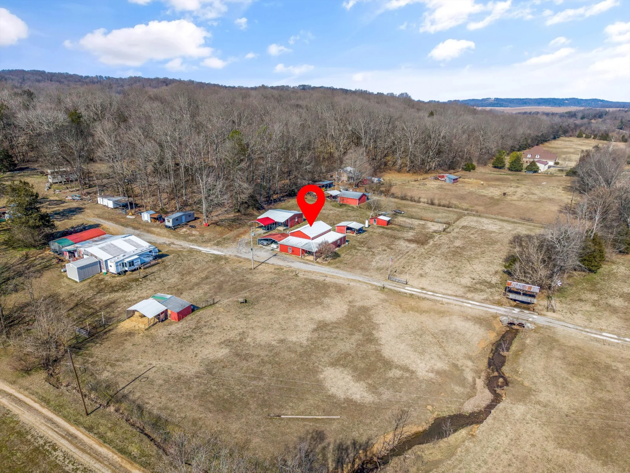 The main home has been thoughtfully upgraded and offers 3 bedrooms and 2 full baths with a desirable open floor plan, perfect for everyday living and entertaining. Major systems including the HVAC and water heater were updated in 2019, providing comfort and efficiency. Natural light flows through the living spaces, and the layout offers both functionality and warmth. Adding exceptional value is a second home on the property, approximately 900 sq ft, featuring 2 bedrooms and 1 full bath. This space is ideal as a mother-in-law suite, guest house, or rental opportunity, offering privacy while remaining conveniently close to the main residence. Additional improvements include multiple carports and two storage sheds, providing ample room for equipment, tools, and farm essentials. With a blend of usable pasture, wooded privacy, and water features, this property offers endless possibilities—whether you envision a working mini-farm, multigenerational living, or a quiet country retreat.