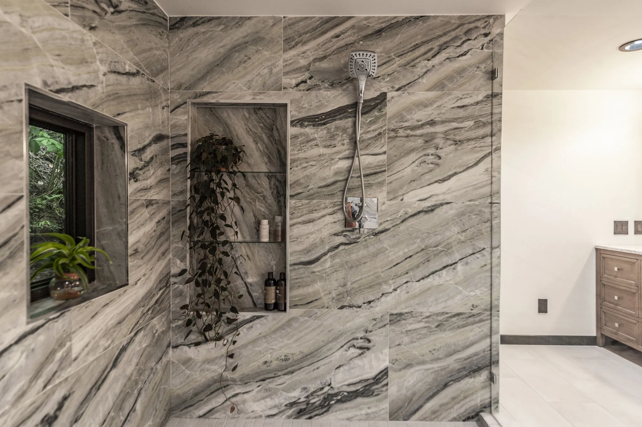 The primary suite feels like a spa retreat, complete with an oversized walk-in shower, freestanding soaking tub, and dual marble vanities. Secondary baths are equally elevated with quartz counters and sleek glass enclosures.