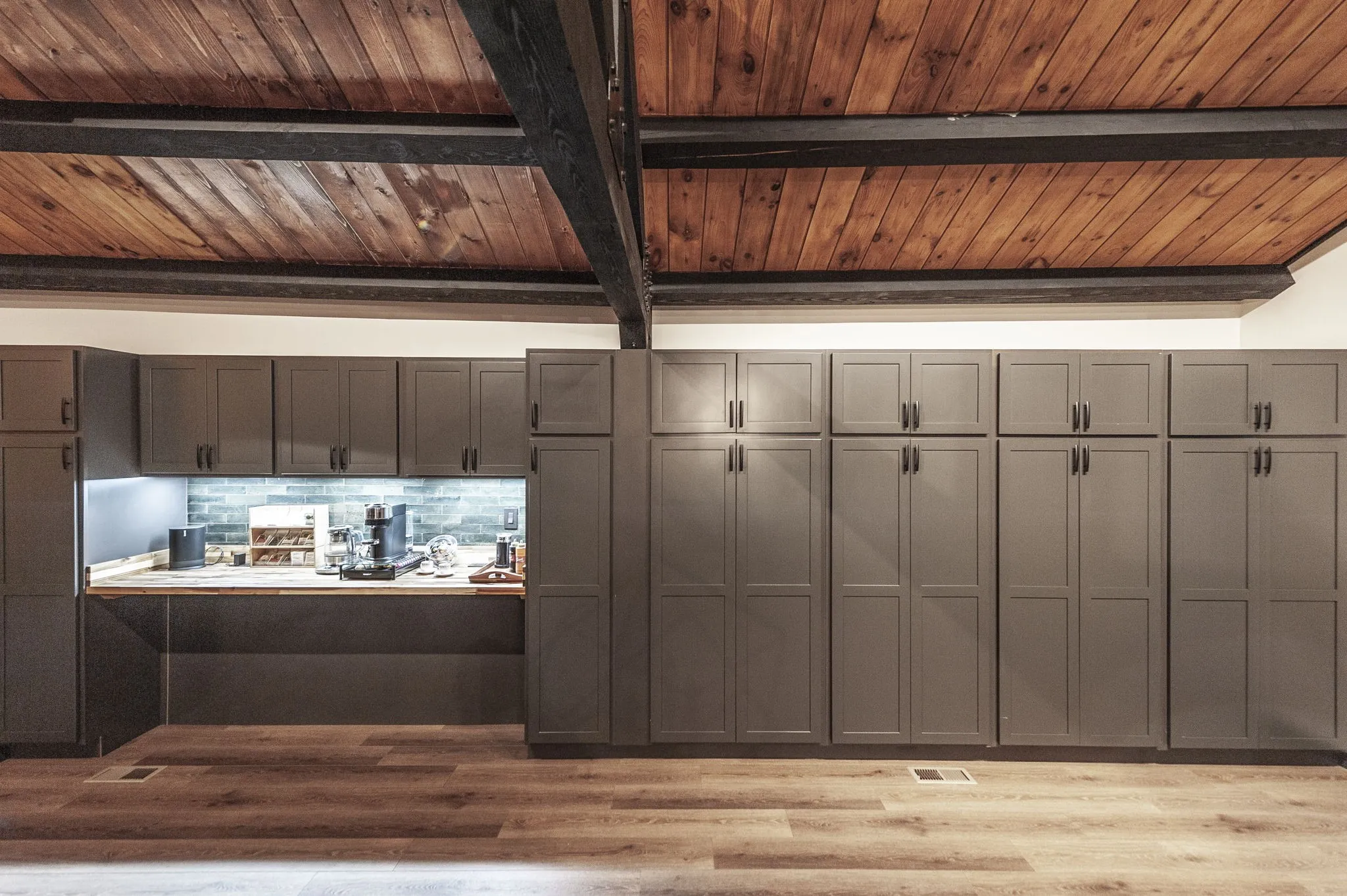 The custom designed kitchen is a true centerpiece, featuring a large quartz island with built-in motorized outlets (including wireless charging and USB), workstation sink, stand-mixer storage with power, reinforced deep drawers, stainless steel appliances, and an expansive wall of custom pantry cabinetry with a dedicated coffee bar and beverage refrigerator.