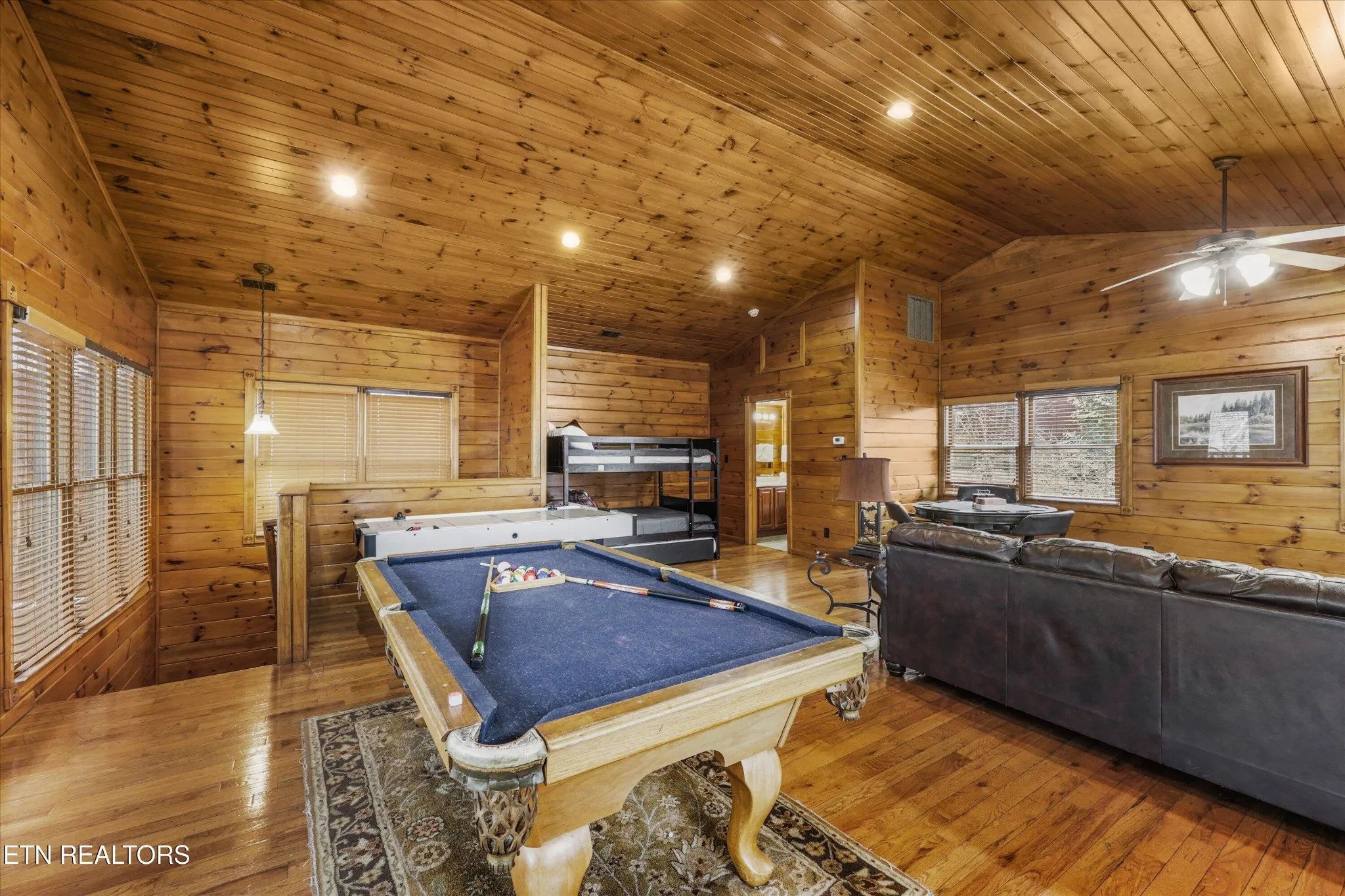 Head upstairs to the top level where entertainment takes center stage. This loft/game room space is designed for fun and memory-making, complete with ample room for games, lounging, and guest enjoyment, plus a fourth full bathroom for added convenience along with the bunks.