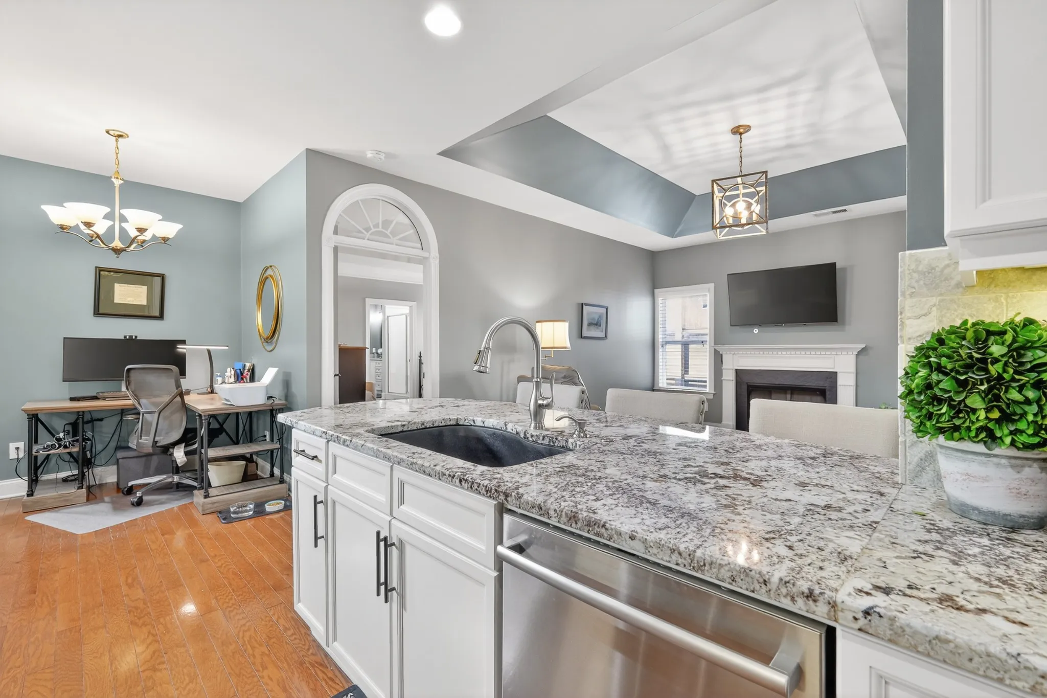 Refined one-story living in the gated Village of Providence, positioned on a premium corner lot directly across from a community park. This beautifully maintained 1,990 sq ft brick home blends timeless design, modern upgrades, and exceptional convenience. Hardwood flooring flows through the main living areas into a bright, elegant kitchen featuring white cabinetry, granite countertops, stainless steel appliances, a new refrigerator and stove, and a Bosch dishwasher. The home offers two spacious bedrooms and two beautifully updated bathrooms with honed quartz countertops, new lighting, and modern fixtures, while the owner’s suite is enhanced by a custom closet shelving system. The two gas fireplaces w/ remotes create inviting living spaces ideal for both comfort and entertaining. Additional highlights include a 2024 water heater and an oversized garage with space for a workshop and storage. HOA-maintained lawn care provides true low-maintenance living.